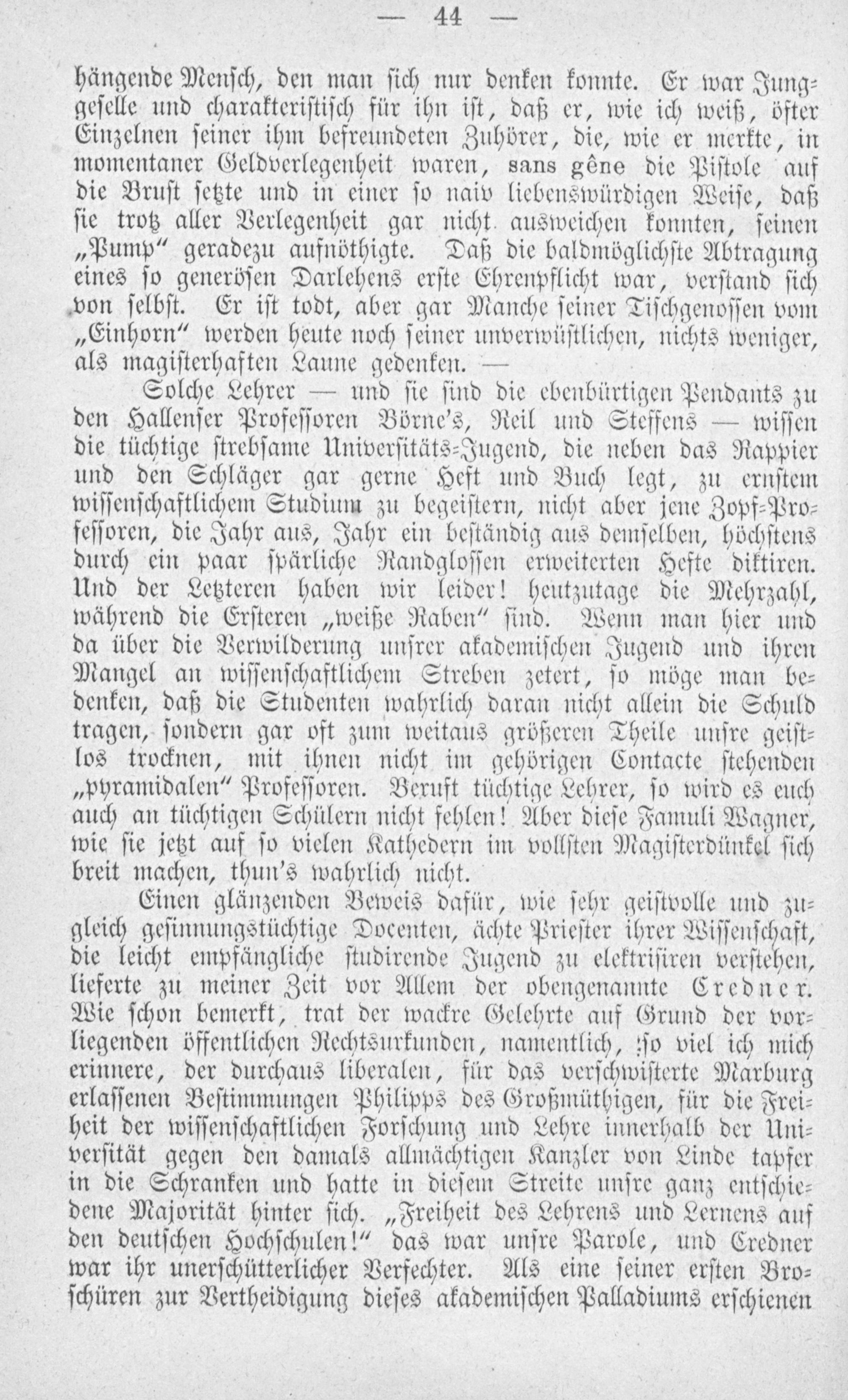 Einen glänzenden Beweis dafür, wie ſehr geiſtvolle und zu⸗ gleich geſinnungstüchtige Docenten, ächte Prieſter ihrer Wiſſenſchaft, die leicht empfängliche ſtudirende Jugend zu elektriſiren Verſtchenr lieferte zu meiner Zeit vor Allem der obengenannte Credner. Wie ſchon bemerkt, trat der wackre Gelehrte auf Grund der vor⸗ liegenden öffentlichen Rechtsurkunden, namentlich, ſo viel ich mich erinnere, der durchaus liberalen, für das verſchwiſterte Marburg erlaſſenen Beſtimmungen Philipps des Großmüthigen, für die Frei⸗ heit der wiſſenſchaftlichen Forſchung und Lehre innerhalb der Uni⸗ verſität gegen den damals allmächtigen Kanzler von Linde tapfer in die Schranken und hatte in dieſem Streite unſre ganz entſchie⸗ dene Majorität hinter ſich.„Freiheit des Lehrens und Lernens auf den deutſchen Hochſchulen!“ das war unſre Parole, und Credner war ihr unerſchütterlicher Verfechter. Als eine ſeiner erſten Bro⸗