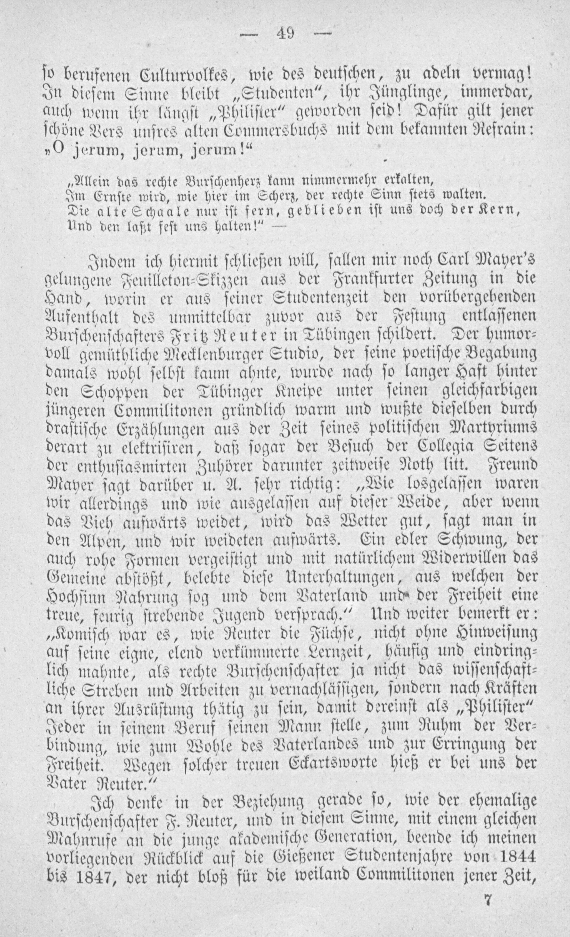 Ich denke in der Beziehung gerade ſo, wie der ehemalige Burſchenſchafter F. Reuter, und in dieſem Sinne, mit einem gleichen Mahnrufe an die junge akademiſche Generation, beende ich meinen vorliegenden Rückblick auf die Gießener Studentenjahre von 1844 bis 1847, der nicht bloß für die weiland Commilitonen jener Zeit,
