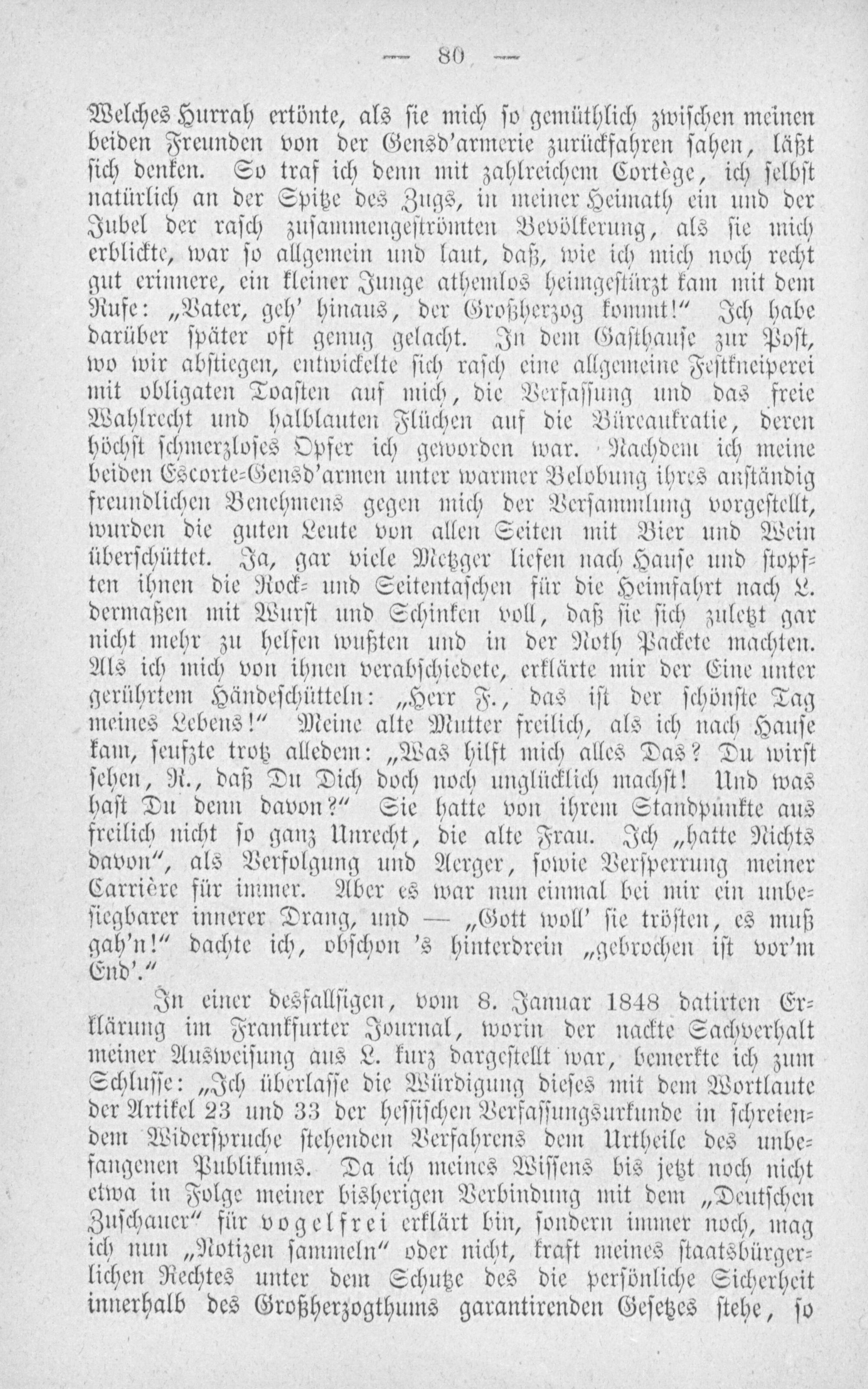 In einer desfallſigen, vom 8. Januar 1848 datirten Er⸗ klärung im Frankfurter Journal, worin der nackte Sachverhalt meiner Ausweiſung aus L. kurz dargeſtellt war, bemerkte ich zum Schluſſe:„Ich überlaſſe die Würdigung dieſes mit dem Wortlaute der Artikel 23 und 33 der heſſiſchen Verfaſſungsurkunde in ſchreien⸗ dem Widerſpruche ſtehenden Verfahrens dem Urtheile des unbe⸗ fangenen Publikums. Da ich meines Wiſſens bis jetzt noch nicht etwa in Folge meiner bisherigen Verbindung mit dem„Deutſchen Zuſchauer“ für vogelfrei erklärt bin, ſondern immer noch, mag ich nun„Notizen ſammeln“ oder nicht, kraft meines ſtaatsbürger⸗ lichen Rechtes unter dem Schutze des die perſönliche Sicherheit innerhalb des Großherzogthums garantirenden Geſetzes ſtehe, ſo