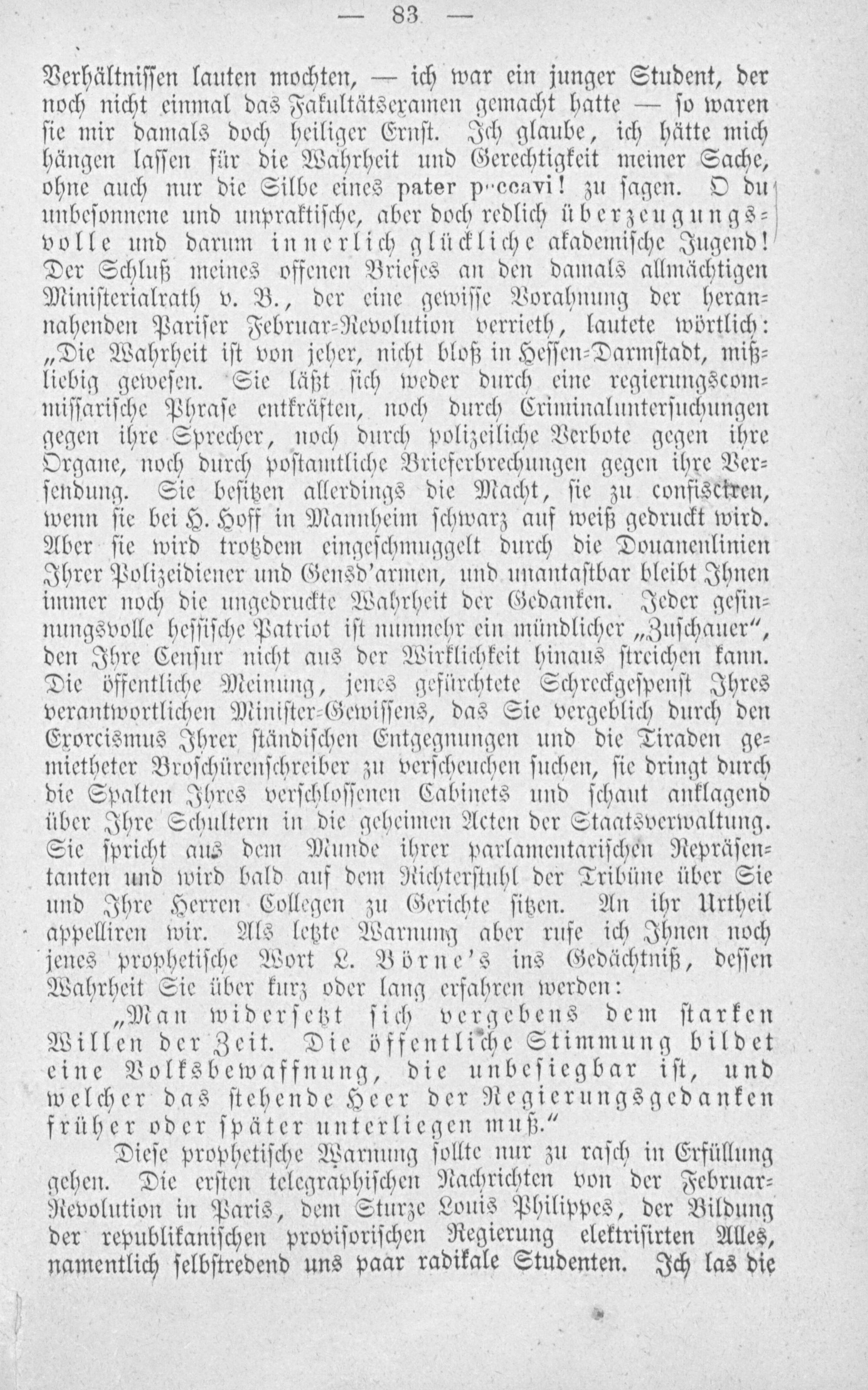 Verhältniſſen lauten mochten,— ich war ein junger Student, der noch nicht einmal das Fakultätsexamen gemacht hatte ſo waren ſie mir damals doch heiliger Ernſt. Ich glaube, ich hätte mich hängen laſſen für die Wahrheit und Gerechtigkeit meiner Sache, ohne auch nur die Silbe eines pater peccavi! zu ſagen. O duf unbeſonnene und unpraktiſche, aber doch redlich überzeugungs⸗ volle und darum innerlich glückliche akademiſche Jugend! Der Schluß meines offenen Briefes an den damals allmächtigen Miniſterialrath v. B., der eine gewiſſe Vorahnung der heran⸗ nahenden Pariſer Februar⸗Revolution verrieth, lautete wörtlich: „Die Wahrheit iſt von jeher, nicht bloß in Heſſen⸗Darmſtadt, miß⸗ liebig geweſen. Sie läßt ſich weder durch eine regierungscom⸗ miſſariſche Phraſe entkräften, noch durch Criminalunterſuchungen gegen ihre Sprecher, noch durch polizeiliche Verbote gegen ihre Organe, noch durch poſtamtliche Brieferbrechungen gegen ihre Ver⸗ ſendung. Sie beſitzen allerdings die Macht, ſie zu confisctren, wenn ſie bei H. Hoff in Mannheim ſchwarz auf weiß gedruckt wird. Aber ſie wird trotzdem eingeſchmuggelt durch die Douanenlinien Ihrer Polizeidiener und Gensd'armen, und unantaſtbar bleibt Ihnen immer noch die ungedruckte Wahrheit der Gedanken. Jeder geſin⸗ nungsvolle heſſiſche Patriot iſt nunmehr ein mündlicher„Zuſchauer“, den Ihre Cenſur nicht aus der Wirklichkeit hinaus ſtreichen kann. Die öffentliche Meinung, jenes gefürchtete Schreckgeſpenſt Ihres verantwortlichen Miniſter⸗Gewiſſens, das Sie vergeblich durch den Exorcismus Ihrer ſtändiſchen Entgegnungen und die Tiraden ge⸗ mietheter Broſchürenſchreiber zu verſcheuchen ſuchen, ſie dringt durch die Spalten Ihres verſchloſſenen Cabinets und ſchaut anklagend über Ihre Schultern in die geheimen Acten der Staatsverwaltung. Sie ſpricht aus dem Munde ihrer parlamentariſchen Repräſen⸗ tanten und wird bald auf dem Richterſtuhl der Tribüne über Sie und Ihre Herren Collegen zu Gerichte ſitzen. An ihr Urtheil appelliren wir. Als letzte Warnung aber rufe ich Ihnen noch jenes prophetiſche Wort L. Börne's ins Gedächtniß, deſſen Wahrheit Sie über kurz oder lang erfahren werden: