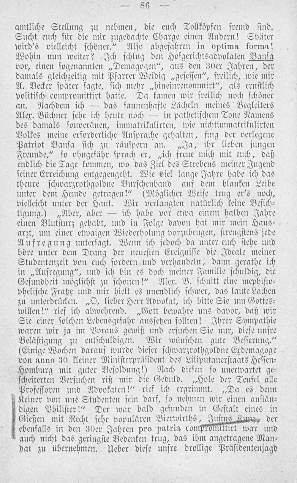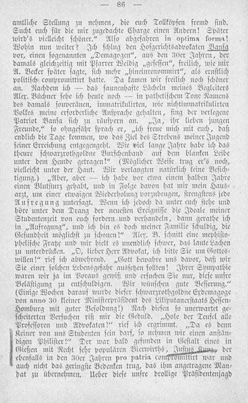 amtliche Stellung zu nehmen, die euch Tollköpfen fremd ſind. Sucht euch für die mir zugedachte Charge einen Andern! Später wird's vielleicht ſchöner.“ Alſo abgefahren in optima forma! Wohin nun weiter? Ich ſchlug den Hofgerichtsadvokaten Banlg vor, einen ſogenannten„Demagogen“, aus den 30er Jahren, der damals gleichzeitig mit Pfarrer Weidig„geſeſſen“, freilich, wie mir A. Becker ſpäter ſagte, ſich mehr„hineinrenommirt“, als ernſtlich politiſch compromittirt hatte. Da kamen wir freilich noch ſchöner an. Nachdem ich— das faunenhafte Lächeln meines Begleiters Alex. Büchner ſehe ich heute noch— in pathetiſchem Tone Namens des damals ſouveränen, immatrikulirten, wie nichtimmatrikulirten Volkes meine erforderliche Anſprache gehalten, fing der verlegene Patriot Banſa ſich zu räuſpern an.„Ja, ihr lieben jungen Freunde,“ ſo ohngefähr ſprach er,„ich freue mich mit euch, daß endlich die Tage kommen, wo das Ziel des Strebens meiner Jugend ſeiner Erreichung entgegengeht. Wie viel lange Jahre habe ich das theure ſchwarzrothgoldne Burſchenband auf dem blanken Leibe unter dem Hemde getragen!“(Möglicher Weiſe trug er's noch, vielleicht unter der Haut. Wir verlangten natürlich keine Beſich⸗ tigung.)„Aber, aber— ich habe vor etwa einem halben Jahre einen Blutſturz gehabt, und in Folge davon hat mir mein Haus⸗ arzt, um einer etwaigen Wiederholung vorzubeugen, ſtrengſtens jede Aufregung unterſagt. Wenn ich jedoch da unter euch ſtehe und höre unter dem Drang der neueſten Ereigniſſe die Ideale meiner Studentenzeit von euch fordern und verhandeln, dann gerathe ich in„Aufregung“, und ich bin es doch meiner Familie ſchuldig, die Geſundheit möglichſt zu ſchonen!“ Alex. B. ſchnitt eine mephiſto⸗ pheliſche Fratze und mir hielt es unendlich ſchwer, das laute Lachen zu unterdrücken.„O, lieber Herr Advokat, ich bitte Sie um Gottes⸗ willen!“ rief ich abwehrend.„Gott bewahre uns davor, daß wir Sie einer ſolchen Lebensgefahr ausſetzen ſollten! Ihrer Sympathie waren wir ja im Voraus gewiß und erſuchen Sie nur, dieſe unſre Beläſtigung zu entſchuldigen. Wir wünſchen gute Beſſerung.“ (Einige Wochen darauf wurde dieſer ſchwarzrothgoldne Exdemagoge von anno 30 kleiner Miniſterpräſident des Liliputanerſtaats Heſſen⸗ Homburg mit guter Beſoldung!) Nach dieſen ſo unerwartet ge⸗ ſcheiterten Verſuchen riß mir die Geduld.„Hole der Teufel alle Profeſſoren und Advokaten!“ rief ich ergrimmt.„Da es denn Keiner von uns Studenten ſein darf, ſo nehmen wir einen anſtän⸗ digen Philiſter!“ Der war bald gefunden in Geſtalt eines in