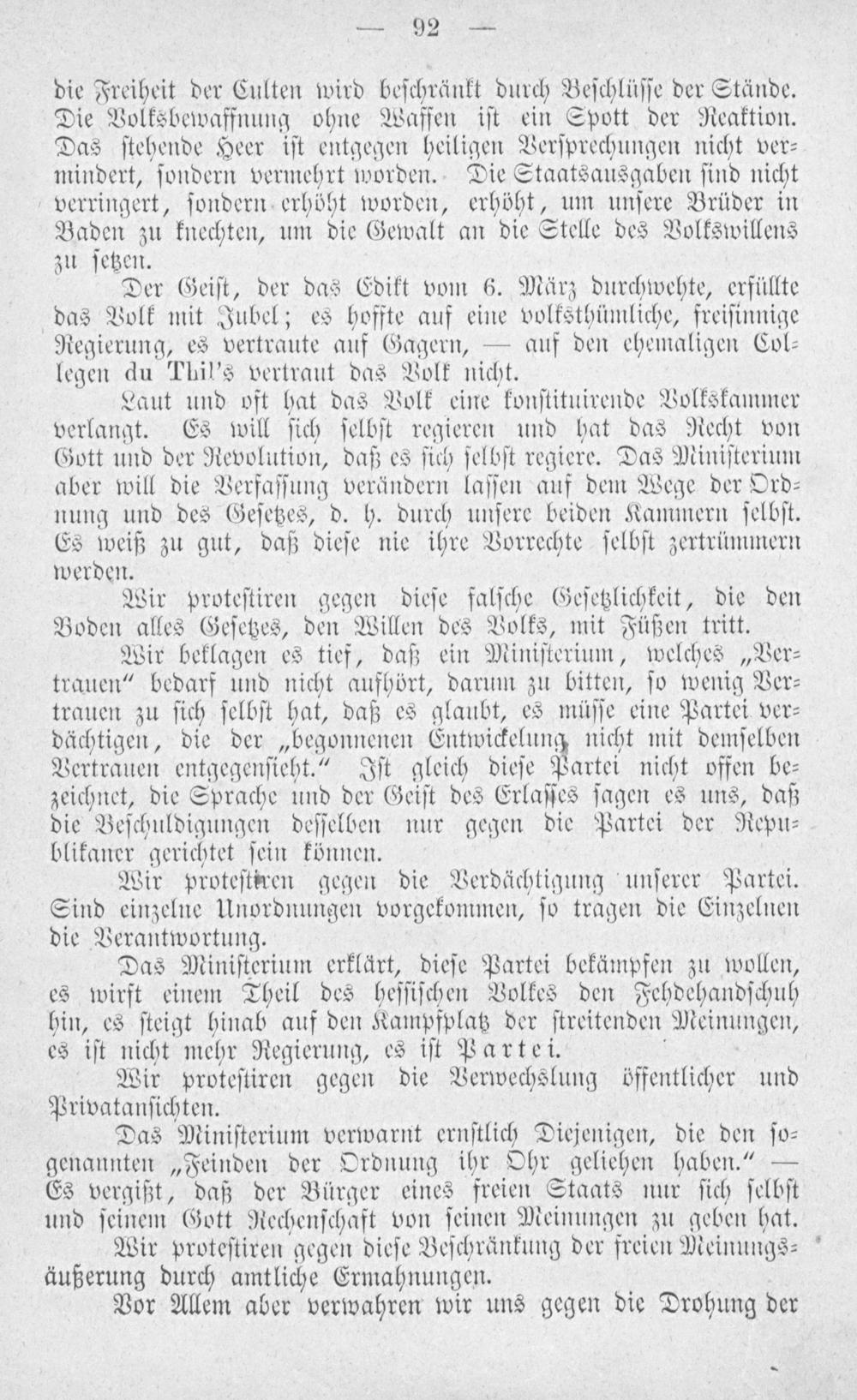 die Freiheit der Culten wird beſchränkt durch Beſchlüſſe der Stände. Die Volksbewaffnung ohne Waffen iſt ein Spott der Reaktion. Das ſtehende Heer iſt entgegen heiligen Verſprechungen nicht ver⸗ mindert, ſondern vermehrt worden. Die Staatsausgaben ſind nicht verringert, ſondern erhöht worden, erhöht, um unſere Brüder in Baden zu knechten, um die Gewalt an die Stelle des Volkswillens zu ſetzen.