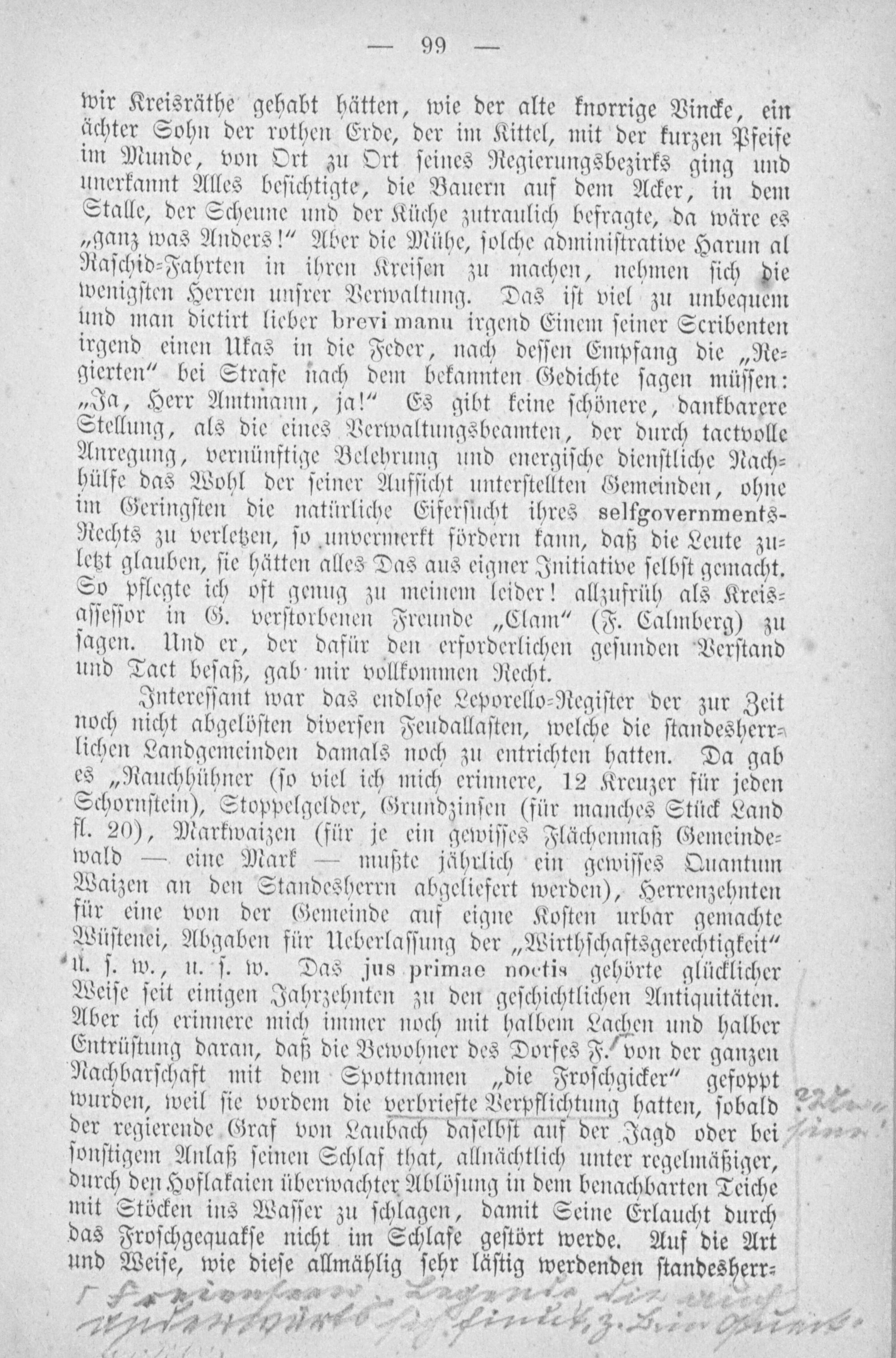 wir Kreisräthe gehabt hätten, wie der alte knorrige Vincke, ein ächter Sohn der rothen Erde, der im Kittel, mit der kurzen Pfeife im Munde, von Ort zu Ort ſeines Regierungsbezirks ging und unerkannt Alles beſichtigte, die Bauern auf dem Acker, in dem Stalle, der Scheune und der Küche zutraulich befragte, da wäre es „ganz was Anders!“ Aber die Mühe, ſolche adminiſtrative Harun al Raſchid⸗Fahrten in ihren Kreiſen zu machen, nehmen ſich die wenigſten Herren unſrer Verwaltung. Das iſt viel zu unbequem und man dictirt lieber brevi manu irgend Einem ſeiner Scribenten irgend einen Ukas in die Feder, nach deſſen Empfang die„Re⸗ gierten“ bei Strafe nach dem bekannten Gedichte ſagen müſſen: „Ja, Herr Amtmann, ja!“ Es gibt keine ſchönere, dankbarere Stellung, als die eines Verwaltungsbeamten, der durch tactvolle Anregung, vernünftige Belehrung und energiſche dienſtliche Nach⸗ hülfe das Wohl der ſeiner Aufſicht unterſtellten Gemeinden, ohne im Geringſten die natürliche Eiferſucht ihres selfgovernments- Rechts zu verletzen, ſo unvermerkt fördern kann, daß die Leute zu⸗ letzt glauben, ſie hätten alles Das aus eigner Initiative ſelbſt gemacht. So pflegte ich oft genug zu meinem leider! allzufrüh als Kreis⸗ aſſeſſor in G. verſtorbenen Freunde„Clam“(F. Calmberg) zu ſagen. Und er, der dafür den erforderlichen geſunden Verſtand und Tact beſaß, gab mir vollkommen Recht.