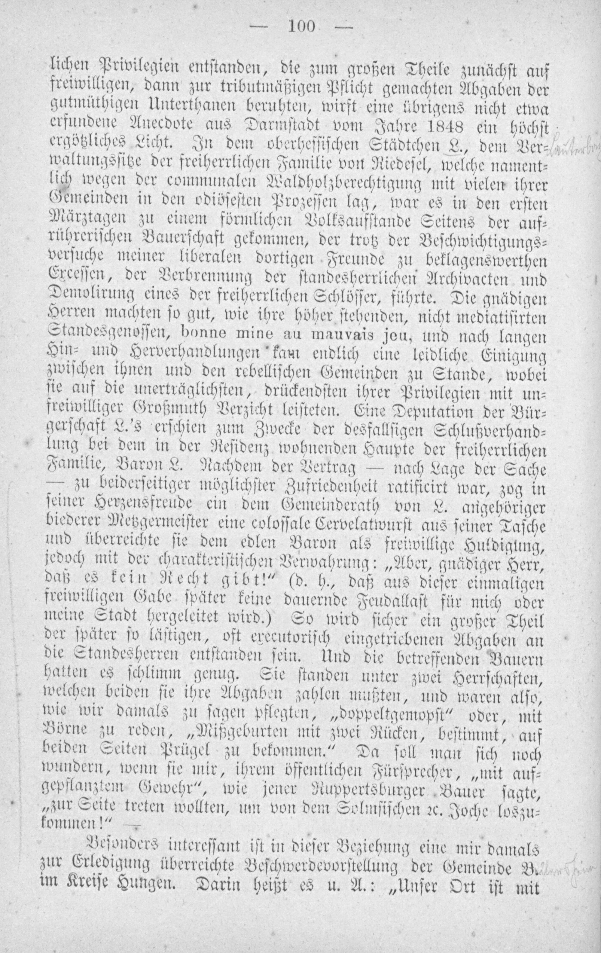 lichen Privilegien entſtanden, die zum großen Theile zunächſt auf freiwilligen, dann zur tributmäßigen Pflicht gemachten Abgaben der gutmüthigen Unterthanen beruhten, wirft eine übrigens nicht etwa erfundene Anecdote aus Darmſtadt vom Jahre 1848 ein höchſt ergötzliches Licht. In dem oberheſſiſchen Städtchen L., dem Ver⸗ waltungsſitze der freiherrlichen Familie von Riedeſel, welche nament⸗ lich wegen der communalen Waldholzberechtigung mit vielen ihrer Gemeinden in den odiböſeſten Prozeſſen lag, war es in den erſten Märztagen zu einem förmlichen Volksaufſtande Seitens der auf⸗ rühreriſchen Bauerſchaft gekommen, der trotz der Beſchwichtigungs⸗ verſuche meiner liberalen dortigen Freunde zu beklagenswerthen Exrceſſen, der Verbrennung der ſtandesherrlichen Archivacten und Demolirung eines der freiherrlichen Schlöſſer, führte. Die gnädigen Herren machten ſo gut, wie ihre höher ſtehenden, nicht mediatiſirten Standesgenoſſen, bonne mine au mauvais jeu, und nach langen Hin⸗ und Herverhandlungen kam endlich eine leidliche Einigung zwiſchen ihnen und den rebelliſchen Gemeinden zu Stande, wobei ſie auf die unerträglichſten, drückendſten ihrer Privilegien mit un⸗ freiwilliger Großmuth Verzicht leiſteten. Eine Deputation der Bür⸗ gerſchaft L.s erſchien zum Zwecke der desfallſigen Schlußverhand⸗ lung bei dem in der Reſidenz wohnenden Haupte der freiherrlichen Familie, Baron L. Nachdem der Vertrag— nach Lage der Sache — zu beiderſeitiger möglichſter Zufriedenheit ratificirt war, zog in ſeiner Herzensfreude ein dem Gemeinderath von L. angehöriger biederer Metzgermeiſter eine coloſſale Cervelatwurſt aus ſeiner Taſche und überreichte ſie dem edlen Baron als freiwillige Huldigung, jedoch mit der charakteriſtiſchen Verwahrung:„Aber, gnädiger Herr, daß es kein Recht gibt!“(d. h., daß aus dieſer einmaligen freiwilligen Gabe ſpäter keine dauernde Feudallaſt für mich oder meine Stadt hergeleitet wird.) So wird ſicher ein großer Theil der ſpäter ſo läſtigen, oft erecutoriſch eingetriebenen Abgaben an die Standesherren entſtanden ſein. Und die betreffenden Bauern hatten es ſchlimm genug. Sie ſtanden unter zwei Herrſchaften, welchen beiden ſie ihre Abgaben zahlen mußten, und waren alſo, wie wir damals zu ſagen pflegten,„doppeltgemopſt“ oder, mit Börne zu reden,„Mißgeburten mit zwei Rücken, beſtimmt, auf beiden Seiten Prügel zu bekommen.“ Da ſoll man ſich noch wundern, wenn ſie mir, ihrem öffentlichen Fürſprecher,„mit auf⸗ gepflanztem Gewehr“, wie jener Ruppertsburger Bauer ſagte, „zur Seite treten wollten, um von dem Solmſiſchen ꝛc. Joche loszu⸗ kommen!“—..