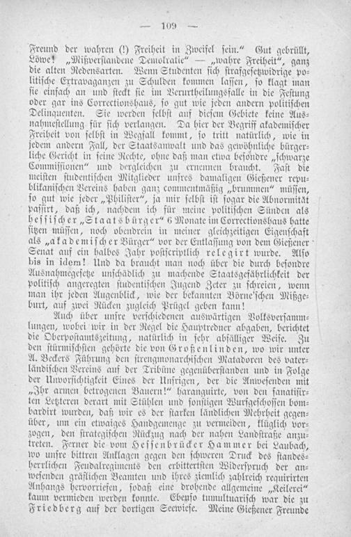 Freund der wahren() Freiheit in Zweifel ſein.“ Gut gebrüllt, Löwe!„Mißverſtandene Demokratie“—„wahre Freiheit“, ganz die alten Redensarten. Wenn Studenten ſich ſtrafgeſetzwidrige po⸗ litiſche Ertravaganzen zu Schulden kommen laſſen, ſo klagt man ſie einfach an und ſteckt ſie im Verurtheilungsfalle in die Feſtung oder gar ins Correctionshaus, ſo gut wie jeden andern politiſchen Delinquenten. Sie werden ſelbſt auf dieſem Gebiete keine Aus⸗ nahmeſtellung für ſich verlangen. Da hier der Begriff akademiſcher Freiheit von ſelbſt in Wegſall kommt, ſo tritt natürlich, wie in jedem andern Fall, der Staatsanwalt und das gewöhnliche bürger⸗ liche Gericht in ſeine Rechte, ohne daß man etwa beſondre„ſchwarze Commiſſionen“ und dergleichen zu ernennen braucht. Faſt die meiſten ſtudentiſchen Mitglieder unſres damaligen Gießener repu⸗ blikaniſchen Vereins haben ganz commentmäßig„brummen“ müſſen, ſo gut wie jeder„Philiſter“, ja mir ſelbſt iſt ſogar die Abnormität paſſirt, daß ich, nachdem ich für meine politiſchen Sünden als heſſiſcher„Staatsbürger“ 6 Monate im Correctionshaus hatte ſitzen müſſen, noch obendrein in meiner gleichzeitigen Eigenſchaft als„akademiſcher Bürger“ vor der Entlaſſung von dem Gießener Senat auf ein halbes Jahr poſtſcriptlich relegirt wurde. Alſo bis in idem! Und da braucht man noch über die durch beſondre Ausnahmegeſetze unſchädlich zu machende Staatsgefährlichkeit der politiſch angeregten ſtudentiſchen Jugend Zeter zu ſchreien, wenn man ihr jeden Augenblick, wie der bekannten Börne'ſchen Mißge⸗ burt, auf zwei Rücken zugleich Prügel geben kann!
