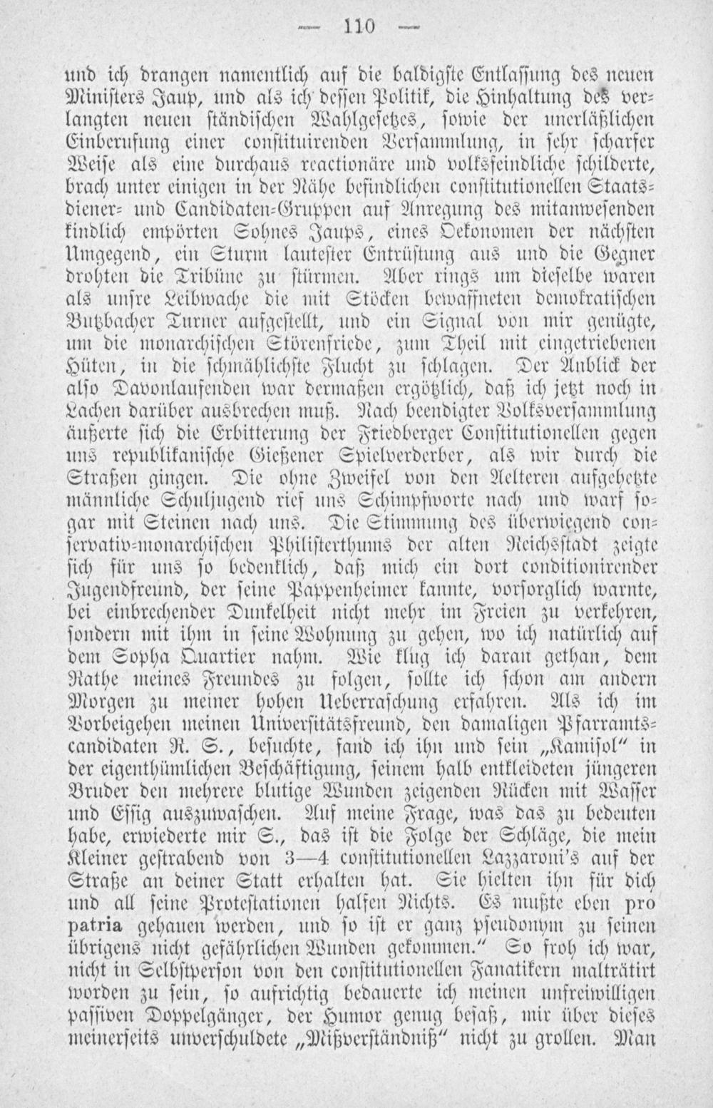 und ich drangen namentlich auf die baldigſte Entlaſſung des neuen Miniſters Jaup, und als ich deſſen Politik, die Hinhaltung des ver⸗ langten neuen ſtändiſchen Wahlgeſetzes, ſowie der unerläßlichen Einberufung einer conſtituirenden Verſammlung, in ſehr ſcharfer Weiſe als eine durchaus reactionäre und volksfeindliche ſchilderte, brach unter einigen in der Nähe befindlichen conſtitutionellen Staats⸗ diener⸗ und Candidaten⸗Gruppen auf Anregung des mitanweſenden kindlich empörten Sohnes Jaups, eines Oekonomen der nächſten Umgegend, ein Sturm lauteſter Entrüſtung aus und die Gegner drohten die Tribüne zu ſtürmen. Aber rings um dieſelbe waren als unſre Leibwache die mit Stöcken bewaffneten demokratiſchen Butzbacher Turner aufgeſtellt, und ein Signal von mir genügte, um die monarchiſchen Störenfriede, zum Theil mit eingetriebenen Hüten, in die ſchmählichſte Flucht zu ſchlagen. Der Anblick der alſo Davonlaufenden war dermaßen ergötzlich, daß ich jetzt noch in Lachen darüber ausbrechen muß. Nach beendigter Volksverſammlung äußerte ſich die Erbitterung der Friedberger Conſtitutionellen gegen uns republikaniſche Gießener Spielverderber, als wir durch die Straßen gingen. Die ohne Zweifel von den Aelteren aufgehetzte männliche Schuljugend rief uns Schimpfworte nach und warf ſo⸗ gar mit Steinen nach uns. Die Stimmung des überwiegend con⸗ ſervativ⸗monarchiſchen Philiſterthums der alten Reichsſtadt zeigte ſich für uns ſo bedenklich, daß mich ein dort conditionirender Jugendfreund, der ſeine Pappenheimer kannte, vorſorglich warnte, bei einbrechender Dunkelheit nicht mehr im Freien zu verkehren, ſondern mit ihm in ſeine Wohnung zu gehen, wo ich natürlich auf dem Sopha Quartier nahm. Wie klug ich daran gethan, dem Rathe meines Freundes zu folgen, ſollte ich ſchon am andern Morgen zu meiner hohen Ueberraſchung erfahren. Als ich im Vorbeigehen meinen Univerſitätsfreund, den damaligen Pfarramts⸗ candidaten R. S., beſuchte, fand ich ihn und ſein„Kamiſol“ in der eigenthümlichen Beſchäftigung, ſeinem halb entkleideten jüngeren Bruder den mehrere blutige Wunden zeigenden Rücken mit Waſſer und Eſſig auszuwaſchen. Auf meine Frage, was das zu bedeuten habe, erwiederte mir S., das iſt die Folge der Schläge, die mein Kleiner geſtrabend von 3—4 conſtitutionellen Lazzaroni's auf der Straße an deiner Statt erhalten hat. Sie hielten ihn für dich und all ſeine Proteſtationen halfen Nichts. Es mußte eben pro patria gehauen werden, und ſo iſt er ganz pſeudonym zu ſeinen übrigens nicht gefährlichen Wunden gekommen.“ So froh ich war, nicht in Selbſtperſon von den conſtitutionellen Fanatikern malträtirt worden zu ſein, ſo aufrichtig bedauerte ich meinen unfreiwilligen paſſiven Doppelgänger, der Humor genug beſaß, mir über dieſes meinerſeits unverſchuldete„Mißverſtändniß“ nicht zu grollen. Man