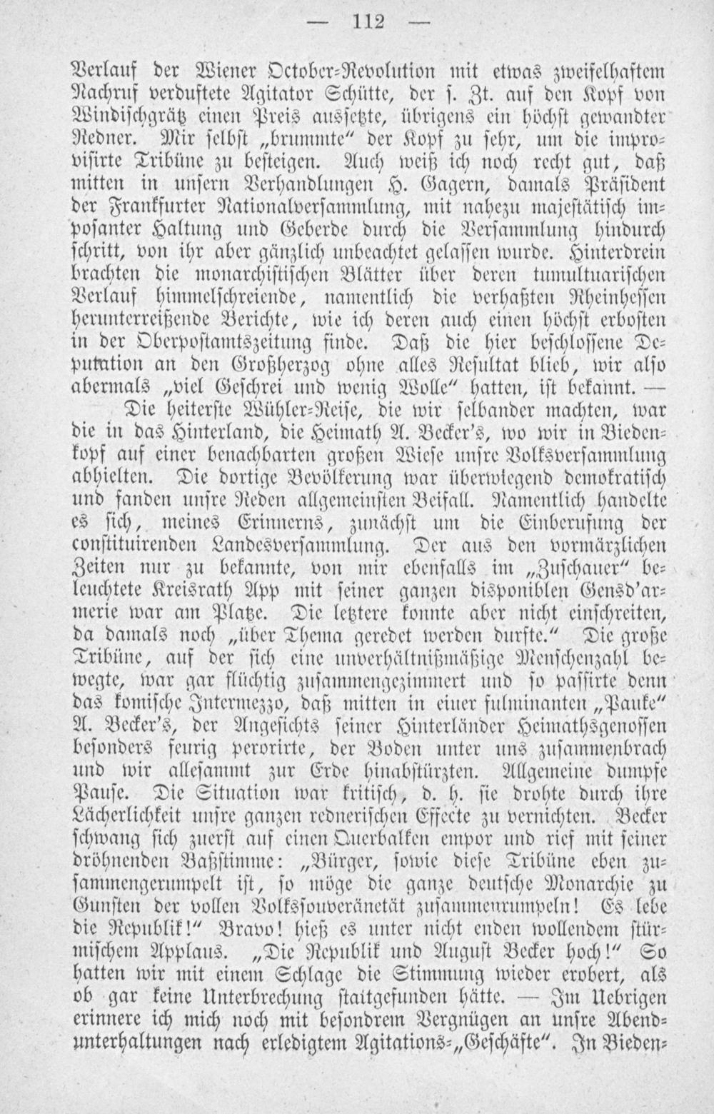 Verlauf der Wiener October⸗Revolution mit etwas zweifelhaftem Nachruf verduftete Agitator Schütte, der ſ. Zt. auf den Kopf von Windiſchgrätz einen Preis ausſetzte, übrigens ein höchſt gewandter Redner. Mir ſelbſt„brummte“ der Kopf zu ſehr, um die impro⸗ viſirte Tribüne zu beſteigen. Auch weiß ich noch recht gut, daß mitten in unſern Verhandlungen H. Gagern, damals Präſident der Frankfurter Nationalverſammlung, mit nahezu majeſtätiſch im⸗ poſanter Haltung und Geberde durch die Verſammlung hindurch ſchritt, von ihr aber gänzlich unbeachtet gelaſſen wurde. Hinterdrein brachten die monarchiſtiſchen Blätter über deren tumultuariſchen Verlauf himmelſchreiende, namentlich die verhaßten Rheinheſſen herunterreißende Berichte, wie ich deren auch einen höchſt erboſten in der Oberpoſtamtszeitung finde. Daß die hier beſchloſſene De⸗ putation an den Großherzog ohne alles Reſultat blieb, wir alſo abermals„viel Geſchrei und wenig Wolle“ hatten, iſt bekannt.—
