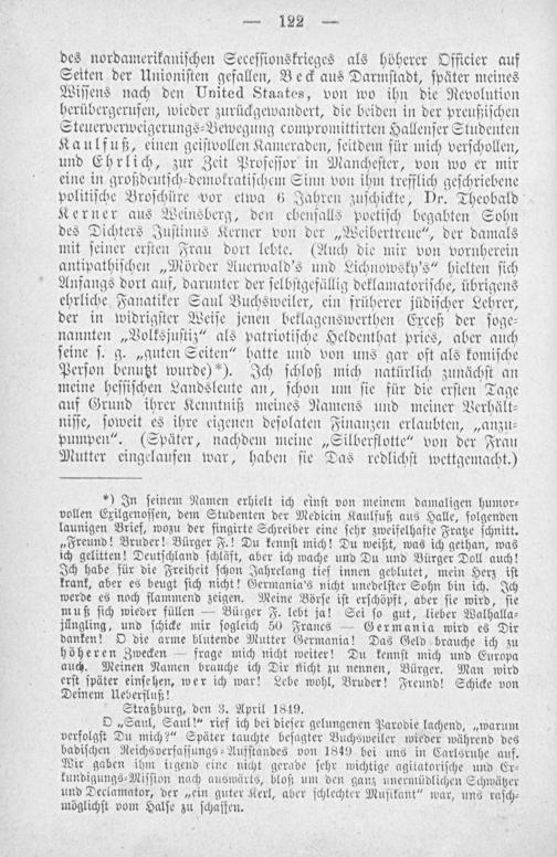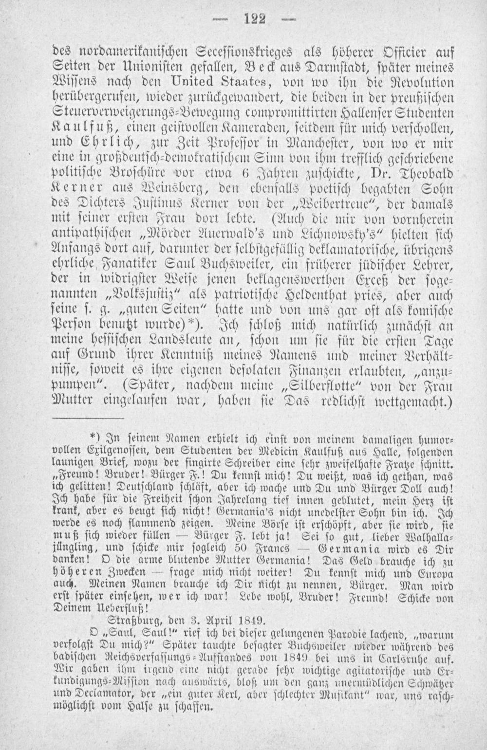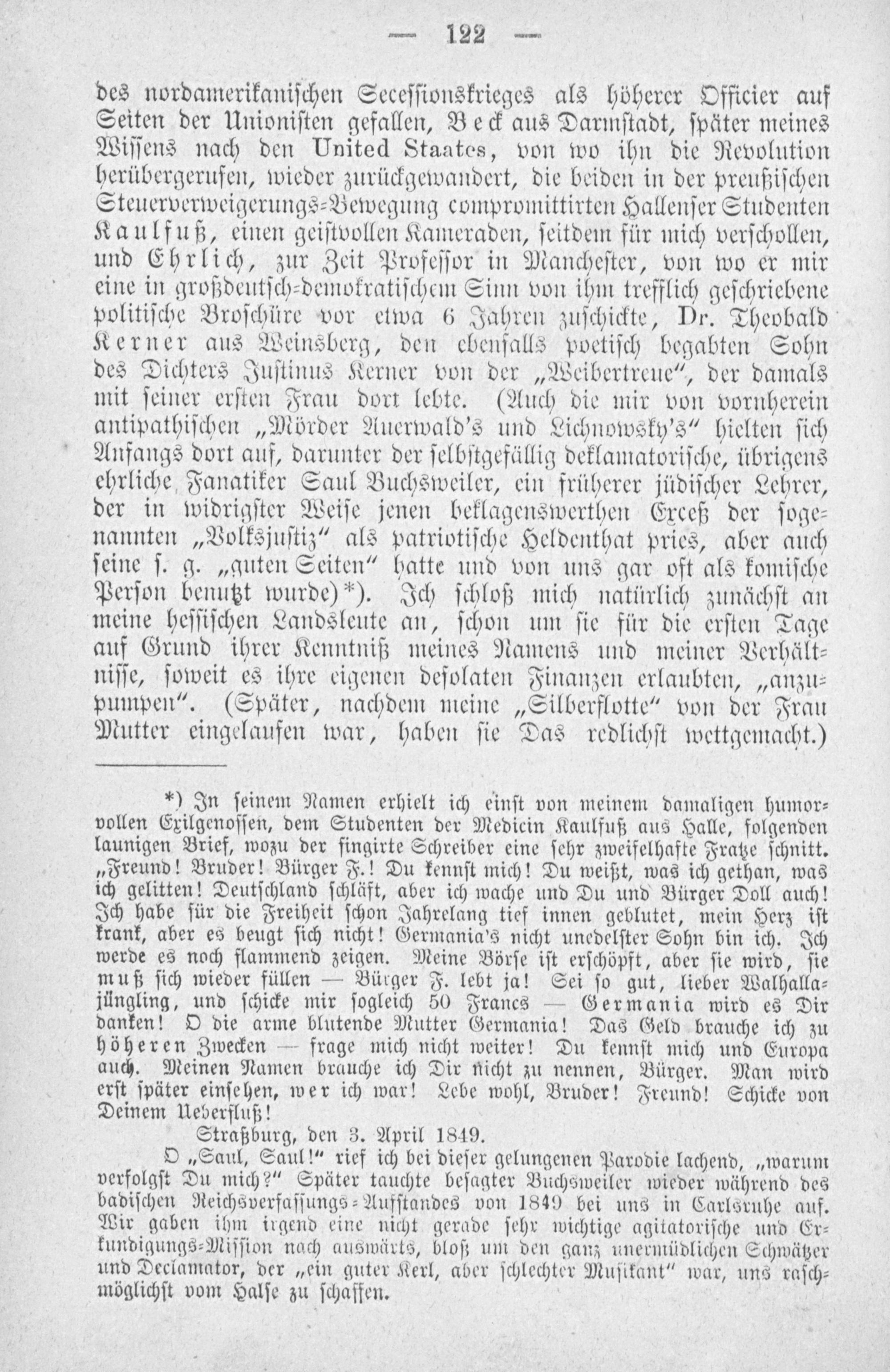 des nordamerikaniſchen Seceſſionskrieges als höherer Officier auf Seiten der Unioniſten gefallen, Beck aus Darmſtadt, ſpäter meines Wiſſens nach den United Staates, von wo ihn die Revolution herübergerufen, wieder zurückgewandert, die beiden in der preußiſchen Steuerverweigerungs⸗Bewegung compromittirten Hallenſer Studenten Kaulfuß, einen geiſtvollen Kameraden, ſeitdem für mich verſchollen, und Ehrlich, zur Zeit Profeſſor in Mancheſter, von wo er mir eine in großdeutſch⸗demokratiſchem Sinn von ihm trefflich geſchriebene politiſche Broſchüre vor etwa 6 Jahren zuſchickte, Dr. Theobald Kerner aus Weinsberg, den ebenſalls poetiſch begabten Sohn des Dichters Juſtinus Kerner von der„Weibertreue“, der damals mit ſeiner erſten Frau dort lebte.(Auch die mir von vornherein antipathiſchen„Mörder Auerwald's und Lichnowsky’s“ hielten ſich Anfangs dort auf, darunter der ſelbſtgefällig deklamatoriſche, übrigens ehrliche Fanatiker Saul Buchsweiler, ein früherer jüdiſcher Lehrer, der in widrigſter Weiſe jenen beklagenswerthen Exceß der ſoge⸗ nannten„Volksjuſtiz“ als patriotiſche Heldenthat pries, aber auch ſeine ſ. g.„guten Seiten“ hatte und von uns gar oft als komiſche Perſon benutzt wurde)*). Ich ſchloß mich natürlich zunächſt an meine heſſiſchen Landsleute an, ſchon um ſie für die erſten Tage auf Grund ihrer Kenntniß meines Namens und meiner Verhält⸗ niſſe, ſoweit es ihre eigenen deſolaten Finanzen erlaubten,„anzu⸗ pumpen“.(Später, nachdem meine„Silberflotte“ von der Frau Mutter eingelaufen war, haben ſie Das redlichſt wettgemacht.)