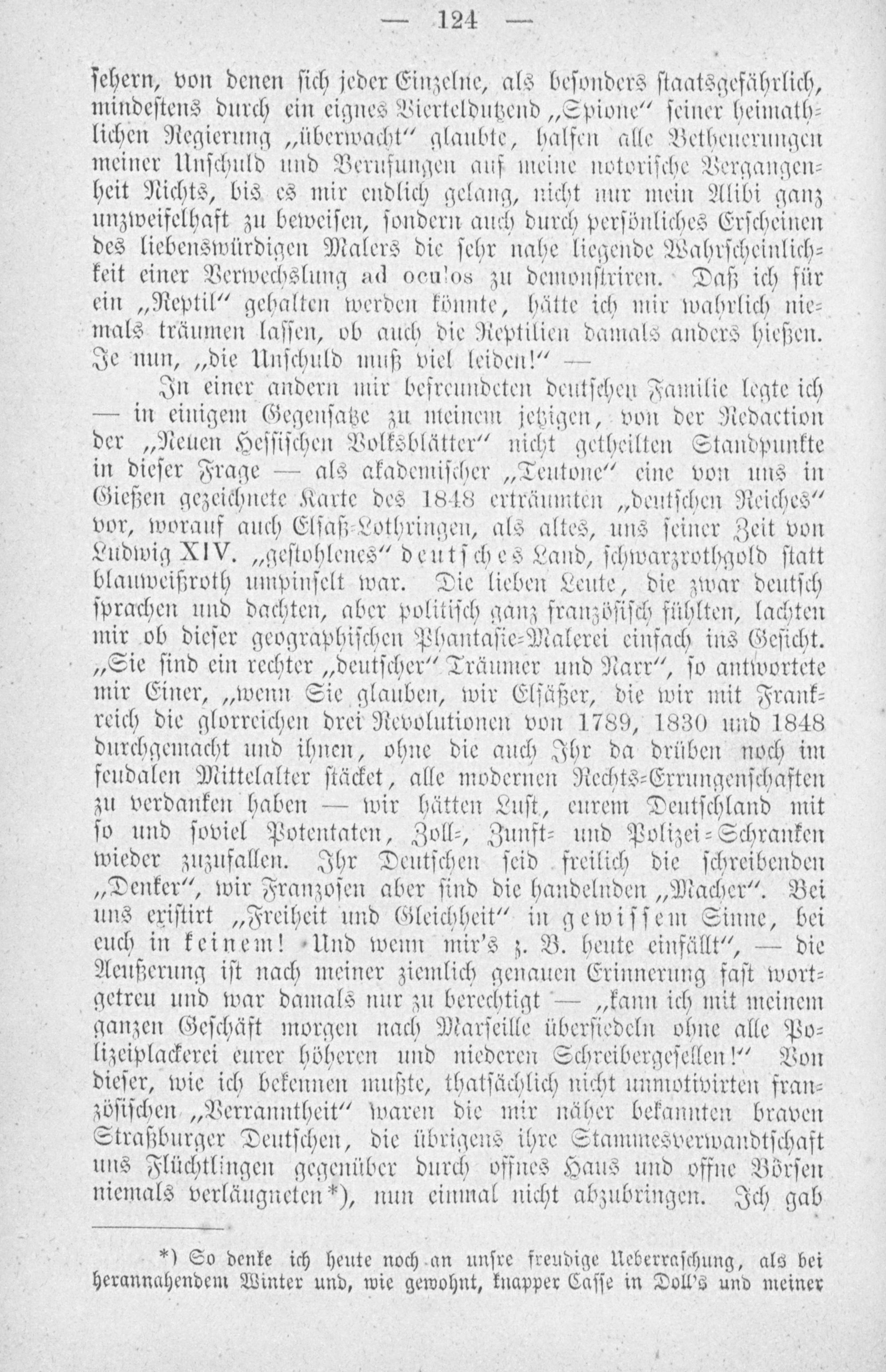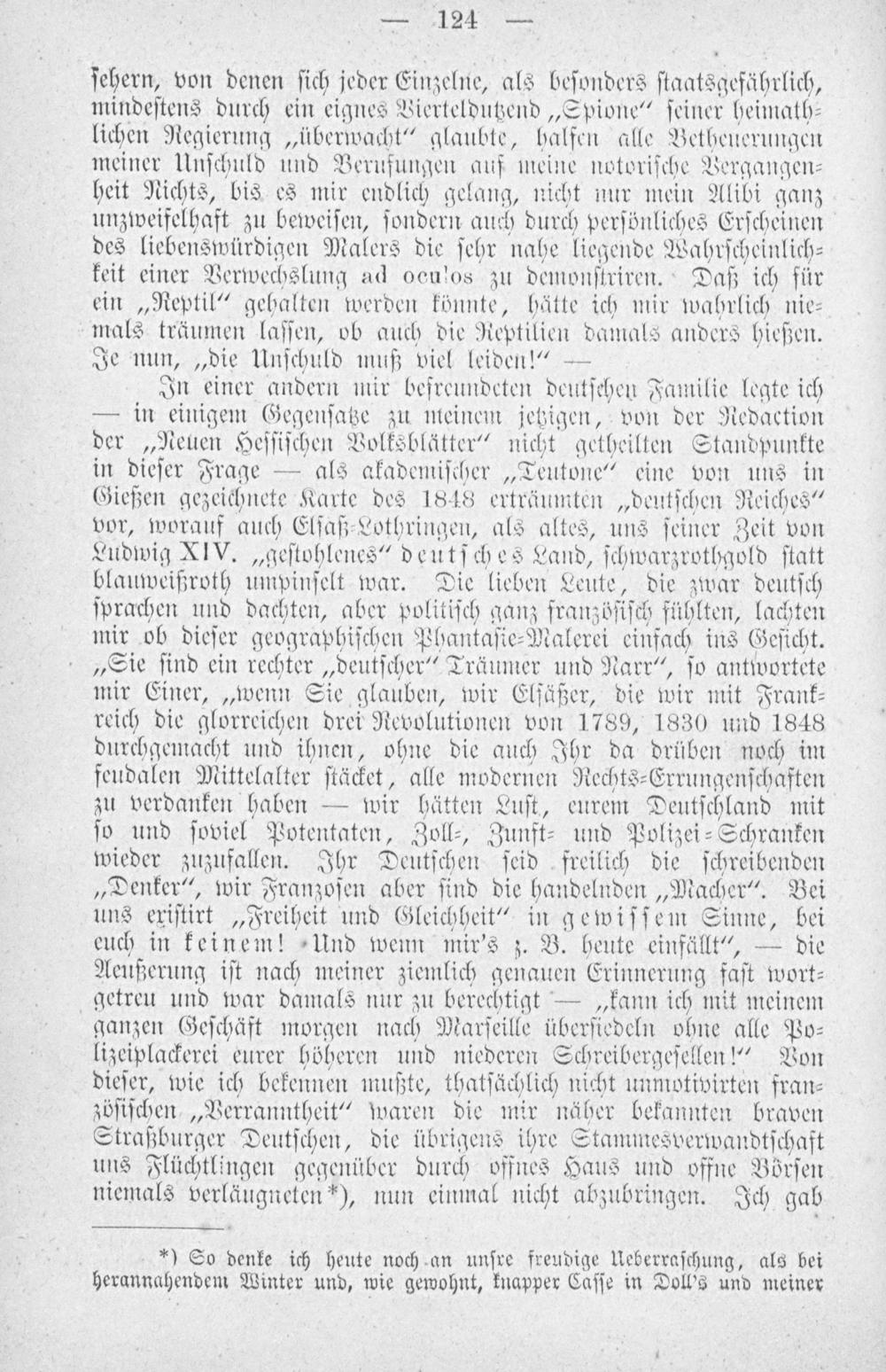In einer andern mir befreundeten deutſchen Familie legte ich — in einigem Gegenſatze zu meinem jetzigen, von der Redaction der„Neuen Heſſiſchen Volksblätter“ nicht getheilten Standpunkte in dieſer Frage— als akademiſcher„Teutone“ eine von uns in Gießen gezeichnete Karte des 1848 erträumten„deutſchen Reiches“ vor, worauf auch Elſaß⸗Lothringen, als altes, uns ſeiner Zeit von Ludwig XIV.„geſtohlenes“ deutſches Land, ſchwarzrothgold ſtatt blauweißroth umpinſelt war. Die lieben Leute, die zwar deutſch ſprachen und dachten, aber politiſch ganz franzöſiſch fühlten, lachten mir ob dieſer geographiſchen Phantaſie⸗Malerei einfach ins Geſicht. „Sie ſind ein rechter„deutſcher“ Träumer und Narr“, ſo antwortete mir Einer,„wenn Sie glauben, wir Elſäßer, die wir mit Frank⸗ reich die glorreichen drei Revolutionen von 1789, 1830 und 1848 durchgemacht und ihnen, ohne die auch Ihr da drüben noch im feudalen Mittelalter ſtäcket, alle modernen Rechts⸗Errungenſchaften zu verdanken haben— wir hätten Luſt, eurem Deutſchland mit ſo und ſoviel Potentaten, Zoll⸗, Zunft⸗ und Polizei⸗Schranken wieder zuzufallen. Ihr Deutſchen ſeid freilich die ſchreibenden „Denker“, wir Franzoſen aber ſind die handelnden„Macher“. Bei uns exiſtirt„Freiheit und Gleichheit“ in gewiſſem Sinne, bei euch in keinem! Und wenn mir's z. B. heute einfällt“,— die Aeußerung iſt nach meiner ziemlich genauen Erinnerung faſt wort⸗ getreu und war damals nur zu berechtigt—„kann ich mit meinem ganzen Geſchäft morgen nach Marſeille überſiedeln ohne alle Po⸗ lizeiplackerei eurer höheren und niederen Schreibergeſellen!“ Von dieſer, wie ich bekennen mußte, thatſächlich nicht unmotivirten fran⸗ zöſiſchen„Verranntheit“ waren die mir näher bekannten braven Straßburger Deutſchen, die übrigens ihre Stammesverwandtſchaft uns Flüchtlingen gegenüber durch offnes Haus und offne Börſen niemals verläugneten*), nun einmal nicht abzubringen. Ich gab
