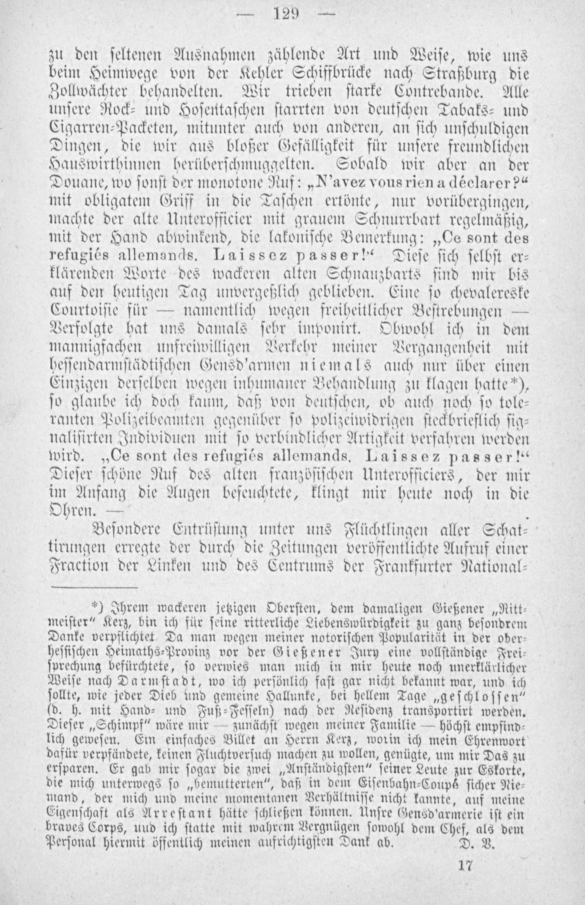 zu den ſeltenen Ausnahmen zählende Art und Weiſe, wie uns beim Heimwege von der Kehler Schiffbrücke nach Straßburg die Zollwächter behandelten. Wir trieben ſtarke Contrebande. Alle unſere Rock⸗ und Hoſentaſchen ſtarrten von deutſchen Tabaks⸗ und Cigarren⸗Packeten, mitunter auch von anderen, an ſich unſchuldigen Dingen, die wir aus bloßer Gefälligkeit für unſere freundlichen Hauswirthinnen herüberſchmuggelten. Sobald wir aber an der Douane, wo ſonſt der monotone Ruf:„N'avez vous rien a déclarer?“ mit obligatem Griff in die Taſchen ertönte, nur vorübergingen, machte der alte Unterofficier mit grauem Schnurrbart regelmäßig, mit der Hand abwinkend, die lakoniſche Bemerkung:„Ce sont des refugiés allemands. Laissez passer!“ Dieſe ſich ſelbſt er⸗ klärenden Worte des wackeren alten Schnauzbarts ſind mir bis auf den heutigen Tag unvergeßlich geblieben. Eine ſo chevalereske Courtoiſie für— namentlich wegen freiheitlicher Beſtrebungen— Verfolgte hat uns damals ſehr imponirt. Obwohl ich in dem mannigfachen unfreiwilligen Verkehr meiner Vergangenheit mit heſſendarmſtädtiſchen Gensd'armen niemals auch nur über einen Einzigen derſelben wegen inhumaner Behandlung zu klagen hatte*), ſo glaube ich doch kaum, daß von deutſchen, ob auch noch ſo tole⸗ ranten Polizeibeamten gegenüber ſo polizeiwidrigen ſteckbrieflich ſig⸗ naliſirten Individuen mit ſo verbindlicher Artigkeit verfahren werden wird.„Ce sont des refugiés allemands. Laissez passer!“ Dieſer ſchöne Ruf des alten franzöſiſchen Unterofficiers, der mir im Anfang die Augen befeuchtete, klingt mir heute noch in die Ohren.—.
