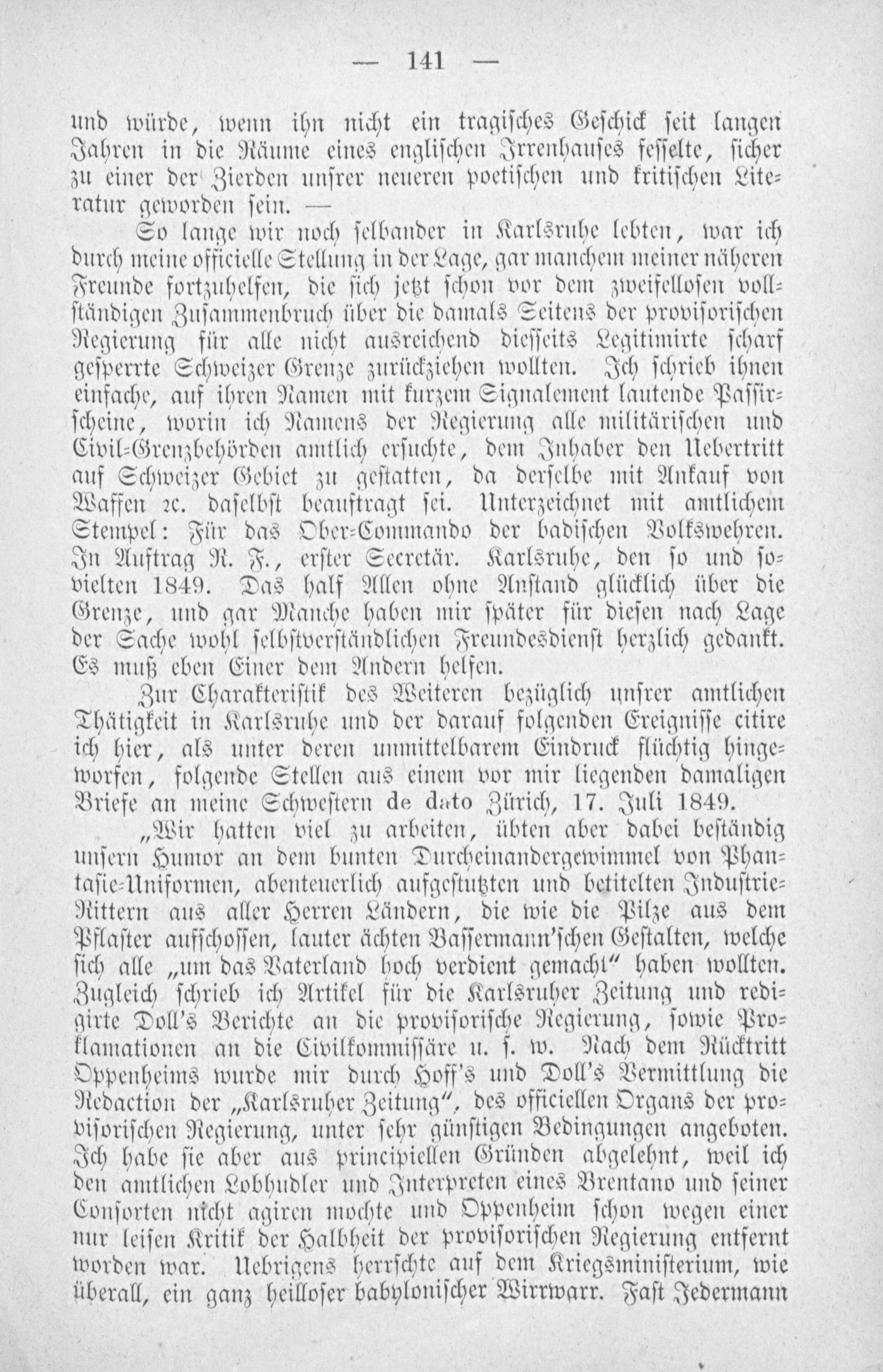 So lange wir noch ſelbander in Karlsruhe lebten, war ich durch meine officielle Stellung in der Lage, gar manchem meiner näheren Freunde fortzuhelfen, die ſich jetzt ſchon vor dem zweifelloſen voll⸗ ſtändigen Zuſammenbruch über die damals Seitens der proviſoriſchen Regierung für alle nicht ausreichend dieſſeits Legitimirte ſcharf geſperrte Schweizer Grenze zurückziehen wollten. Ich ſchrieb ihnen einfache, auf ihren Namen mit kurzem Signalement lautende Paſſir⸗ ſcheine, worin ich Namens der Regierung alle militäriſchen und Civil⸗Grenzbehörden amtlich erſuchte, dem Inhaber den Uebertritt auf Schweizer Gebiet zu geſtatten, da derſelbe mit Ankauf von Waffen ꝛc. daſelbſt beauftragt ſei. Unterzeichnet mit amtlichem Stempel: Für das Ober⸗Commando der badiſchen Volkswehren. In Auftrag R. F., erſter Secretär. Karlsruhe, den ſo und ſo⸗ vielten 1849. Das half Allen ohne Anſtand glücklich über die Grenze, und gar Manche haben mir ſpäter für dieſen nach Lage der Sache wohl ſelbſtverſtändlichen Freundesdienſt herzlich gedankt. Es muß eben Einer dem Andern helfen.