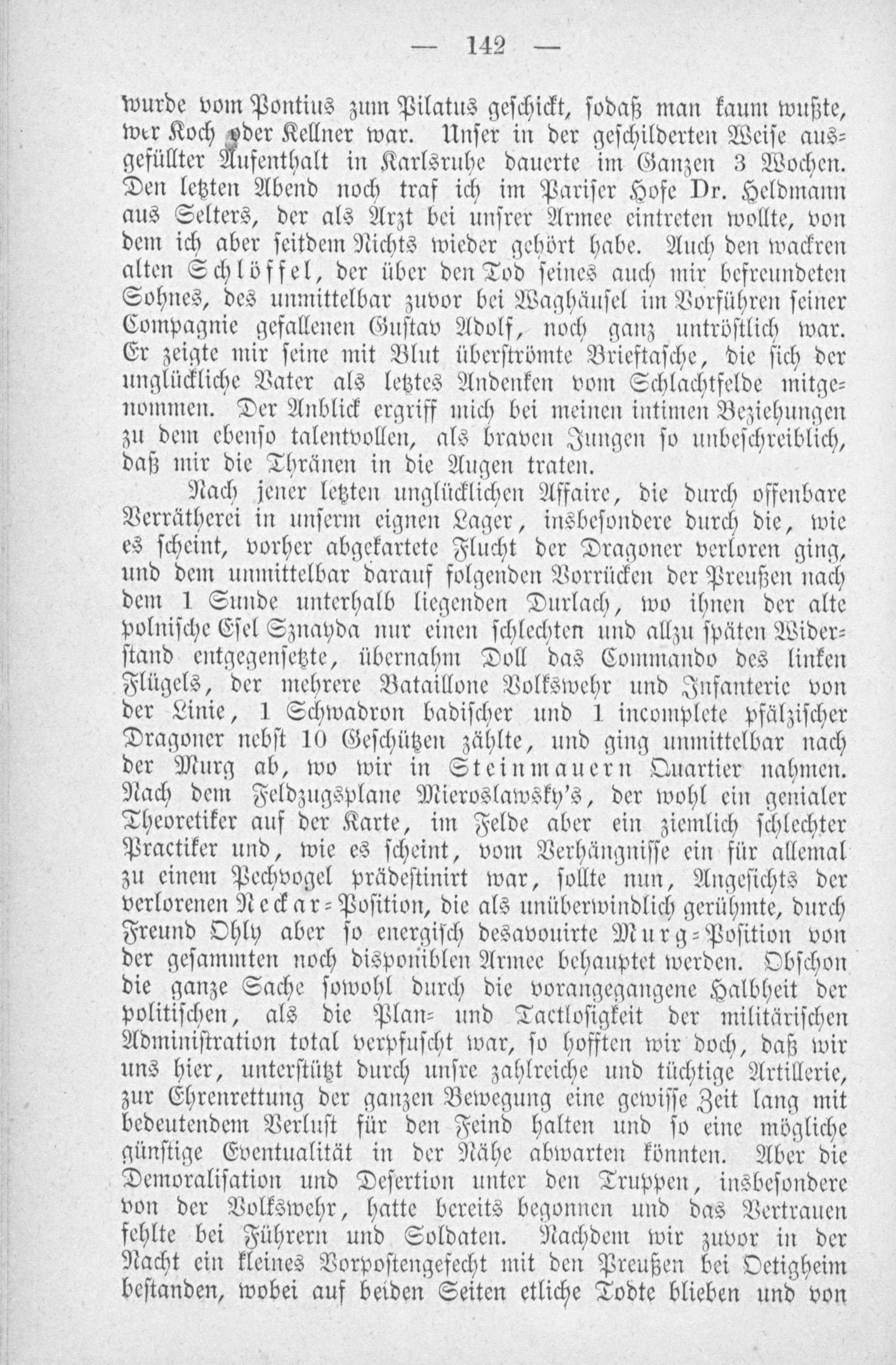 Nach jener letzten unglücklichen Affaire, die durch offenbare Verrätherei in unſerm eignen Lager, insbeſondere durch die, wie es ſcheint, vorher abgekartete Flucht der Dragoner verloren ging, und dem unmittelbar darauf folgenden Vorrücken der Preußen nach dem 1 Sunde unterhalb liegenden Durlach, wo ihnen der alte polniſche Eſel Sznayda nur einen ſchlechten und allzu ſpäten Wider⸗ ſtand entgegenſetzte, übernahm Doll das Commando des linken Flügels, der mehrere Bataillone Volkswehr und Infanterie von der Linie, 1 Schwadron badiſcher und 1 incomplete pfälziſcher Dragoner nebſt 10 Geſchützen zählte, und ging unmittelbar nach der Murg ab, wo wir in Steinmauern Quartier nahmen. Nach dem Feldzugsplane Mieroslawsky's, der wohl ein genialer Theoretiker auf der Karte, im Felde aber ein ziemlich ſchlechter Practiker und, wie es ſcheint, vom Verhängniſſe ein für allemal zu einem Pechvogel prädeſtinirt war, ſollte nun, Angeſichts der verlorenen Neckar⸗Poſition, die als unüberwindlich gerühmte, durch Freund Ohly aber ſo energiſch desavouirte MNurg⸗Poſition von der geſammten noch disponiblen Armee behauptet werden. Obſchon die ganze Sache ſowohl durch die vorangegangene Halbheit der politiſchen, als die Plan⸗ und Tactloſigkeit der militäriſchen Adminiſtration total verpfuſcht war, ſo hofften wir doch, daß wir uns hier, unterſtützt durch unſre zahlreiche und tüchtige Artillerie, zur Ehrenrettung der ganzen Bewegung eine gewiſſe Zeit lang mit bedeutendem Verluſt für den Feind halten und ſo eine mögliche günſtige Eventualität in der Nähe abwarten könnten. Aber die Demoraliſation und Deſertion unter den Truppen, insbeſondere von der Volkswehr, hatte bereits begonnen und das Vertrauen fehlte bei Führern und Soldaten. Nachdem wir zuvor in der Nacht ein kleines Vorpoſtengefecht mit den Preußen bei Oetigheim beſtanden, wobei auf beiden Seiten etliche Todte blieben und von