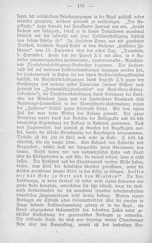ſagen der verſchiednen Belaſtungszeugen in der Regel geſchickt neben einander gruppirte, meiſtens gewandt zu vertheidigen.„Der An⸗ geklagte,“ ſagte damals das Frankfurter Journal von mir,„ſpricht fließend und ſchlagend, ſodaß er in ſeinen Deductionen manchmal förmlich mit ſich fortreißt und ſeine Selbſtvertheidigung ſichtlich von beſtem Erfolge iſt.“ In ähnlichem Sinne, nur mit gewohnter Derbheit, berichtete Auguſt Becker in dem Gießener„Heſſiſchen Zu⸗ ſchauer“ vom 11. September über den erſten Tag.„Darmſtadt, 9. September. Heute hat der Proceß F.'s mit allen, in 8 Ru⸗ briken zuſammengeſtellten Hochverraths⸗, Landesverraths⸗, Majeſtäts⸗ und Dienſtehrenbeleidigungs⸗Verbrechen begonnen. Der Hochver⸗ rath ſoll auf mehreren Volksverſammlungen begangen worden ſein, der Landesverrath in Baden bei den letzten Reichsverfaſſungskämpfen daſelbſt, die Majeſtätsbeleidigungen durch Angriffe F.s gegen den Großherzog und mehrere andre Souveräne(meines Wiſſens auch Heinrich den„Zweiundſiebzigtauſendſten“ von Reuß⸗Greiz⸗Schleiz⸗ Lobenſtein!), die Dienſtehrenbeleidigung durch Verletzung der Amts⸗ ehre des Miniſters Jaup und des Landrichters Brumhard(des Regierungs⸗Commiſſärs in der Adminiſtrativ⸗Unterſuchung wegen der„Zuſchauer“⸗Artikel gegen Kreisrath Seitz). Mit dem letzten Fall hat man heute Mittag den Anfang gemacht. Der ganze Vormittag wurde durch das Verleſen der Anklageakte und die ſehr dünnleibige Begründung der Anklage in Anſpruch genommen. Nach dem Zeugenverhör, das ziemlich zu Gunſten des Angeklagten aus⸗ ſiel, wurde die übliche Vernehmung des Angeklagten vorgenommen. Dieſelbe iſt bis jetzt(8 Uhr) noch nicht zu Ende. F. hält ſich ritterlich, wie ein junger Löwe. Kein Anhauch von Schwäche und Verzagtheit, immer noch der kategoriſche junge Ehrenmann von immer. Selbſt ſeinen vor⸗ und nachmärzlichen Hohn und Spott über die Philippsorden ꝛc. und Alle, die danach lechzen, kann er nicht laſſen. Der Präſident und der Staatsanwalt werden Mühe haben, dieſen, vom Pfeil des heimlichen Gerichts getroffenen, unter die Krähen gerathenen jungen Adler in den Käfig zu bringen. Hoffen wir das Beſte zu Gott und den Menſchen!“ Die Ver⸗ handlungen, in deren Verlauf ich wider mein eignes Erwarten eine große Ruhe bewahrte, entwickelten ſich ſehr lebhaft, wozu die theil⸗ weiſe Verworrenheit der ſich manchmal einander widerſprechenden bäuerlichen Zeugenausſagen nicht wenig beitrug. Meinen eignen Ausſagen am Schluſſe jedes Geſammtverhörs über die einzelne in Frage ſtehende Volksverſammlung gelang es in der Regel, ein klares abgerundetes Geſammtbild des beſondren Falles unter ge⸗ ſchickter Einflechtung der gravirendſten Ausſagen zu entwerfen. Die riskirteſte Stelle für mich war diejenige meiner Oberohmener Rede über den Bauernkrieg, womit ich das ſonderbare Ver⸗