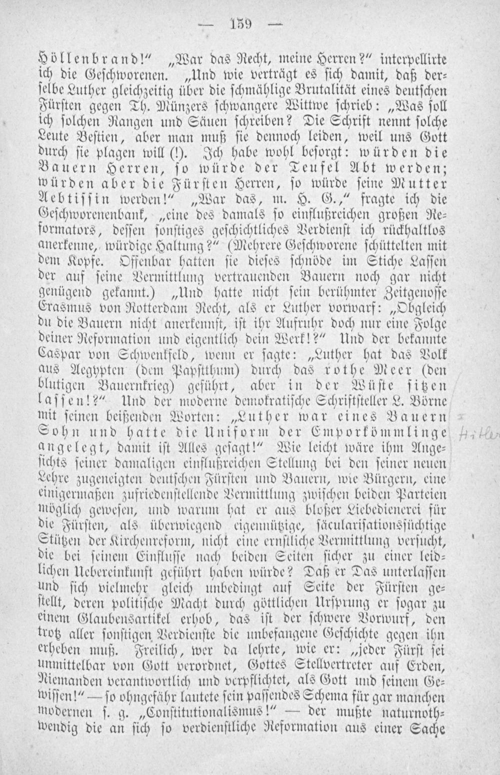 Höllenbrand!“„War das Recht, meine Herren?“ interpellirte ich die Geſchworenen.„Und wie verträgt es ſich damit, daß der⸗ ſelbe Luther gleichzeitig über die ſchmählige Brutalität eines deutſchen Fürſten gegen Th. Münzers ſchwangere Wittwe ſchrieb:„Was ſoll ich ſolchen Rangen und Säuen ſchreiben? Die Schrift nennt ſolche Leute Beſtien, aber man muß ſie dennoch leiden, weil uns Gott durch ſie plagen will(i1?). Ich habe wohl beſorgt: würden die Bauern Herren, ſo würde der Teufel Abt werden; würden aber die Fürſten Herren, ſo würde ſeine Mutter Aebtiſſin werden!“„War das, m. H. G.,“ fragte ich die Geſchworenenbank,„eine des damals ſo einflußreichen großen Re⸗ formators, deſſen ſonſtiges geſchichtliches Verdienſt ich rückhaltlos anerkenne, würdige Haltung?“(Mehrere Geſchworene ſchüttelten mit dem Kopfe. Offenbar hatten ſie dieſes ſchnöde im Stiche Laſſen der auf ſeine Vermittlung vertrauenden Bauern noch gar nicht genügend gekannt.)„Und hatte nicht ſein berühmter Zeitgenoſſe Erasmus von Rotterdam Recht, als er Luther vorwarf:„Obgleich du die Bauern nicht anerkennſt, iſt ihr Aufruhr doch nur eine Folge deiner Reformation und eigentlich dein Werk!?“ Und der bekannte Caspar von Schwenkſeld, wenn er ſagte:„Luther hat das Volk aus Aegypten(dem Papſtthum) durch das rothe Meer(den blutigen Bauernkrieg) geführt, aber in der Wüſte ſitzen laſſen!?“ Und der moderne demokratiſche Schriftſteller L. Börne mit ſeinen beißenden Worten:„Luther war eines Bauern Sohn und hatte die Uniform der Emporkömmlinge angelegt, damit iſt Alles geſagt!“ Wie leicht wäre ihm Ange⸗ ſichts ſeiner damaligen einflußreichen Stellung bei den ſeiner neuen Lehre zugeneigten deutſchen Fürſten und Bauern, wie Bürgern, eine einigermaßen zufriedenſtellende Vermittlung zwiſchen beiden Parteien möglich geweſen, und warum hat er aus bloßer Liebedienerei für die Fürſten, als überwiegend eigennützige, ſäculariſationsſüchtige Stützen der Kirchenreform, nicht eine ernſtliche Vermittlung verſucht, die bei ſeinem Einfluſſe nach beiden Seiten ſicher zu einer leid— lichen Uebereinkunft geführt haben würde? Daß er Das unterlaſſen und ſich vielmehr gleich unbedingt auf Seite der Fürſten ge⸗ ſtelltt, deren politiſche Macht durch göttlichen Urſprung er ſogar zu einem Glaubensartikel erhob, das iſt der ſchwere Vorwurf, den trotz aller ſonſtigen Verdienſte die unbefangene Geſchichte gegen ihn erheben muß. Freilich, wer da lehrte, wie er:„jeder Fürſt ſei unmittelbar von Gott verordnet, Gottes Stellvertreter auf Erden, Niemanden verantwortlich und verpflichtet, als Gott und ſeinem Ge⸗ wiſſen!“— ſo ohngefähr lautete ſein paſſendes Schema für gar manchen modernen ſ. g.„Conſtitutionalismus!“— der mußte naturnoth⸗ wendig die an ſich ſo verdienſtliche Reformation aus einer Sache