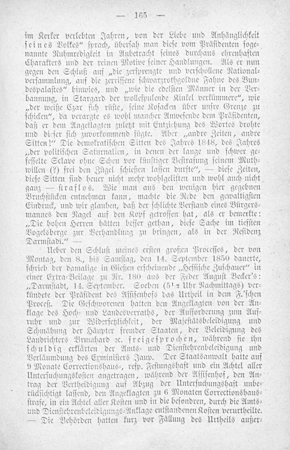 Ueber den Schluß meines erſten großen Proceſſes, der von Montag, den 8., bis Samſtag, den 14. September 1850 dauerte, ſchrieb der damalige in Gießen erſcheinende„Heſſiſche Zuſchauer“ in einer Extra⸗Beilage zu Nr. 180 aus der Feder Auguſt Becker's: „Darmſtadt, 14. September. Soeben(51 ½ Uhr Nachmittags) ver⸗ kündete der Präſident des Aſſiſenhofs das Urtheil in dem F.‚'ſchen Proceß. Die Geſchworenen hatten den Angeklagten von der An⸗ klage des Hoch⸗ und Landesverraths, der Aufforderung zum Auf⸗ ruhr und zur Widerſetzlichkeit, der Majeſtätsbeleidigung und Schmähung der Häupter fremder Staaten, der Beleidigung des Landrichters Brumhard ꝛc. freigeſprochen, während ſie ihn ſchuldig erklärten der Amts⸗ und Dienſtehrenbeleidigung und Verläumdung des Erminiſters Jaup. Der Staatsanwalt hatte auf 9 Monate Correctionshaus⸗, reſp. Feſtungshaft und ein Achtel aller Unterſuchungskoſten angetragen, während der Aſſiſenhof, den An⸗ trag der Vertheidigung auf Abzug der Unterſuchungshaft unbe⸗ rückſichtigt laſſend, den Angeklagten zu 6 Monaten Correctionshaus⸗ ſtrafe, in ein Achtel aller Koſten und in die beſondren, durch die Amts⸗ und Dienſtehrenbeleidigungs⸗Anklage entſtandenen Koſten verurtheilte. — Die Behörden hatten kurz vor Fällung des Urtheils außer⸗
