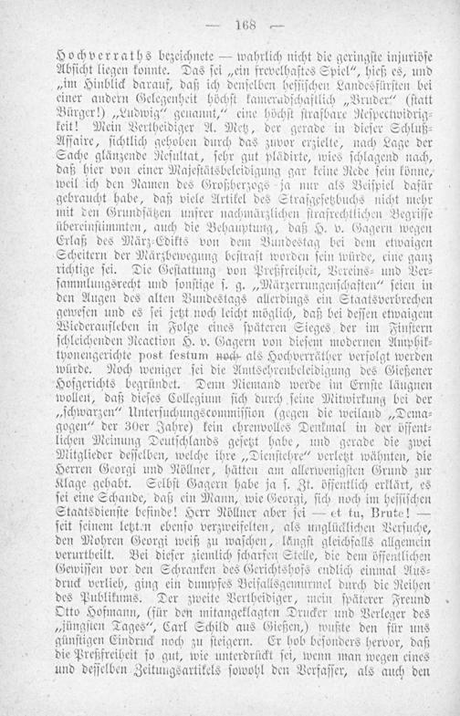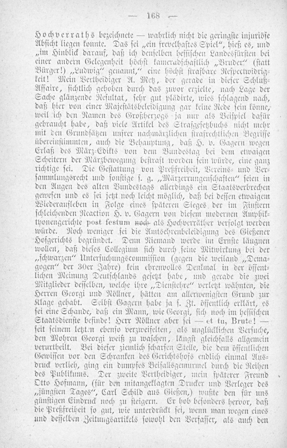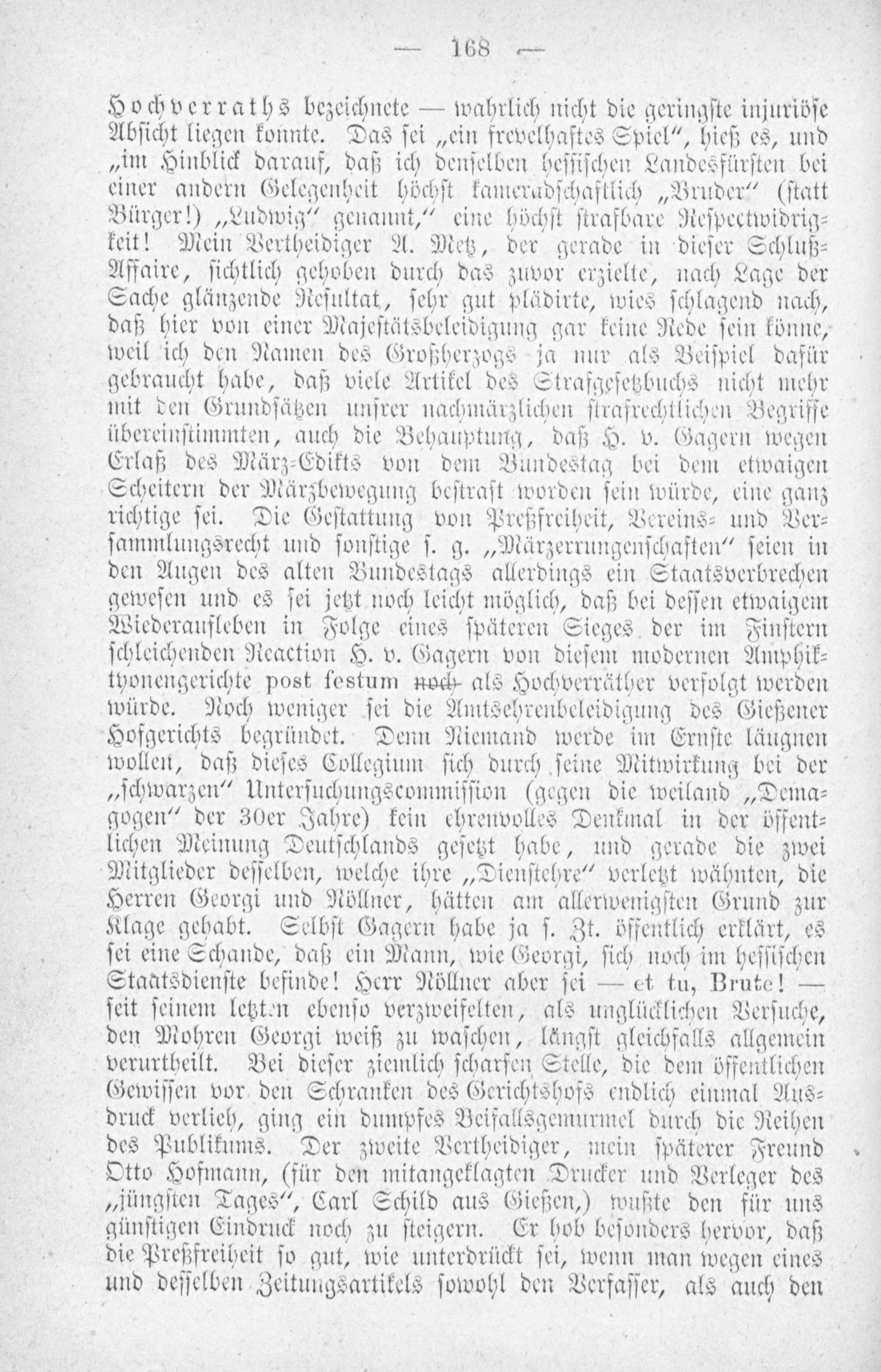 Hochverraths bezeichnete— wahrlich nicht die geringſte injuriöſe Abſicht liegen konnte. Das ſei„ein frevelhaftes Spiel“, hieß es, und „im Hinblick darauf, daß ich denſelben heſſiſchen Landesfürſten bei einer andern Gelegenheit höchſt kameradſchaftlich„Bruder“(ſtatt Bürger!)„Ludwig“ genannt,“ eine höchſt ſtrafbare Reſpectwidrig⸗ keit! Mein Vertheidiger A. Metz, der gerade in dieſer Schluß⸗ Affaire, ſichtlich gehoben durch das zuvor erzielte, nach Lage der Sache glänzende Reſultat, ſehr gut plädirte, wies ſchlagend nach, daß hier von einer Majeſtätsbeleidigung gar keine Rede ſein könne, weil ich den Namen des Großherzogs ja nur als Beiſpiel dafür gebraucht habe, daß viele Artikel des Strafgeſetzbuchs nicht mehr mit den Grundſätzen unſrer nachmärzlichen ſtrafrechtlichen Begriffe übereinſtimmten, auch die Behauptung, daß H. v. Gagern wegen Erlaß des März⸗Edikts von dem Bundestag bei dem etwaigen Scheitern der Märzbewegung beſtraſt worden ſein würde, eine ganz richtige ſei. Die Geſtattung von Preßfreiheit, Vereins⸗ und Ver⸗ ſammlungsrecht und ſonſtige ſ. g.„Märzerrungenſchaften“ ſeien in den Augen des alten Bundestags allerdings ein Staatsverbrechen geweſen und es ſei jetzt noch leicht möglich, daß bei deſſen etwaigem Wiederaufleben in Folge eines ſpäteren Sieges der im Finſtern ſchleichenden Reaction H. v. Gagern von dieſem modernen Amphik⸗ tyonengerichte post festum noch als Hochverräther verſolgt werden würde. Noch weniger ſei die Amtsehrenbeleidigung des Gießener Hofgerichts begründet. Denn Niemand werde im Ernſte läugnen wollen, daß dieſes Collegium ſich durch ſeine Mitwirkung bei der „ſchwarzen“ Unterſuchungscommiſſion(gegen die weiland„Dema⸗ gogen“ der 30er Jahre) kein ehrenvolles Denkmal in der öffent⸗ lichen Meinung Deutſchlands geſetzt habe, und gerade die zwei Mitglieder deſſelben, welche ihre„Dienſtehre“ verletzt wähnten, die Herren Georgi und Nöllner, hätten am allerwenigſten Grund zur Klage gehabt. Selbſt Gagern habe ja ſ. Zt. öffentlich erklärt, es ſei eine Schande, daß ein Mann, wie Georgi, ſich noch im heſſiſchen Staatsdienſte befinde! Herr Nöllner aber ſei— et tu, Brute!— ſeit ſeinem letzten ebenſo verzweifelten, als unglücklichen Verſuche, den Mohren Georgi weiß zu waſchen, längſt gleichfalls allgemein verurtheilt. Bei dieſer ziemlich ſcharfen Stelle, die dem öffentlichen Gewiſſen vor den Schranken des Gerichtshofs endlich einmal Aus⸗ druck verlieh, ging ein dumpfes Beifallsgemurmel durch die Reihen des Publikums. Der zweite Vertheidiger, mein ſpäterer Freund Otto Hofmann,(für den mitangeklagten Drucker und Verleger des „jüngſten Tages“, Carl Schild aus Gießen,) wußte den für uns günſtigen Eindruck noch zu ſteigern. Er hob beſonders hervor, daß die Preßfreiheit ſo gut, wie unterdrückt ſei, wenn man wegen eines und deſſelben Zeitungsartikels ſowohl den Verfaſſer, als auch den