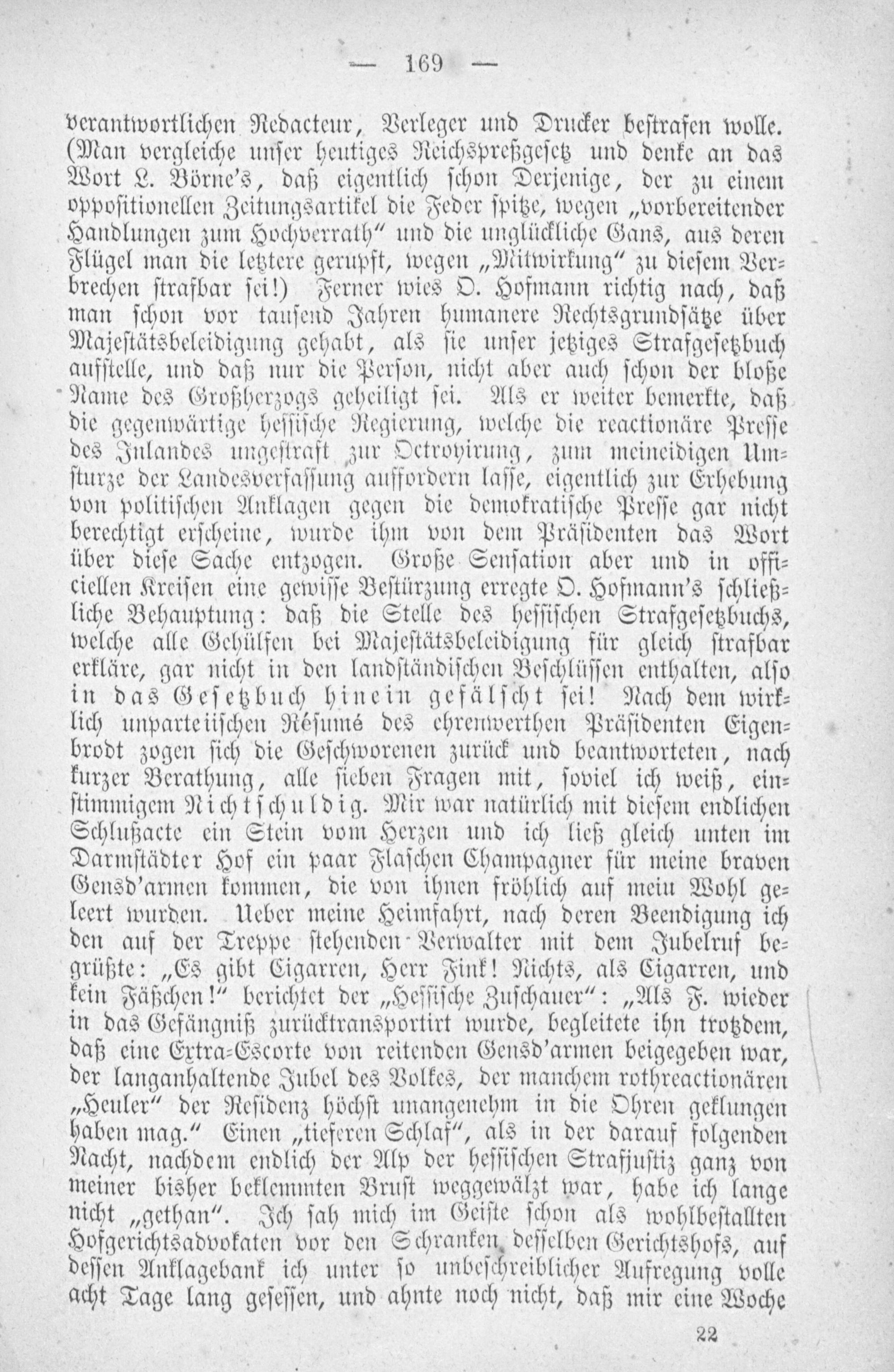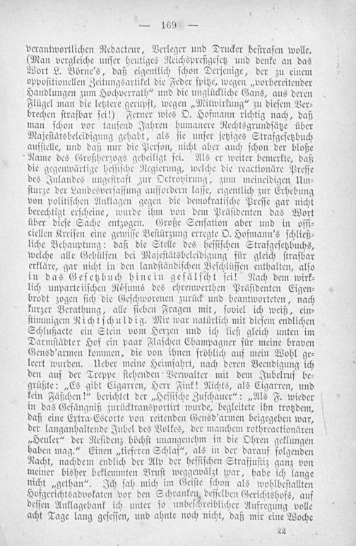 verantwortlichen Redacteur, Verleger und Drucker beſtrafen wolle. (Man vergleiche unſer heutiges Reichspreßgeſetz und denke an das Wort L. Börne’s, daß eigentlich ſchon Derjenige, der zu einem oppoſitionellen Zeitungsartikel die Feder ſpitze, wegen„vorbereitender Handlungen zum Hochverrath“ und die unglückliche Gans, aus deren Flügel man die letztere gerupft, wegen„Mitwirkung“ zu dieſem Ver⸗ brechen ſtrafbar ſei!) Ferner wies O. Hofmann richtig nach, daß man ſchon vor tauſend Jahren humanere Rechtsgrundſätze über Majeſtätsbeleidigung gehabt, als ſie unſer jetziges Strafgeſetzbuch aufſtelle, und daß nur die Perſon, nicht aber auch ſchon der bloße Name des Großherzogs geheiligt ſei. Als er weiter bemerkte, daß die gegenwärtige heſſiſche Regierung, welche die reactionäre Preſſe des Inlandes ungeſtraft zur Octroyirung, zum meineidigen Um⸗ ſturze der Landesverfaſſung auffordern laſſe, eigentlich zur Erhebung von politiſchen Anklagen gegen die demokratiſche Preſſe gar nicht berechtigt erſcheine, wurde ihm von dem Präſidenten das Wort über dieſe Sache entzogen. Große Senſation aber und in offi⸗ ciellen Kreiſen eine gewiſſe Beſtürzung erregte O. Hofmann's ſchließ⸗ liche Behauptung: daß die Stelle des heſſiſchen Strafgeſetzbuchs, welche alle Gehülfen bei Majeſtätsbeleidigung für gleich ſtrafbar erkläre, gar nicht in den landſtändiſchen Beſchlüſſen enthalten, alſo in das Geſetzbuch hinein gefälſcht ſei! Nach dem wirk⸗ lich unparte iiſchen Réſumé des ehrenwerthen Präſidenten Eigen⸗ brodt zogen ſich die Geſchworenen zurück und beantworteten, nach kurzer Berathung, alle ſieben Fragen mit, ſoviel ich weiß, ein⸗ ſtimmigem Nichtſchuldig. Mir war natürlich mit dieſem endlichen Schlußacte ein Stein vom Herzen und ich ließ gleich unten im Darmſtädter Hof ein paar Flaſchen Champagner für meine braven Gensd'armen kommen, die von ihnen fröhlich auf mein Wohl ge⸗ leert wurden. Ueber meine Heimfahrt, nach deren Beendigung ich den auf der Treppe ſtehenden Verwalter mit dem Jubelruf be⸗ grüßte:„Es gibt Cigarren, Herr Fink! Nichts, als Cigarren, und kein Fäßchen!“ berichtet der„Heſſiſche Zuſchauer“:„Als F. wieder in das Gefängniß zurücktransportirt wurde, begleitete ihn trotzdem, daß eine Extra⸗Escorte von reitenden Gensd'armen beigegeben war, der langanhaltende Jubel des Volkes, der manchem rothreactionären „Heuler“ der Reſidenz höchſt unangenehm in die Ohren geklungen haben mag.“ Einen„tieferen Schlaf“, als in der darauf folgenden Nacht, nachdem endlich der Alp der heſſiſchen Strafjuſtiz ganz von meiner bisher beklemmten Bruſt weggewälzt war, habe ich lange nicht„gethan“. Ich ſah mich im Geiſte ſchon als wohlbeſtallten Hofgerichtsadvokaten vor den Schranken deſſelben Gerichtshofs, auf deſſen Anklagebank ich unter ſo unbeſchreiblicher Aufregung volle acht Tage lang geſeſſen, und ahnte noch nicht, daß mir eine Woche