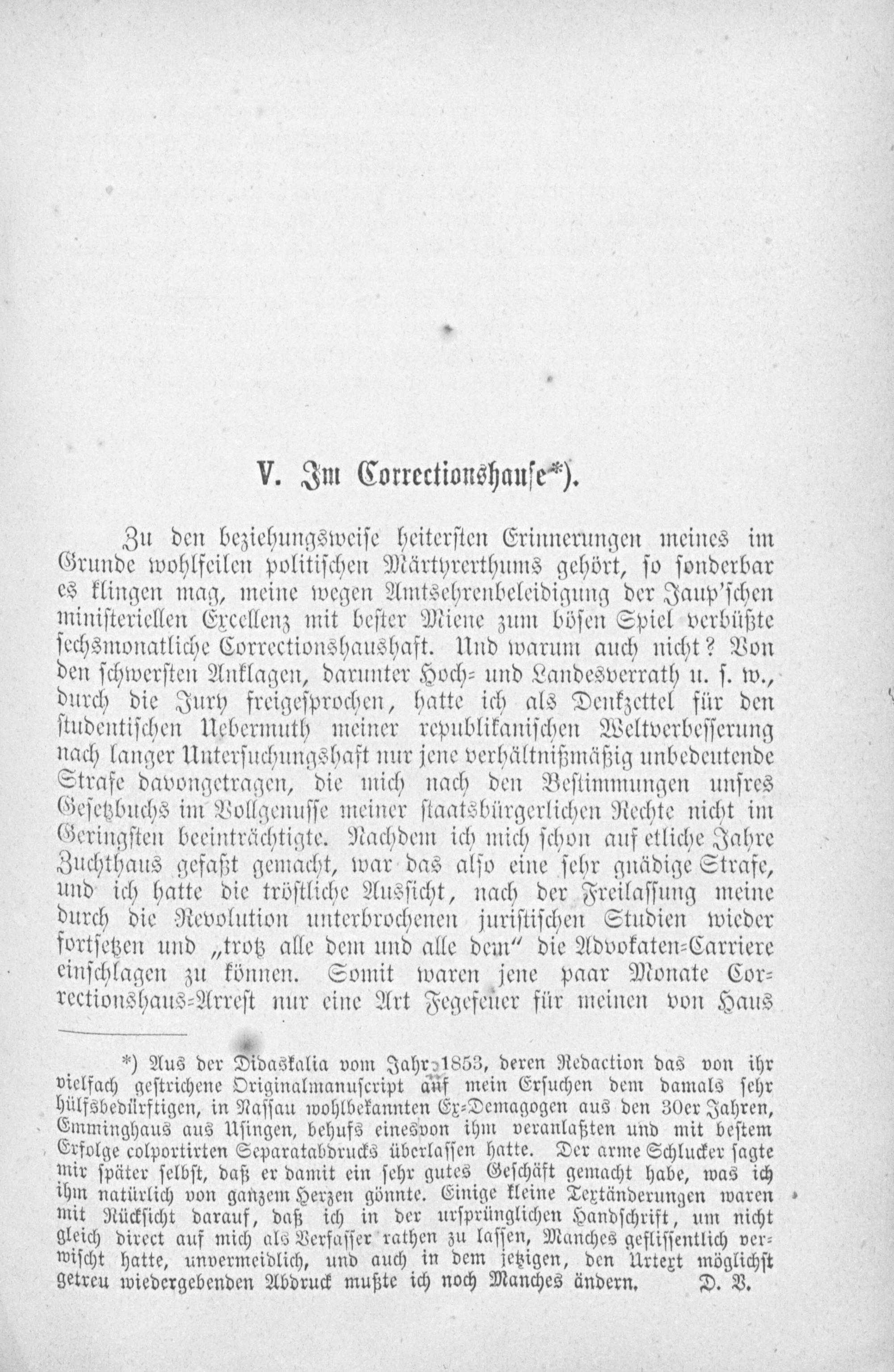 Zu den beziehungsweiſe heiterſten Erinnerungen meines im Grunde wohlfeilen politiſchen Märtyrerthums gehört, ſo ſonderbar es klingen mag, meine wegen Amtsehrenbeleidigung der Jaup'ſchen miniſteriellen Excellenz mit beſter Miene zum böſen Spiel verbüßte ſechsmonatliche Correctionshaushaft. Und warum auch nicht? Von den ſchwerſten Anklagen, darunter Hoch⸗ und Landesverrath u. ſ. w., durch die Jury freigeſprochen, hatte ich als Denkzettel für den ſtudentiſchen Uebermuth meiner republikaniſchen Weltverbeſſerung nach langer Unterſuchungshaft nur jene verhältnißmäßig unbedeutende Strafe davongetragen, die mich nach den Beſtimmungen unſres Geſetzbuchs im Vollgenuſſe meiner ſtaatsbürgerlichen Rechte nicht im Geringſten beeinträchtigte. Nachdem ich mich ſchon auf etliche Jahre Zuchthaus gefaßt gemacht, war das alſo eine ſehr gnädige Strafe, und ich hatte die tröſtliche Ausſicht, nach der Freilaſſung meine durch die Revolution unterbrochenen juriſtiſchen Studien wieder fortſetzen und„trotz alle dem und alle dem“ die Advokaten⸗Carriere einſchlagen zu können. Somit waren jene paar Monate Cor⸗ rectionshaus⸗Arreſt nur eine Art Fegefeuer für meinen von Haus —.. *) Aus der Didaskalia vom Jahr 1853, deren Redaction das von ihr vielfach geſtrichene Originalmanuſcript anf mein Erſuchen dem damals ſehr hülfsbedürftigen, in Naſſau wohlbekannten Ex⸗Demagogen aus den 30er Jahren, Emminghaus aus Uſingen, behufs einesvon ihm veranlaßten und mit beſtem Erfolge colportirten Separatabdrucks überlaſſen hatte. Der arme Schlucker ſagte mir ſpäter ſelbſt, daß er damit ein ſehr gutes Geſchäft gemacht habe, was ich ihm natürlich von ganzem Herzen gönnte. Einige kleine Textänderungen waren mit Rückſicht darauf, daß ich in der urſprünglichen Handſchrift, um nicht gleich direct auf mich als Verfaſſer rathen zu laſſen, Manches gefliſſentlich ver⸗ wiſcht hatte, unvermeidlich, und auch in dem jetzigen, den Urtext möglichſt getreu wiedergebenden Abdruck mußte ich noch Manches ändern. D. V.