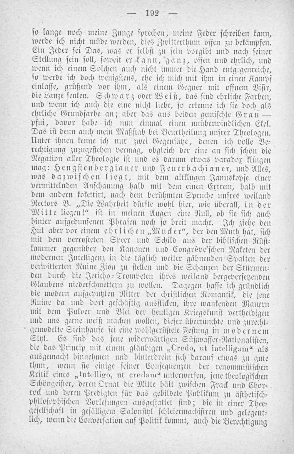 ſo lange noch meine Zunge ſprechen, meine Feder ſchreiben kann, werde ich nicht müde werden, dies Zwitterthum offen zu bekämpfen. Ein Jeder ſei Das, was er ſelbſt zu ſein vorgibt und nach ſeiner Stellung ſein ſoll, ſoweit er kann, ganz, offen und ehrlich, und wenn ich einem Solchen auch nicht immer die Hand entgegenreiche, ſo werde ich doch wenigſtens, ehe ich mich mit ihm in einen Kampf einlaſſe, grüßend vor ihm, als einem Gegner mit offnem Viſir, die Lanze ſenken. Schwarz oder Weiß, das ſind ehrliche Farben, und wenn ich auch die eine nicht liebe, ſo erkenne ich ſie doch als ehrliche Grundfarbe an; aber das aus beiden gemiſchte Grau— pfui, davor habe ich nun einmal einen unüberwindlichen Ekel. Das iſt denn auch mein Maßſtab bei Beurtheilung unſrer Theologen. Unter ihnen kenne ich nur zwei Gegenſätze, denen ich volle Be⸗ rechtigung zuzugeſtehen vermag, obgleich der eine an ſich ſchon die Negation aller Theologie iſt und es darum etwas parador klingen mag: Hengſtenbergianer und Feuerbachianer, und Alles, was dazwiſchen liegt, mit dem altklugen Januskopfe einer vermittelnden Anſchauung halb mit dem einen Extrem, halb mit dem andern kokettirt, nach dem berühmten Spruche unſres weiland Rectors B.„Die Wahrheit dürfte wohl hier, wie überall, in der Mitte liegen!“ iſt in meinen Augen eine Null, ob ſie ſich auch hinter aufgedunſenen Phraſen noch ſo breit mache. Ich ziehe den Hut aber vor einem ehrlichen„Mucker“, der den Muth hat, ſich mit dem verroſteten Speer und Schild aus der bibliſchen Rüſt⸗ kammer gegenüber den Kanonen und Congréve'ſchen Raketen der modernen Intelligenz in die täglich weiter gähnenden Spalten der verwitterten Ruine Zion zu ſtellen und die Schanzen der Stürmen⸗ den durch die Jericho⸗Trompeten ihres weiland bergeverſetzenden Glaubens niederſchmettern zu wollen. Dagegen haſſe ich gründlich die modern auſgeputzten Ritter der chriſtlichen Romantik, die jene Ruine da und dort geſchäftig ausflicken, ihre wankenden Mauern mit dem Pulver und Blei der heutigen Kriegskunſt vertheidigen und uns gerne weiß machen wollen, dieſer übertünchte und zurecht⸗ gemodelte Steinhaufe ſei eine wohlgerüſtete Feſtung in modernem Styl. Es ſind das jene widerwärtigen Süßwaſſer⸗Rationaliſten, die das Princip mit einem gläubigen„Credo, ut intelligam“ als ausgemacht hinnehmen und hinterdrein ſich darauf etwas zu gute thun, wenn ſie einige ſeiner Conſequenzen der renommiſtiſchen Kritik eines„Intelligo, ut credam“ unterwerfen, jene theologiſchen Schöngeiſter, deren Ornat die Mitte hält zwiſchen Frack und Chor⸗ rock und deren Predigten für das gebildete Publikum zu äſthetiſch⸗ philoſophiſchen Vorleſungen ausgeſtattet ſind; die in einer Thee⸗ geſellſchaſt in gefälligem Salonſtyl ſchleiermachiſiren und gelegent⸗