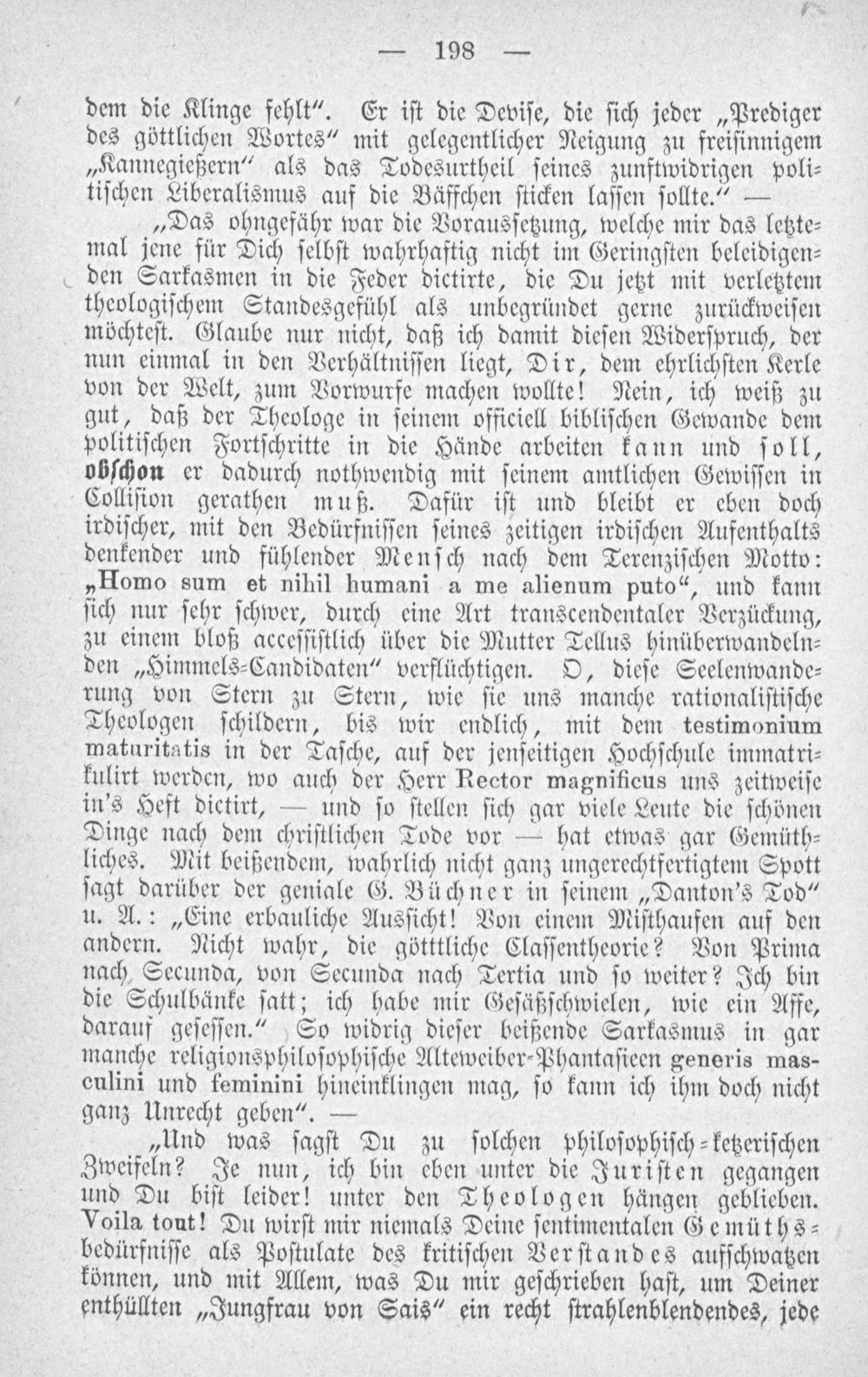 „Und was ſagſt Du zu ſolchen philoſophiſch⸗ketzeriſchen Zweifeln? Je nun, ich bin eben unter die Juriſten gegangen und Du biſt leider! unter den Theologen hängen geblieben. Voila tout! Du wirſt mir niemals Deine ſentimentalen Ge müths⸗ bedürfniſſe als Poſtulate des kritiſchen Verſtandes aufſchwatzen können, und mit Allem, was Du mir geſchrieben haſt, um Deiner enthüllten„Jungfrau von Sais“ ein recht ſtrahlenblendendes, jede