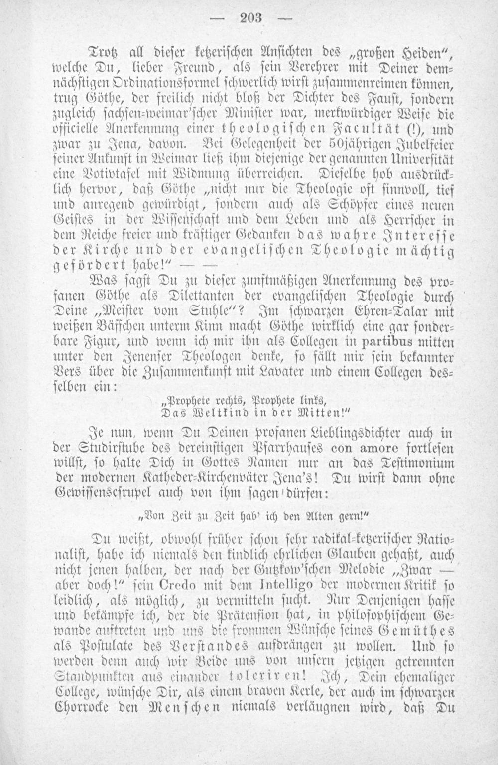Je nun, wenn Du Deinen profanen Lieblingsdichter auch in der Studirſtube des dereinſtigen Pfarrhauſes con amore fortleſen willſt, ſo halte Dich in Gottes Namen nur an das Teſtimonium der modernen Katheder⸗Kirchenväter Jena's! Du wirſt dann ohne Gewiſſenseſrupel auch von ihm ſagen dürfen: