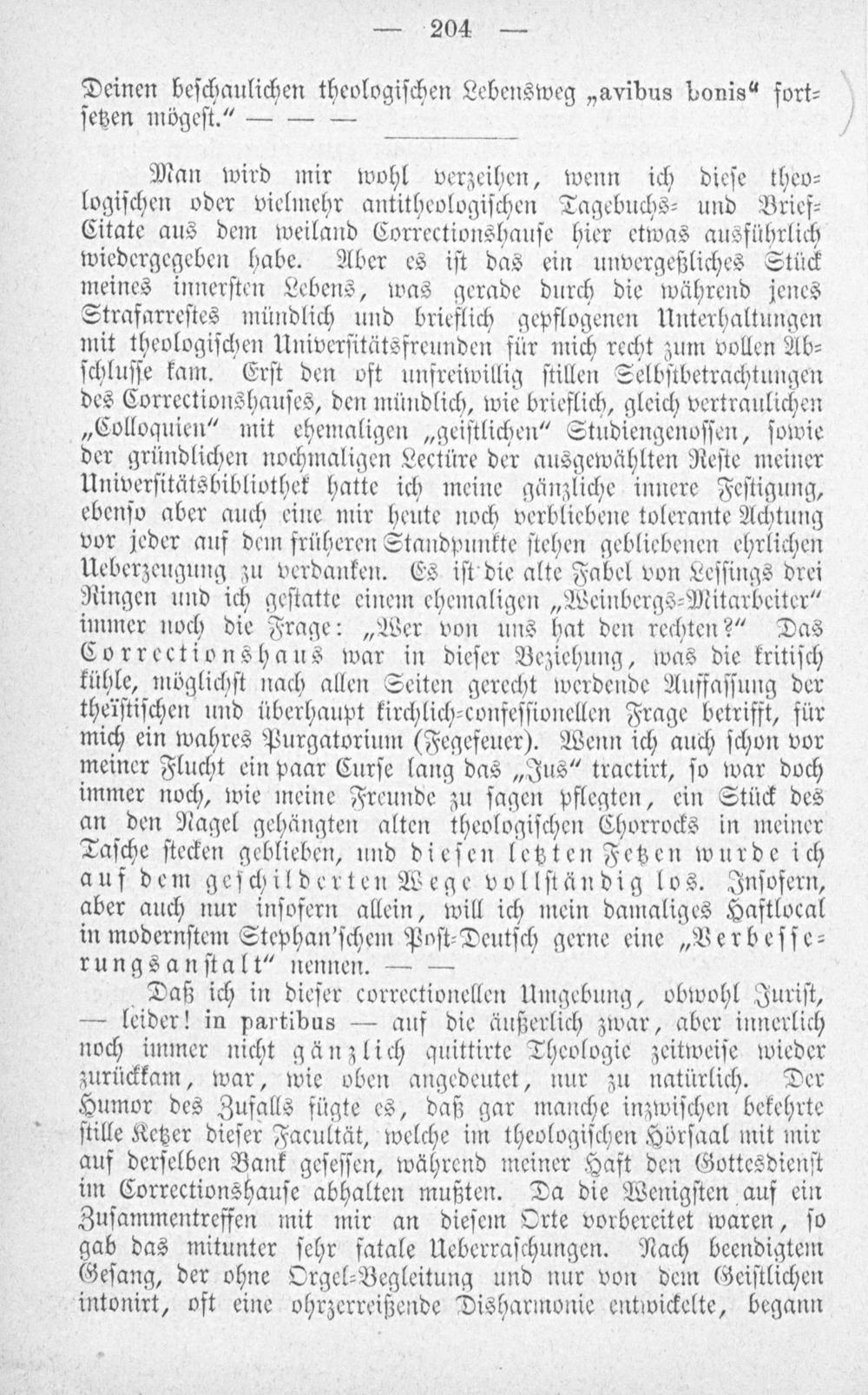 Man wird mir wohl verzeihen, wenn ich dieſe theo⸗ logiſchen oder vielmehr antitheologiſchen Tagebuchs⸗ und Brief⸗ Citate aus dem weiland Correctionshauſe hier etwas ausführlich wiedergegeben habe. Aber es iſt das ein unvergeßliches Stück meines innerſten Lebens, was gerade durch die während jenes Strafarreſtes mündlich und brieflich gepflogenen Unterhaltungen mit theologiſchen Univerſitätsfreunden für mich recht zum vollen Ab⸗ ſchluſſe kam. Erſt den oft unfreiwillig ſtillen Selbſtbetrachtungen des Correctionshauſes, den mündlich, wie brieflich, gleich vertraulichen „Colloquien“ mit ehemaligen„geiſtlichen“ Studiengenoſſen, ſowie der gründlichen nochmaligen Lectüre der ausgewählten Reſte meiner Univerſitätsbibliothek hatte ich meine gänzliche innere Feſtigung, ebenſo aber auch eine mir heute noch verbliebene tolerante Achtung vor jeder auf dem früheren Standpunkte ſtehen gebliebenen ehrlichen Ueberzeugung zu verdanken. Es iſt die alte Fabel von Leſſings drei Ringen und ich geſtatte einem ehemaligen„Weinbergs⸗Mitarbeiter“ immer noch die Frage:„Wer von uns hat den rechten?“ Das Correctionshaus war in dieſer Beziehung, was die kritiſch kühle, möglichſt nach allen Seiten gerecht werdende Auffaſſung der theiſtiſchen und überhaupt kirchlich⸗confeſſionellen Frage betrifft, für mich ein wahres Purgatorium(Fegefeuer). Wenn ich auch ſchon vor meiner Flucht ein paar Curſe lang das„Jus“ tractirt, ſo war doch immer noch, wie meine Freunde zu ſagen pflegten, ein Stück des an den Nagel gehängten alten theologiſchen Chorrocks in meiner Taſche ſtecken geblieben, und dieſen letzten Fetzen wurde ich auf dem geſchilderten Wege vollſtändig los. Inſofern, aber auch nur inſofern allein, will ich mein damaliges Haftlocal in modernſtem Stephan'ſchem Poſt⸗Deutſch gerne eine„Verbeſſe⸗ rungsanſtalt“ nennen.——