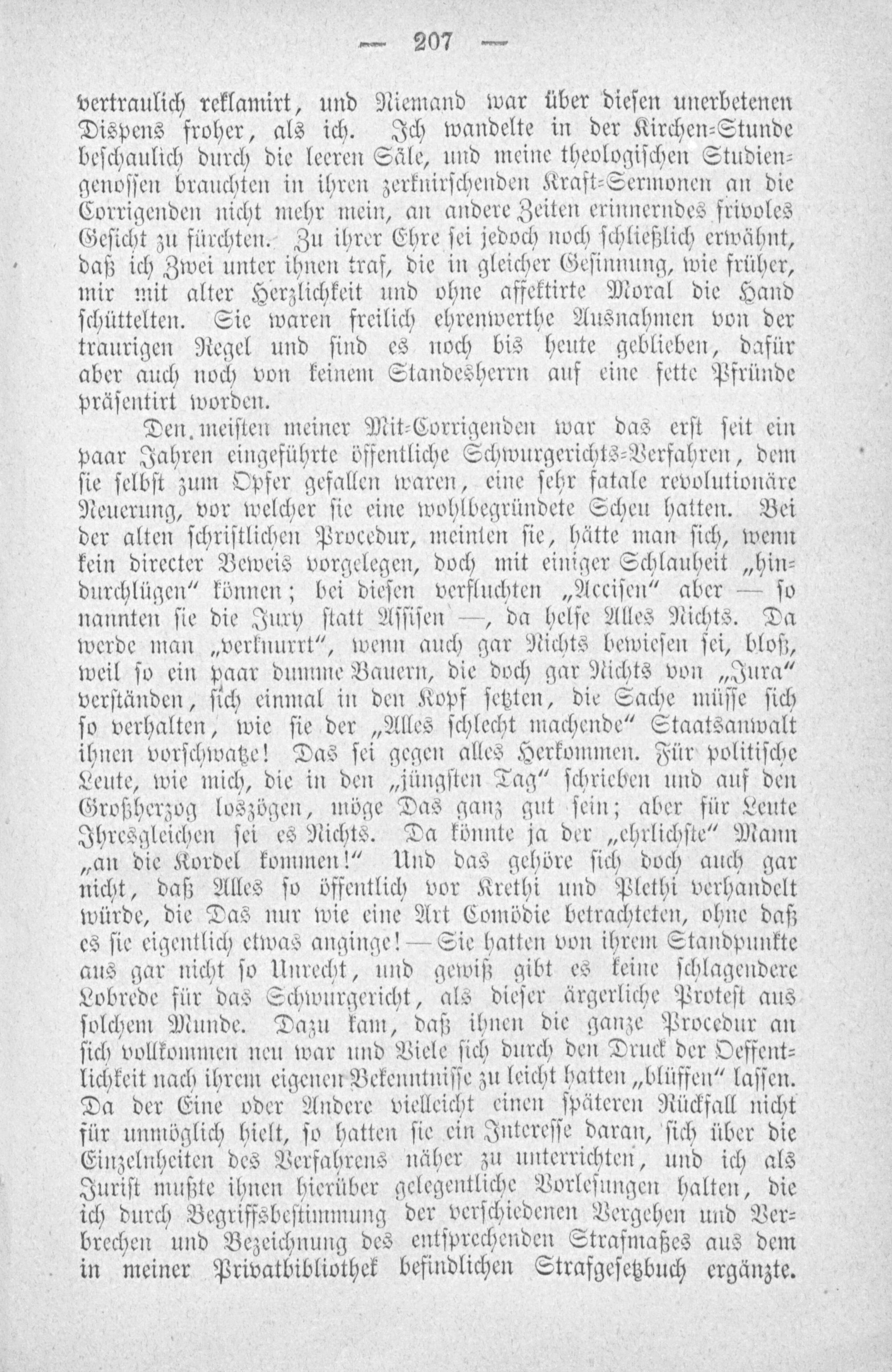 Den meiſten meiner Mit⸗Corrigenden war das erſt ſeit ein paar Jahren eingeführte öffentliche Schwurgerichts⸗Verfahren, dem ſie ſelbſt zum Opfer gefallen waren, eine ſehr fatale revolutionäre Neuerung, vor welcher ſie eine wohlbegründete Scheu hatten. Bei der alten ſchriſtlichen Procedur, meinten ſie, hätte man ſich, wenn kein directer Beweis vorgelegen, doch mit einiger Schlauheit„hin⸗ durchlügen“ können; bei dieſen verfluchten„Acciſen“ aber— ſo nannten ſie die Jury ſtatt Aſſiſen—, da helfe Alles Nichts. Da werde man„verknurrt“, wenn auch gar Nichts bewieſen ſei, bloß, weil ſo ein paar dumme Bauern, die doch gar Nichts von„Jura“ verſtänden, ſich einmal in den Kopf ſetzten, die Sache müſſe ſich ſo verhalten, wie ſie der„Alles ſchlecht machende“ Staatsanwalt ihnen vorſchwatze! Das ſei gegen alles Herkommen. Für politiſche Leute, wie mich, die in den„jüngſten Tag“ ſchrieben und auf den Großherzog loszögen, möge Das ganz gut ſein; aber für Leute Ihresgleichen ſei es Nichts. Da könnte ja der„ehrlichſte“ Mann „an die Kordel kommen!“ Und das gehöre ſich doch auch gar nicht, daß Alles ſo öffentlich vor Krethi und Plethi verhandelt würde, die Das nur wie eine Art Comödie betrachteten, ohne daß es ſie eigentlich etwas anginge!— Sie hatten von ihrem Standpunkte aus gar nicht ſo Unrecht, und gewiß gibt es keine ſchlagendere Lobrede für das Schwurgericht, als dieſer ärgerliche Proteſt aus ſolchem Munde. Dazu kam, daß ihnen die ganze Procedur an ſich vollkommen neu war und Viele ſich durch den Druck der Oeffent⸗ lichkeit nach ihrem eigenen Bekenntniſſe zu leicht hatten„blüffen“ laſſen. Da der Eine oder Andere vielleicht einen ſpäteren Rückfall nicht für unmöglich hielt, ſo hatten ſie ein Intereſſe daran, ſich über die Einzelnheiten des Verfahrens näher zu unterrichten, und ich als Juriſt mußte ihnen hierüber gelegentliche Vorleſungen halten, die ich durch Begriffsbeſtimmung der verſchiedenen Vergehen und Ver⸗ brechen und Bezeichnung des entſprechenden Strafmaßes aus dem in meiner Privatbibliothek befindlichen Strafgeſetzbuch ergänzte.