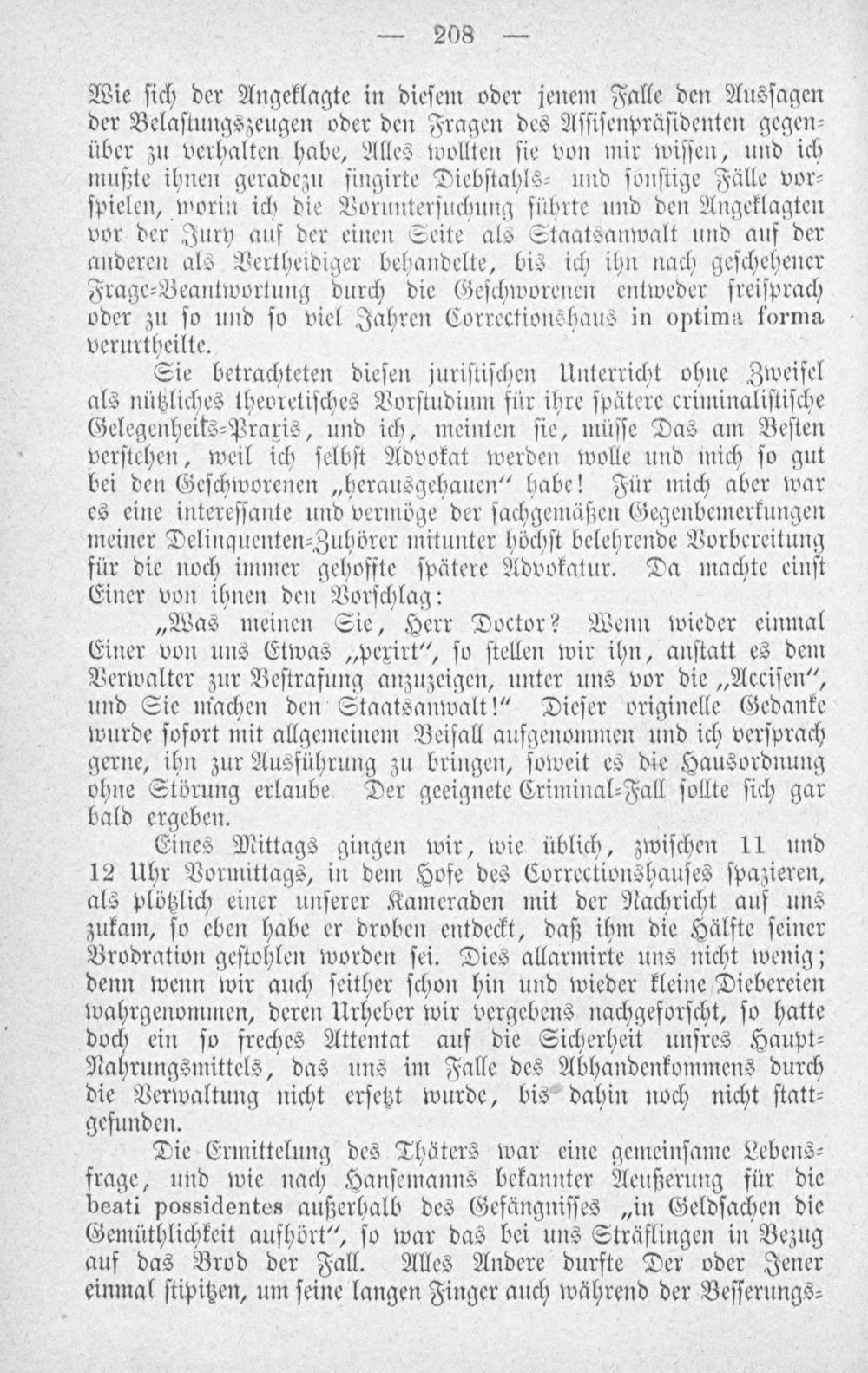Eines Mittags gingen wir, wie üblich, zwiſchen 11 und 12 Uhr Vormittags, in dem Hofe des Correctionshauſes ſpazieren, als plötzlich einer unſerer Kameraden mit der Nachricht auf uns zukam, ſo eben habe er droben entdeckt, daß ihm die Hälfte ſeiner Brodration geſtohlen worden ſei. Dies allarmirte uns nicht wenig; denn wenn wir auch ſeither ſchon hin und wieder kleine Diebereien wahrgenommen, deren Urheber wir vergebens nachgeforſcht, ſo hatte doch ein ſo freches Attentat auf die Sicherheit unſres Haupt⸗ Nahrungsmittels, das uns im Falle des Abhandenkommens durch die Verwaltung nicht erſetzt wurde, bis dahin noch nicht ſtatt⸗ gefunden.