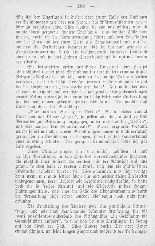 Wie ſich der Angeklagte in dieſem oder jenem Falle den Ausſagen der Belaſtungszeugen oder den Fragen des Aſſiſenpräſidenten gegen⸗ über zu verhalten habe, Alles wollten ſie von mir wiſſen, und ich mußte ihnen geradezu ſingirte Diebſtahls⸗ und ſonſtige Fälle vor⸗ ſpielen, worin ich die Vorunterſuchung führte und den Angeklagten vor der Jury auf der einen Seite als Staatsanwalt und auf der anderen als Vertheidiger behandelte, bis ich ihn nach geſchehener Frage⸗Beantwortung durch die Geſchworenen entweder freiſprach oder zu ſo und ſo viel Jahren Correctionshaus in optima forma verurtheilte.