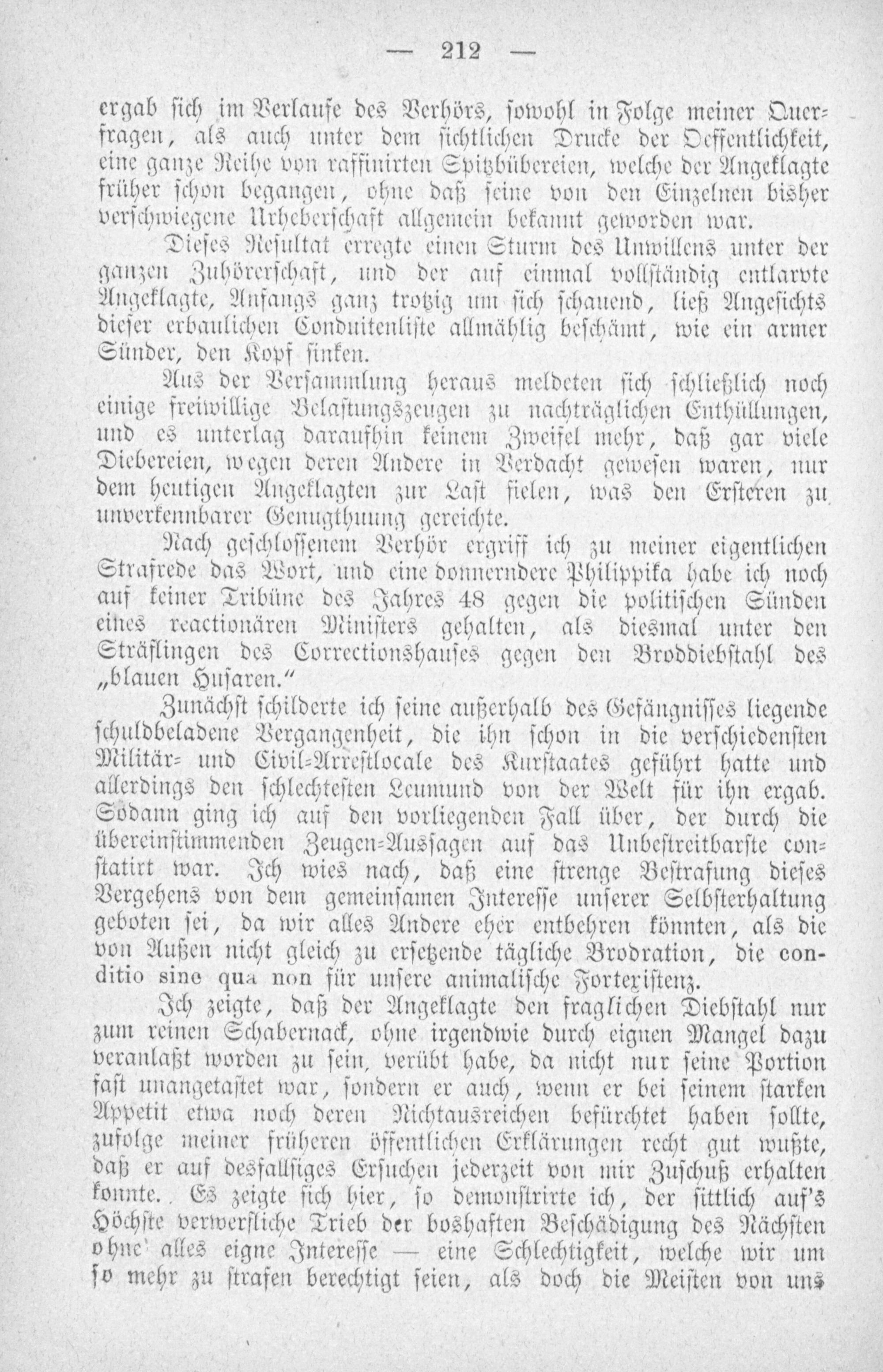 Nach geſchloſſenem Verhör ergriff ich zu meiner eigentlichen Strafrede das Wort, und eine donnerndere Philippika habe ich noch auf keiner Tribüne des Jahres 48 gegen die politiſchen Sünden eines reactionären Miniſters gehalten, als diesmal unter den Sträflingen des Correctionshauſes gegen den Broddiebſtahl des „blauen Huſaren.“