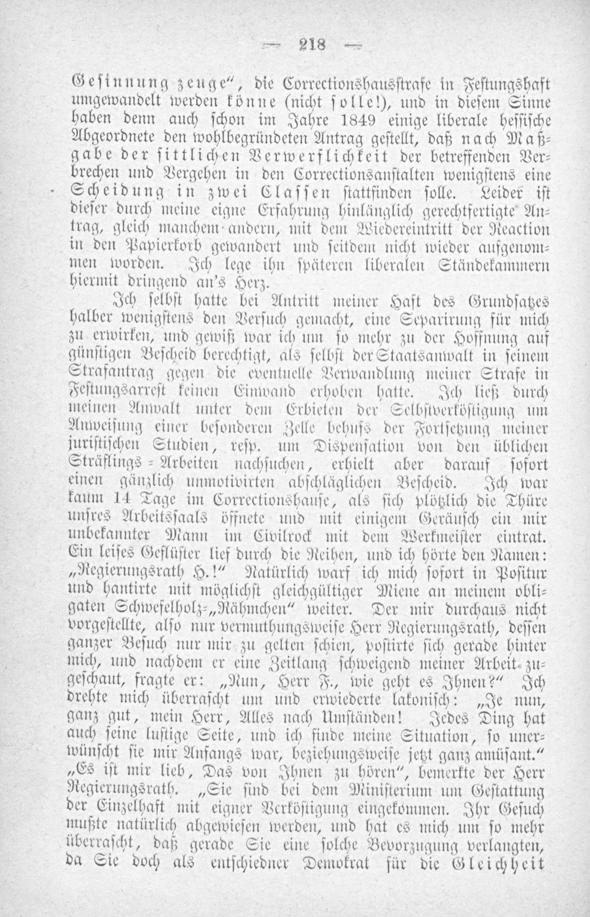 Ich ſelbſt hatte bei Antritt meiner Haft des Grundſatzes halber wenigſtens den Verſuch gemacht, eine Separirung für mich zu erwirken, und gewiß war ich um ſo mehr zu der Hoffnung auf günſtigen Beſcheid berechtigt, als ſelbſt der Staatsanwalt in ſeinem Strafantrag gegen die eventuelle Verwandlung meiner Strafe in Feſtungsarreſt keinen Einwand erhoben hatte. Ich ließ durch meinen Anwalt unter dem Erbieten der Selbſtverköſtigung um Anweiſung einer beſonderen Zelle behufs der Fortſetzung meiner juriſtiſchen Studien, reſp. um Dispenſation von den üblichen Sträflings-Arbeiten nachſuchen, erhielt aber darauf ſofort einen gänzlich unmotivirten abſchläglichen Beſcheid. Ich war kaum 14 Tage im Correctionshauſe, als ſich plötzlich die Thüre unſres Arbeitsſaals öffnete und mit einigem Geräuſch ein mir unbekannter Mann im Civilrock mit dem Werkmeiſter eintrat. Ein leiſes Geflüſter lief durch die Reihen, und ich hörte den Namen: „Regierungsrath H.!“ Natürlich warf ich mich ſofort in Poſitur und hantirte mit möglichſt gleichgültiger Miene an meinem obli⸗ gaten Schwefelholz⸗„Rähmchen“ weiter. Der mir durchaus nicht vorgeſtellte, alſo nur vermuthungsweiſe Herr Regierungsrath, deſſen ganzer Beſuch nur mir zu gelten ſchien, poſtirte ſich gerade hinter mich, und nachdem er eine Zeitlang ſchweigend meiner Arbeit, zu⸗ geſchaut, fragte er:„Nun, Herr F., wie geht es Ihnen?“ Ich drehte mich überraſcht um und erwiederte lakoniſch:„Je nun, ganz gut, mein Herr, Alles nach Umſtänden! Jedes Ding hat auch ſeine luſtige Seite, und ich finde meine Situation, ſo uner⸗ wünſcht ſie mir Anfangs war, beziehungsweiſe jetzt ganz amüſant.“ „Es iſt mir lieb, Das von Ihnen zu hören“, bemerkte der Herr Regierungsrath.„Sie ſind bei dem Miniſterium um Geſtattung der Einzelhaft mit eigner Verköſtigung eingekommen. Ihr Geſuch mußte natürlich abgewieſen werden, und hat es mich um ſo mehr überraſcht, daß gerade Sie eine ſolche Bevorzugung verlangten, da Sie doch als entſchiedner Demokrat für die Gleichheit