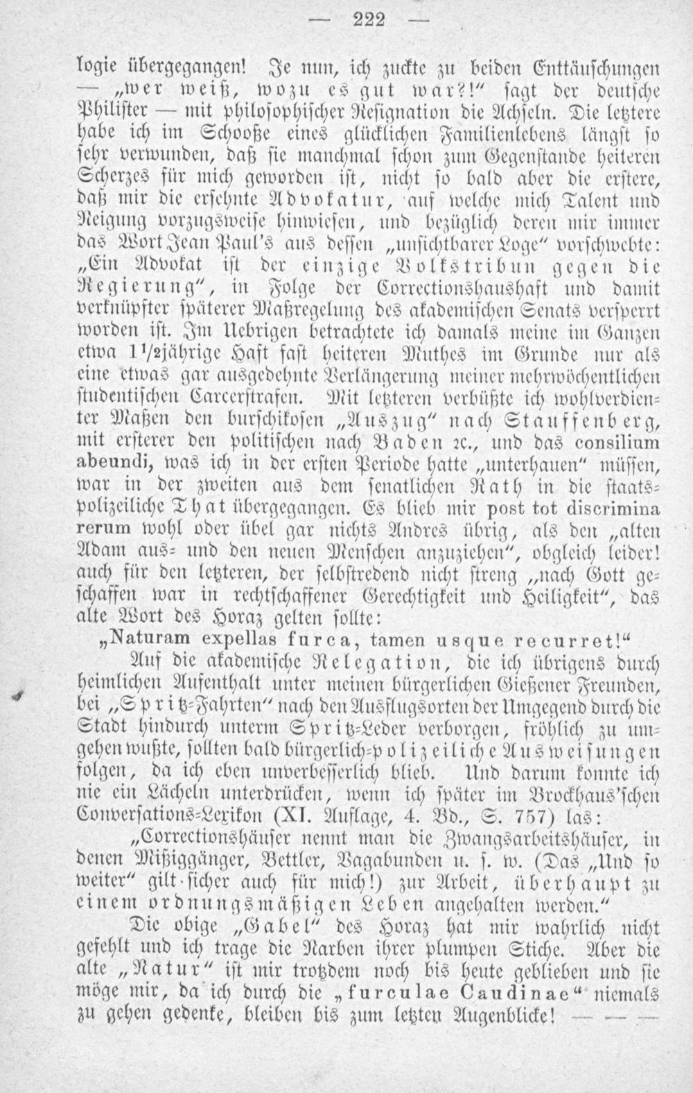 logie übergegangen! Je nun, ich zuckte zu beiden Enttäuſchungen —„wer weiß, wozu es gut ware!“ ſagt der deutſche Philiſter— mit philoſophiſcher Reſignation die Achſeln. Die letztere habe ich im Schooße eines glücklichen Familienlebens längſt ſo ſehr verwunden, daß ſie manchmal ſchon zum Gegenſtande heiteren Scherzes für mich geworden iſt, nicht ſo bald aber die erſtere, daß mir die erſehnte Advokatur, auf welche mich Talent und Neigung vorzugsweiſe hinwieſen, und bezüglich deren mir immer das Wort Jean Paul's aus deſſen„unſichtbarer Loge“ vorſchwebte: „Ein Advokat iſt der einzige Volkstribun gegen die Regierung“, in Folge der Correctionshaushaft und damit verknüpfter ſpäterer Maßregelung des akademiſchen Senats verſperrt worden iſt. Im Uebrigen betrachtete ich damals meine im Ganzen etwa 1 ½2jährige Haft faſt heiteren Muthes im Grunde nur als eine etwas gar ausgedehnte Verlängerung meiner mehrwöchentlichen ſtudentiſchen Carcerſtrafen. Mit letzteren verbüßte ich wohlverdien⸗ ter Maßen den burſchikoſen„Auszug“ nach Stauffenberg, mit erſterer den politiſchen nach Baden ec., und das consilium abeundi, was ich in der erſten Periode hatte„unterhauen“ müſſen, war in der zweiten aus dem ſenatlichen Rath in die ſtaats⸗ polizeiliche That übergegangen. Es blieb mir post tot discrimina rerum wohl oder übel gar nichts Andres übrig, als den„alten Adam aus⸗ und den neuen Menſchen anzuziehen“, obgleich leider! auch für den letzteren, der ſelbſtredend nicht ſtreng„nach Gott ge⸗ ſchaffen war in rechtſchaffener Gerechtigkeit und Heiligkeit“, das alte Wort des Horaz gelten ſollte: „Naturam expellas furca, tamen usque recurret!“