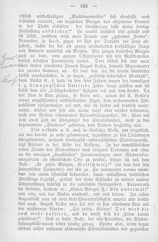 denn Bäcker K.. h hatte in den 30er Jahren wegen der damaligen ſ. g. demagogiſchen Umtriebe Jahre lange geſeſſen und ich ſelbſt kam als„friſchgebackener“ Epigone erſt aus dem Kerker. Da wir Arm in Arm gingen, ſo fielen wir, zudem bei A. Becker's etwas ungeſchlachter wohlbekannter Figur, dem verſammelten Feſt⸗ publikum einigermaßen auf und, wie ich ſpäter erſt deutlich wahr⸗ nahm, wichen mir faſt alle meine mehr oder minder bekannten, mich von Weitem erkennenden Univerſitätsgenoſſen, die, ſchon mit dem einen Fuß im Steigbügel des Staatsdienſtes, meiſt zu den ſogenannten„Strebern“ gehörten, von Weitem ſorgfältig aus. Dies verſuchte u. A. auch in ähnlicher Weiſe, nur vergeblich, ein mir bereits zu nahe gekommener, inzwiſchen zu den Orthodoxen übergetretener, weiland theologiſch⸗rationaliſtiſcher Studiengenoſſe, jetzt Pfarrer in der Nähe der Reſidenz. In der unwillkürlichen erſten Freude des Wiederſehens nach längerer Trennung und ohne au die etwaigen„dienſtlichen“ Inconvenienzen einer Wiedererken⸗ nungsſcene an öffentlichem Orte zu denken, ſtürzte ich mit dem Rufe:„Ei guten Morgen, Weltſchmerz!“(es war das ſein ſtudentiſcher Spitzname) auf ihn zu. So unerwartet coram omni- bus von einem öffentlich bekannten, kaum entlaſſenen politiſchen Sträflinge begrüßt, gerieth der arme Schlucker zu meiner naiven Ueberraſchung ſichtlich in die peinlichſte Verlegenheit. Purpurroth im Geſichte, ſtotterte er:„Guten Morgen F.! Ein andermal!“ und eilte, mir den Rücken wendend, auf und davon. Im erſten Augenblicke war ich über dieſe Characterloſigkeit empört und wollte ihm nach. Auguſt Becker aber fiel mir in den erhobenen Arm mit den nüchternen Worten:„Sei ruhig, Kleiner! Das wird dir noch mehr paſſiren, und du mußt dich bei Zeiten daran gewöhnen!“ Und er hatte Recht, der alte Practikus, die Wieder⸗ holungsfälle waren leider häufig genug. Später aber, wenn ſogar ehedem näher vertraute akademiſche Schmollisbrüder mir gegenüber