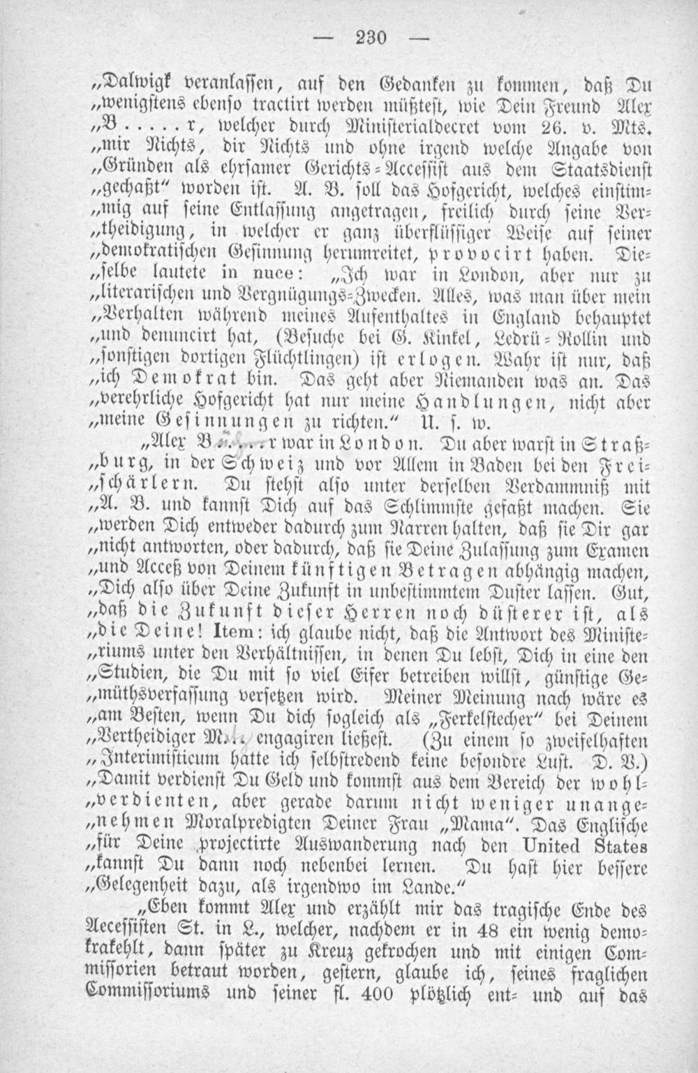 „Alex Baeerwar in London. Du aber warſt in Straß⸗ „burg, in der Schweiz und vor Allem in Baden bei den Frei⸗ ſchärlern. Du ſtehſt alſo unter derſelben Verdammniß mit „A. B. und kannſt Dich auf das Schlimmſte gefaßt machen. Sie „werden Dich entweder dadurch zum Narren halten, daß ſie Dir gar „nicht antworten, oder dadurch, daß ſie Deine Zulaſſung zum Examen „und Acceß von Deinem künftigen Betragen abhängig machen, „Dich alſo über Deine Zukunft in unbeſtimmtem Duſter laſſen. Gut, „daß die Zukunft dieſer Herren noch düſterer iſt, als „die Deinel Item; ich glaube nicht, daß die Antwort des Miniſte⸗ „riums unter den Verhältniſſen, in denen Du lebſt, Dich in eine den „Studien, die Du mit ſo viel Eifer betreiben willſt, günſtige Ge⸗ „müthsverfaſſung verſetzen wird. Meiner Meinung nach wäre es „am Beſten, wenn Du dich ſogleich als„Ferkelſtecher“ bei Deinem „Vertheidiger Mete engagiren ließeſt.(Zu einem ſo zweifelhaften „Interimiſtieum hatte ich ſelbſtredend keine beſondre Luſt. D. P.) „Damit verdienſt Du Geld und kommſt aus dem Bereich der wohl— „verdienten, aber gerade darum nicht weniger unange⸗ „nehmen Moralpredigten Deiner Frau„Mama“. Das Engliſche „für Deine projectirte Auswanderung nach den United States „kannſt Du dann noch nebenbei lernen. Du haſt hier beſſere „Gelegenheit dazu, als irgendwo im Lande.“