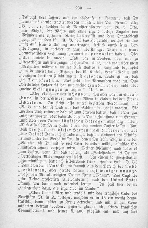 „Dalwigk veranlaſſen, auf den Gedanken zu kommen, daß Du „wenigſtens ebenſo tractirt werden müßteſt, wie Dein Freund Alex „B..... r, welcher durch Miniſterialdecret vom 26. v. Mts. „mir Nichts, dir Nichts und ohne irgend welche Angabe von „Gründen als ehrſamer Gerichts-Acceſſiſt aus dem Staatsdienſt „gechaßt“ worden iſt. A. B. ſoll das Hoſgericht, welches einſtim⸗ „mig auf ſeine Entlaſſung angetragen, freilich durch ſeine Ver⸗ „theidigung, in welcher er ganz überflüſſiger Weiſe auf ſeiner „demokratiſchen Geſinnung herumreitet, provocirt haben. Die⸗ „ſelbe lautete in nuce:„Ich war in London, aber nur zu „literariſchen und Vergnügungs⸗Zwecken. Alles, was man über mein „Verhalten während meines Aufenthaltes in England behauptet „und denuncirt hat,(Beſuche bei G. Kinkel, Ledrü-Rollin und „ſonſtigen dortigen Flüchtlingen) iſt erlogen. Wahr iſt nur, daß „ich Demokrat bin. Das geht aber Niemanden was an. Das „verehrliche Hofgericht hat nur meine Handlungen, nicht aber „meine Geſinnungen zu richten.“ U. ſ. w.
