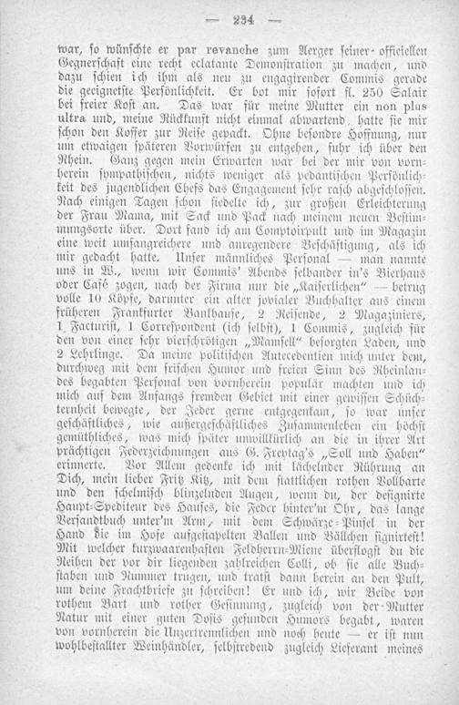 war, ſo wünſchte er par revanche zum Aerger ſeiner officiellen Gegnerſchaft eine recht eclatante Demonſtration zu machen, und dazu ſchien ich ihm als neu zu engagirender Commis gerade die geeignetſte Perſönlichkeit. Er bot mir ſofort fl. 250 Salair bei freier Koſt an. Das war für meine Mutter ein non plus ultra und, meine Rückkunft nicht einmal abwartend, hatte ſie mir ſchon den Koffer zur Reiſe gepackt. Ohne beſondre Hoffnung, nur um etwaigen ſpäteren Vorwürfen zu entgehen, fuhr ich über den Rhein. Ganz gegen mein Erwarten war bei der mir von vorn⸗ herein ſympathiſchen, nichts weniger als pedantiſchen Perſönlich⸗ keit des jugendlichen Chefs das Engagement ſehr raſch abgeſchloſſen. Nach einigen Tagen ſchon ſiedelte ich, zur großen Erleichterung der Frau Mama, mit Sack und Pack nach meinem neuen Beſtim⸗ mungsorte über. Dort fand ich am Comptoirpult und im Magazin eine weit umfangreichere und anregendere Beſchäftigung, als ich mir gedacht hatte. Unſer männliches Perſonal— man nannte uns in W., wenn wir Commis' Abends ſelbander in's Bierhaus oder Café zogen, nach der Firma nur die„Kaiſerlichen“— betrug volle 10 Köpfe, darunter ein alter jovialer Buchhalter aus einem früheren Frankfurter Bankhauſe, 2 Reiſende, 2 Magaziniers, 1. Facturiſt, 1 Correſpondent(ich ſelbſt), 1 Commis, zugleich für den von einer ſehr vierſchrötigen„Mamſell“ beſorgten Laden, und 2 Lehrlinge. Da meine politiſchen Antecedentien mich unter dem, durchweg mit dem friſchen Humor und freien Sinn des Rheinlan⸗ des begabten Perſonal von vornherein populär machten und ich mich auf dem Anfangs fremden Gebiet mit einer gewiſſen Schüch⸗ ternheit bewegte, der Jeder gerne entgegenkam, ſo war unſer geſchäftliches, wie außergeſchäftliches Zuſammenleben ein höchſt gemüthliches, was mich ſpäter unwillkürlich an die in ihrer Art prächtigen Federzeichnungen aus G. Freytag's„Soll und Haben“ erinnerte. Vor Allem gedenke ich mit lächelnder Rührung an Dich, mein lieber Fritz Kitz, mit dem ſtattlichen rothen Vollbarte und den ſchelmiſch blinzelnden Augen, wenn du, der deſignirte Haupt⸗Spediteur des Hauſes, die Feder hinter'm Ohr, das lange Verſandtbuch unter'm Arm, mit dem Schwärze⸗Pinſel in der Hand die im Hofe aufgeſtapelten Ballen und Bällchen ſignirteſt! Mit welcher kurzwaarenhaften Feldherrn⸗Miene überflogſt du die Reihen der vor dir liegenden zahlreichen Colli, ob ſie alle Buch⸗ ſtaben und Nummer trugen, und tratſt dann herein an den Pult, um deine Frachtbriefe zu ſchreiben! Er und ich, wir Beide von rothem Bart und rother Geſinnung, zugleich von der Mutter Natur mit einer guten Doſis geſunden Humors begabt, waren von vornherein die Unzertrennlichen und noch heute— er iſt nun wohlbeſtallter Weinhändler, ſelbſtredend zugleich Lieferant meines