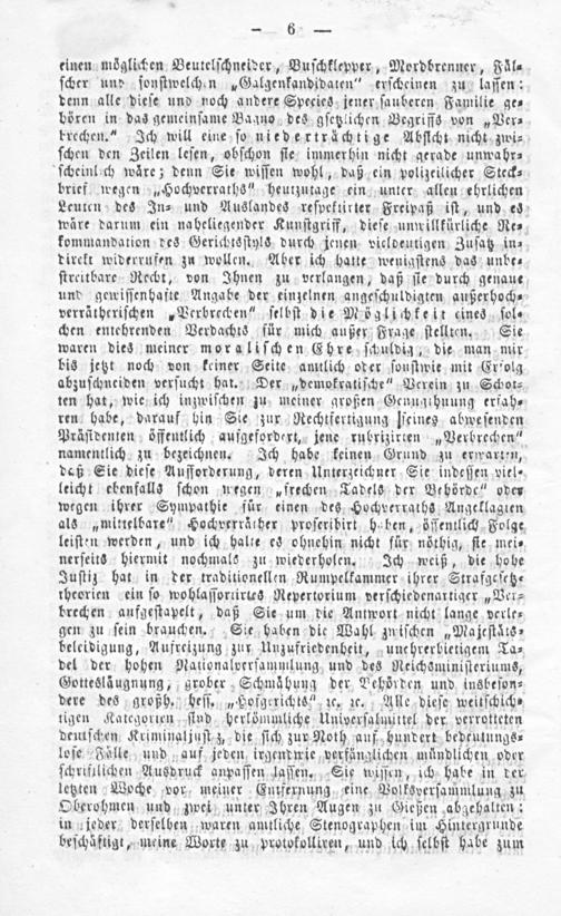 denn alle dieſe und noch andere Species jener ſauberen Familie ge⸗ bören in das gemeinſame Bagno des gſetzlichen Begriffs von„Ver⸗ krechen.“ Ich will eine ſo niederträchtige Abhſicht nicht zwi⸗ ſchen den Zeilen leſen, obſchon ſie immerhin nicht gerade unwahr⸗ ſcheinlich wäre; denn Sie wiſſen wohl, daß ein polizeilicher Steck⸗ brief wegen„Hochverraths“ heutzutage ein unter allen ehrlichen Leuten des In⸗ und Auslandes reſpektirter Freipaß iſt, und es wäre darum ein naheliegender Kunſtgriff, dieſe unwillkürliche Re⸗ kommandation des Gerichtsſtyls durch jenen vieldeutigen Zuſatz in⸗ direkt widerrufen zu wollen. Aber ich hatte wenigſtens das unbe⸗ ſtreitbare Recht, von Ihnen zu verlangen, daß ſie durch genaue und gewiſſenhafte Angabe der einzelnen angeſchuldigten außerhoch⸗ verrätheriſchen„Verbrechen“ ſelbſt die Möglichkeit eines ſol⸗ chen entehrenden Verdachts für mich außer Frage ſtellten. Sie waren dies meiner moraliſchen Ehre ſchuldig, die man mir bis jetzt noch von keiner Seite amtlich oder ſonſtwie mit Erfolg abzuſchneiden verſucht hat. Der„demokratiſche“ Verein zu Schot⸗ ten hat, wie ich inzwiſchen zu meiner großen Genugthuung erfah⸗ ren habe, darauf hin Sie zur Rechtfertigung lieines abweſenden Präſidenten öffentlich aufgefordert, jene rubrizirten„Verbrechen“ namentlich zu bezeichnen. Ich habe keinen Grund zu erwarten, daß Sie dieſe Aufforderung, deren Unterzeichner Sie indeſſen viel⸗ leicht ebenfalls ſchon wegen„frechen Tadels der Behörde“ oder wegen ihrer Sympathie für einen des Hochverraths Angeklagten als„mittelbare“ Hochverräther proſeribirt haben, öſſentlich Folge leiſten werden, und ich halte es ohnehin nicht für nöthig, ſte mei⸗ nerſeits hiermit nochmals zu wiederholen. Ich weiß, die hohe Juſtiz hat in der traditionellen Rumpelkammer ihrer Strafgeſetz⸗ theorien ein ſo wohlaſſortirtes Repertorium verſchiedenartiger„Ver⸗ brechen aufgeſtapelt, daß Sie um die Antwort nicht lange verle⸗ gen zu ſein brauchen. Sie haben die Wahl zwiſchen„Majeſtäts⸗ beleidigung, Aufreizung zur Unzufriedenheit, unehrerbietigem Ta⸗ del der hohen Nationalverſammlung und des Reichsminiſteriums, Gottesläugnung, grober Schmähung der Behörden und insbeſon⸗ dere des großh. heſſ.„Hofgerichtsn zꝛc. zꝛc. Alle dieſe weitſchich⸗ tigen Kategorien ſind herlömmliche Univerſalmüttel der verrotteten deutſchen Kriminaljuſt z, die ſich zur Noth auf hundert bedeutungs⸗ loſe Fäͤlle und auf jeden irgendwie verfänglichen mündlichen oder ſchrifilichen Ausdruck anpaſſen laſſen, Sie wiſſen, ich habe in der letzten Woche vor, meiner Entfernung eine Volksverſammlung zu Oberohmen und zwei unter Ihren Augen zu Gießen abgehalten: in jeder derſelben waren amtliche Stenographen im Hintergrunde beſchäftigt, meine Worte zu protokollixen, und ich ſelbſt habe zum