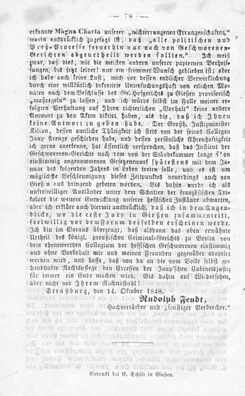 erkannte Magna Charta unſerer„nichterrungenen Errungenſchaften,“ worin ausdrücklich zugeſagt iſt, daß galle politiſchen und Preß⸗Proceſſe fernerhin nur noch von Geſchworenen⸗ Gerichten abgeurtheilt werden ſollten.“ Ich weiß zwar, daß dies, wie die meiſten andern unſerer papiernen Verheiſ⸗ ſungen, bis jetzt leider! nur ein frommer Wunſch geblieben iſt; aber ich babe auch keine Luſt, mich vor deſſen endlicher Verwirklichung durch eine willkürlich dekretirte Unterſuchungshaft von etlichen Mo⸗ naten nach dem Beſchluſſe des Gr. Hofgerichts zu Gießen proviſoriſch „maßregeln“ zu laſſen, und ich würde ſelbſt im Falle meiner er⸗ folgten Verhaftung auf Ihren richterlichen„Vorhalt“ keine andere Antwort zu den Akten diktirt haben, als die, daß ich Ihnen keine Antwort zu geben habe. Der Großh. Juſtizminiſter Kilian, deſſen amtliche Thätigkeit ich ſtets von der ſeines Collegen Jaup ſtrenge geſchieden habe, und deſſen perſönliche Ehrenhaftigkeit ich gerne anerkenne, hat öffentlich verſprochen, daß das Inſtitut der Geſchworenen⸗Gerichte nach dem von der Ständekammer lange ſ!on einſtimmig angenommenen Geſetzentwurf ſpäteſtens mit dem Ja⸗ nuar des folgenden Jahres in Leben treten ſolle, und es iſt um möglichſte Beſchleunigung dieſes Zeitpunktes neuerdings auch von Gießen aus dringend gebeten worden. Bis dahin werde ich als unfreiwilliger Ausländer unter dem Schatten der franzöſiſchen Tri⸗ kolore die weitere Entwicklung unſerer heſſiſchen Zuſtände abwarten, aber ich erkläre auch hiermit ausdrücklich, daß ich in dem Augen⸗ vlicke, wo die erſte Jury in Gießen zuſammentritt, freiwillig vor demForum derſelben erſcheinen werde. Ich bin im Voraus überzeugt, daß alsdann das oben erwähnte Urtheil des königl. preußiſchen Criminal⸗Gerichts zu Berlin von dem ehrenwerthen Collegium der heſſiſchen Geſchworenen einſtimmig und ohne Vorbehalt mir und meinen Freunden gegenüber adoptirt werden wird, und hoffe, daß von da an die vom Volke ſelbſt ge⸗ handhabte Rechtspflege den Exrceſſen der Jaup'ſchen Cabinetsjuſtiz für immer ein Ende machen wird. Bis dahin auf Wißderſehen, aber nicht vor Ihrem Richterſtuhl! Straßburg, den 14. Oktober 1848. 1 Rudolph Fendt,