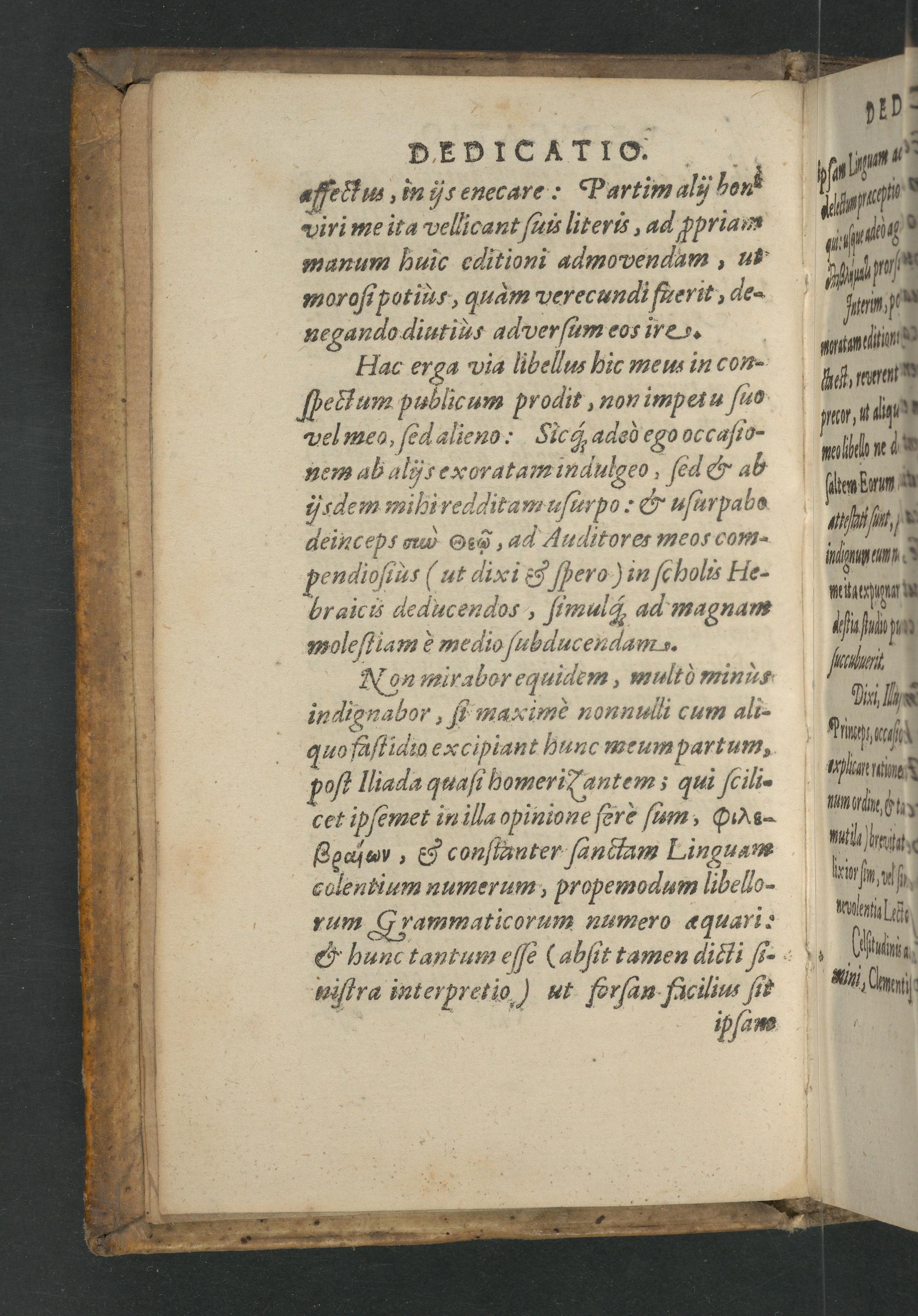 PD.E DICATIO0. pfeëtus, in ijs enecare. Partim ali; Honi viri me ita vellicant ſau literis, ad ꝓpriau manum huic editioni admovendam, ut moroſi potius, quam verecundi ſerit, de- negando diutius ad verſum eor ire. Hac eręa via libellus hic meus in con- edtum publicum prodit non impetu ſuo vel meo, ſed alieno. Sico; adoòd ego occaſio- nem ab alijs evoratam indulgeo ſéd& a5 ijrde m mihi reddita muſätrpo& uſu vpabo deinc eps s, ad Auditores meos com- pendioſiur(ut dixi& ſpero) in ſcholis He- braicus deducendos, ſimulq; ad magnam moleſtiam? medio ſubducendame. Non mirabor equidem, multò minus indienabor ſi maxime nonnulli cum ali- uo faſtidin excipiant hunc meum partum, poſt lliada quaſi homeriantem qui ſcili- cet ipſemet in illa opinione ſerè ſum, Ous- Sᷣαν, conſiuuter ſanctam Linguam colentium numerum, propemodum libello- rum& rammaticorum numero æquari-