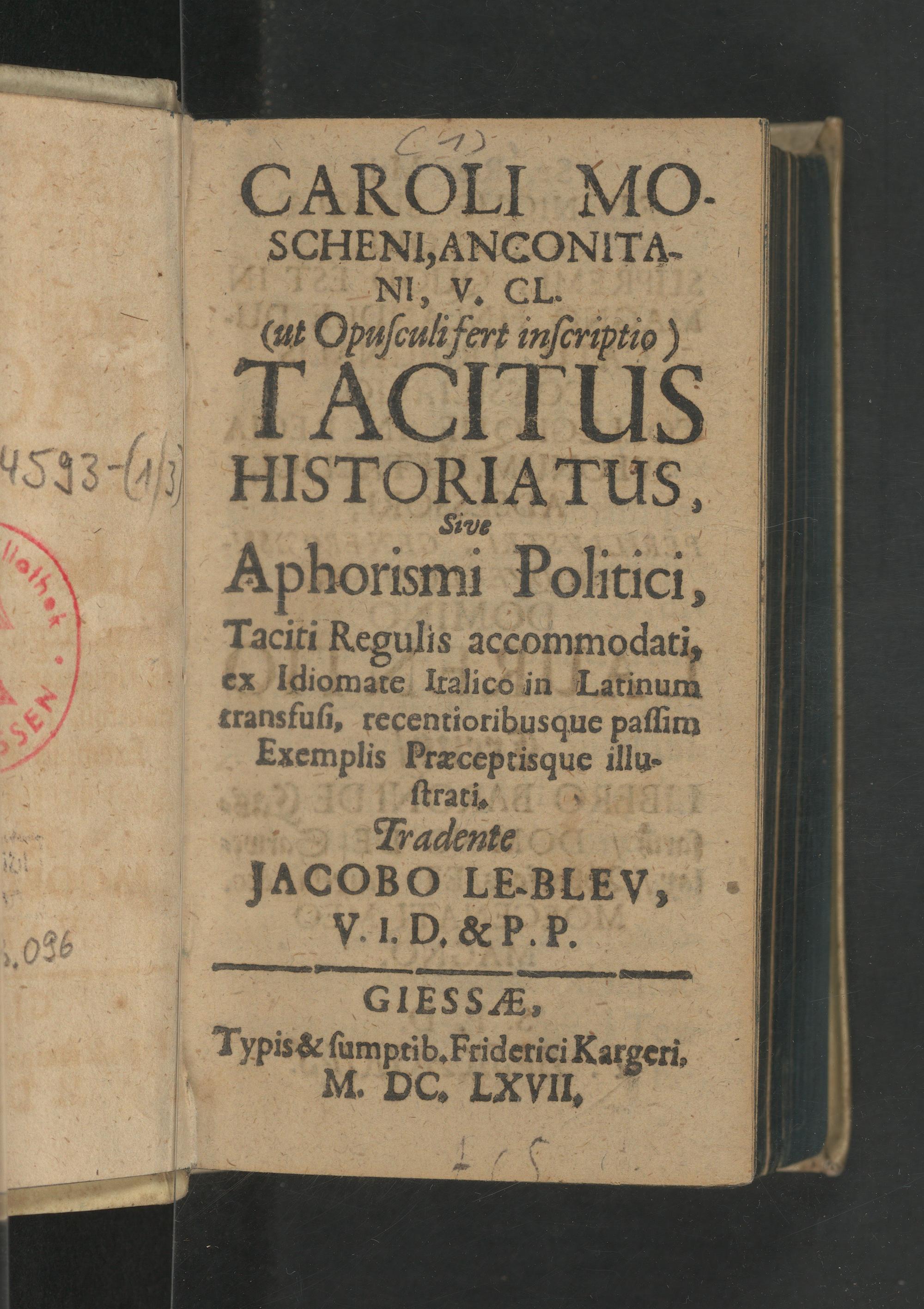 HISTORIATUsS. 1.. Aphorismi Politici, Taciti Regulis accommodati, ex ldiomate Italico in Latinum transfuſi, recentioribusque paſſim Exemplis Præceprisque illu- ſtrati. Tradente JACOBO LEBLEV;. V. I1. D.& P. P. GIESSF