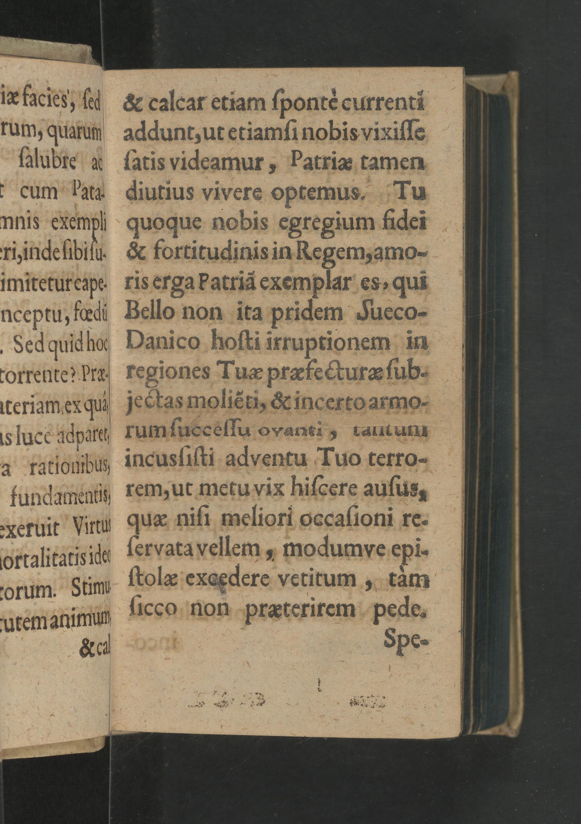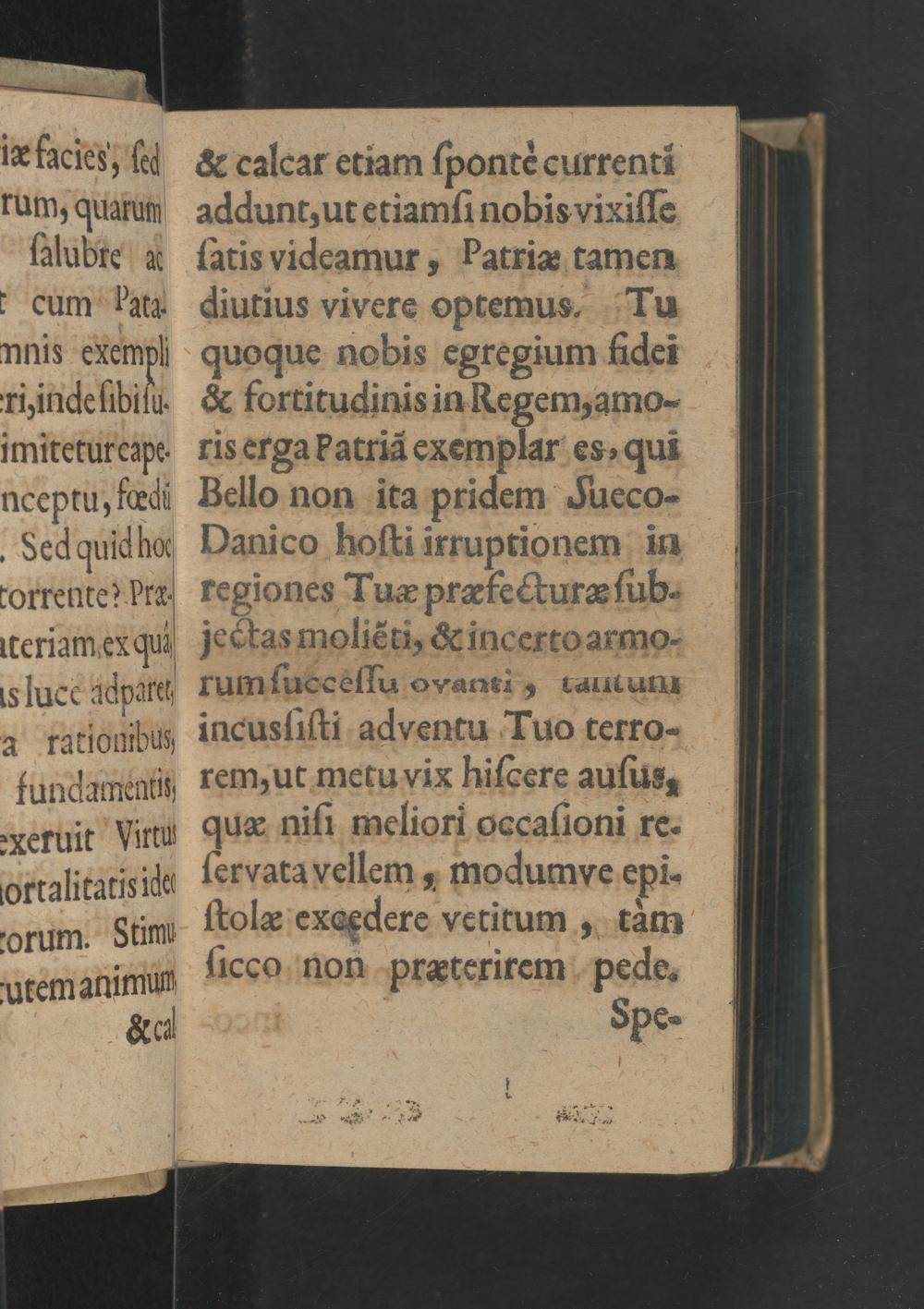 & calear etiam ſpontè currenti addunt, ut etiamſi nobis vixiſſe ſatis videamur, Patriæ tamen diutius vivere optemus, Tu quoque nobis egregium fidei & fortitudinis in Regem, amo- ris erga Patriã exemplar es, quĩ Bello non ita pridem JSueco- Danico hoſti irruptionem in regiones Tuæ præfecturæ ſub. jectas moliẽti,& incerto armo- rum ſuecèſſu ovanti 5 111 uIII incusſiſti adventu Tuo terro- rem, ut metuvix hiſcere auſus, quæ niſi meliori oocaſioni re. ſervatavellem, modumye epi- ſtolæ exoędere vetitum, tàm ſicco non præterirem pede.