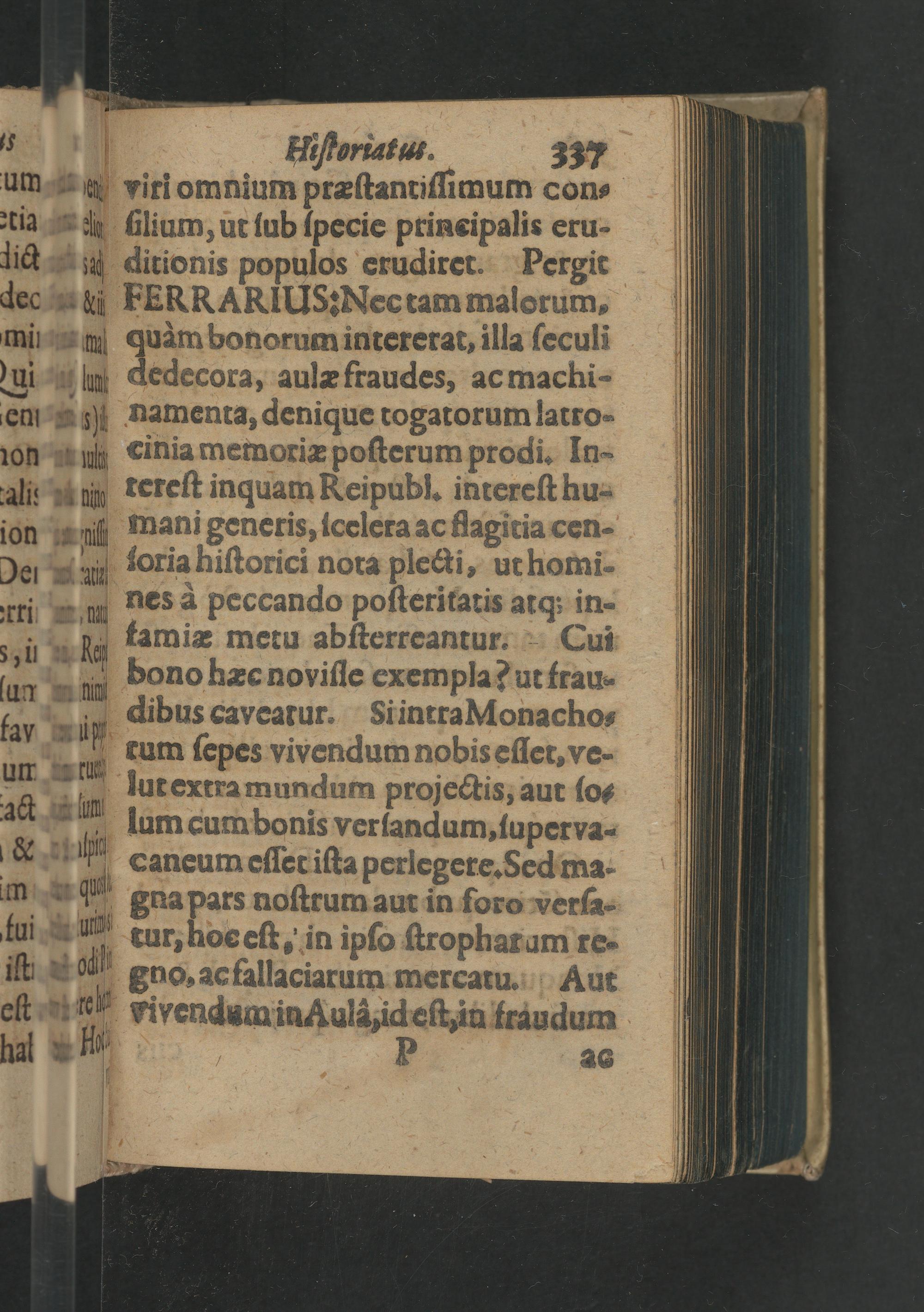 viri omnium præſtantiſſimum con-⸗ a ſilium, ut lub ſpecic prineipalis eru- n ditionis populos erudiret. Pergit i FEERRARIUS:Nectam malorum, quàm bonorum intererat, illa ſeculi dedecora, aulæ fraudes, ac machi- doſt namenta, denique togatorum latro- cinia memoriæ poſterum prodi. In-