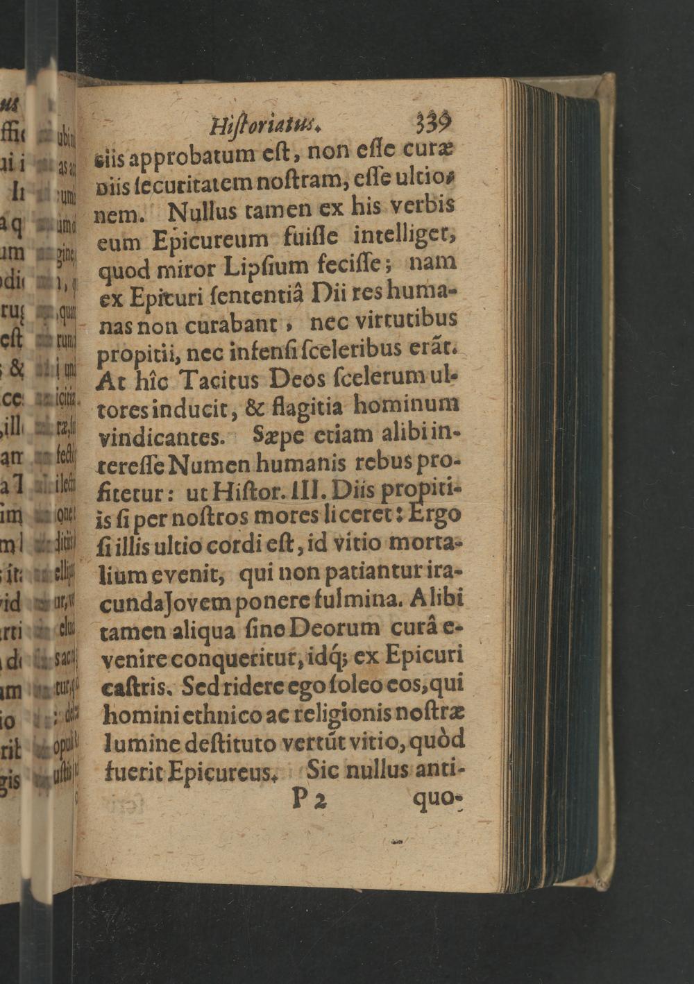eum Epicureum fuiſſe intelliget, quod miror Lipſium feciſſe; nam ex Epituri ſententiâ Dii res huma- nas non curabant, nec virtutibus propitii, nec infenſi ſceleribus erãr. At hio Tacitus Deos ſcelerumul- tores inducit,& flagitia hominum vindicantes. Sæpe eriam alibi in- tereſſe Numen humanis rebus pro- fitetur: ut Hiſtor. III. Diis— is ſi per noſtros mores liceret: Ergo ſi illis ultio cordi eſt, id vitio morta- lium evenit, qui non patiantur ira- cundalovem ponere tulmina. Alibi tamen aliqua ſino Deorum curã e. venire conqueritut, idq́; ex Epicuri