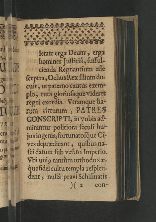 cienda Regnantium eſſe ſceptra, Ochus Rex filium do- cuit, ut paterno cautus exem- plo, tuta glorioſaque videret regni exordia. Vtramque ha- rum virtutum, PATRES CONSCRIPTI, in vobis ad- mirantur politiora ſeculi hu- jus ingenia, fortunatoſque Ci- ves deprædicant, quibus na- ſcĩ datum ſub veſtro Imperio. Vbi uniꝰ tantum orthodoxæ- que fidei cultu templa reſplen- dent, nullà pravi Schiſmatis (2 con