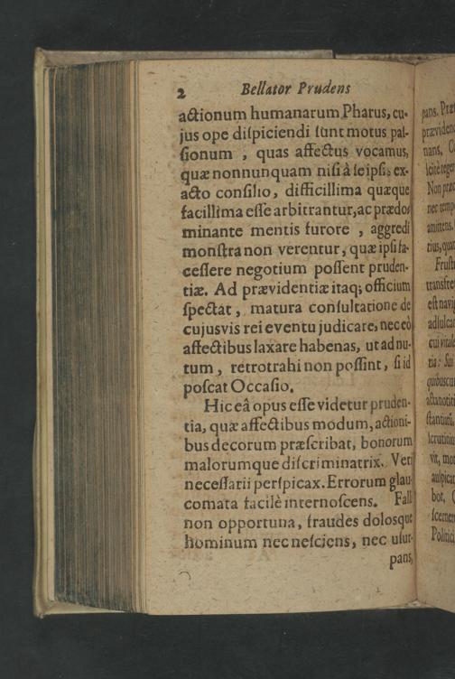 actionum humanarum Pharus, cu. jus ope diſpiciendi ſunt motus pal- ſionum, quas affectus vocamus quæ nonnunquam niſi à le ipſis ex acto conſilio, difficillima quæque facillima eſſe arbitrantur, ac prædo⸗ minante meniis turore, aggrec monſtra non verentur, quæ ipiit ceſſere negotium poſſent pruden. tiæ. Ad prævidentiæ itaq; officium ſpectat, matura conſultationè de cujusvis rei eventu judicare, necco affectibus laxare habenas, ut adnu. tum, retrotrahi non poſſint, ſiid poſcat Occaſio. Hic ea opus eſſe videtur pruden. tia, quæ affectibus modum, actioni- bus decorum præſcribat, bonorum malorum que diſeriminatrix Veii neceſſarii perſpicax. Errorum glau comata facilè internoſcens. Fall non opportuna, traudes dolosqus