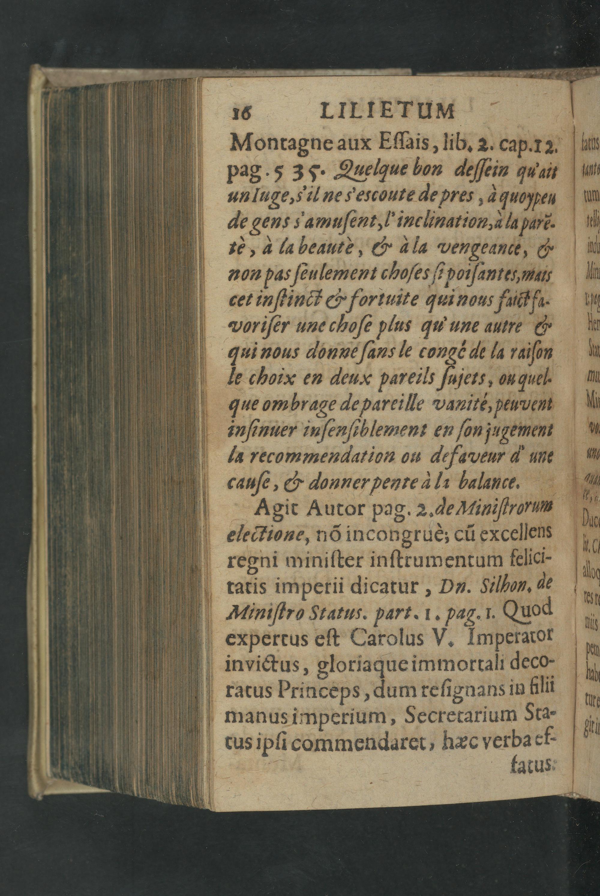 Montagne aux Eſſais, lib. 2. cap. rz. pag. 5 3 5. Quelque bon deſſein quait unluge, s il ne sescoute de pres, à quoypen de genss amuſent,! inelination,d la yart. re, à la beautè,& ala vengeante,& non pas ſeulement choſesſi potſantes mas cet inſtinct& fortuite qui nous fautfa. Voriſer une choſé plus qu une aune& qui nous donne ſans le congè de la raiſon le choix en deux pareils hhe. ou quel. que ombrage de pareille vanité, peuvem inſinuer iuſenſiblement en ſon jugemen: la recommendation ou defaveur d une cauſe,& donner pentedli balanct. Agit Autor pag. 2. de Miniſtrorum electione, nõ incongrus; cũ excellens regni miniſter inſtrumentum felici tatis imperii dicatur, Dn. Silhon, e Miniſtro Status. part. 1. pag. J. duod expertus eſt Carolus V. Imperatot invictus, gloriaque immortali deco- ratus Princeps, dum reſignans in kilii manus imperium, Secretarium Sta- tus ipſi commendaret, hæc ſeth⸗ cf tatus.