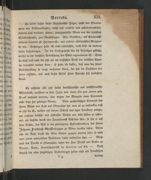 Es erſcheint alſo jetzt dieſes deutſchlettiſche und lettiſchdeutſche Woͤrterbuch, nachdem es viele Jahre von einem Ort zum andern zum Diuck verſandt worden, aber wegen des Mangels eines Correctors nicht dazu hat gelangen koͤnnen. Dem großmuͤthigen Entwurfe des Herrn Major von Lau auf Oberpahlen hat man es zu verdanken, daß es jetzt da iſt, welcher auf ſeinem Schloß eine eigne Druckerey anlegte, um nutzbare lettiſche und ehſtniſche Buͤcher ans Licht ſtellen zu laßen: und als dieſelbe durch eine Feuersbrunſt Schaden litte: ſo hat er auf ſeine Koſten, den Reſt in der privilegirten Hofbuchdruckerey des Herrn Johann Friedrich Steffenhagen zu Mitau drucken laßen. Wenn alſo ein Nutze durch die Guͤte Gottes gezogen werden ſolte: ſo wird man jenem patriotiſchen Befoͤrderer dafuͤr verbunden ſeyn.— Waͤh⸗