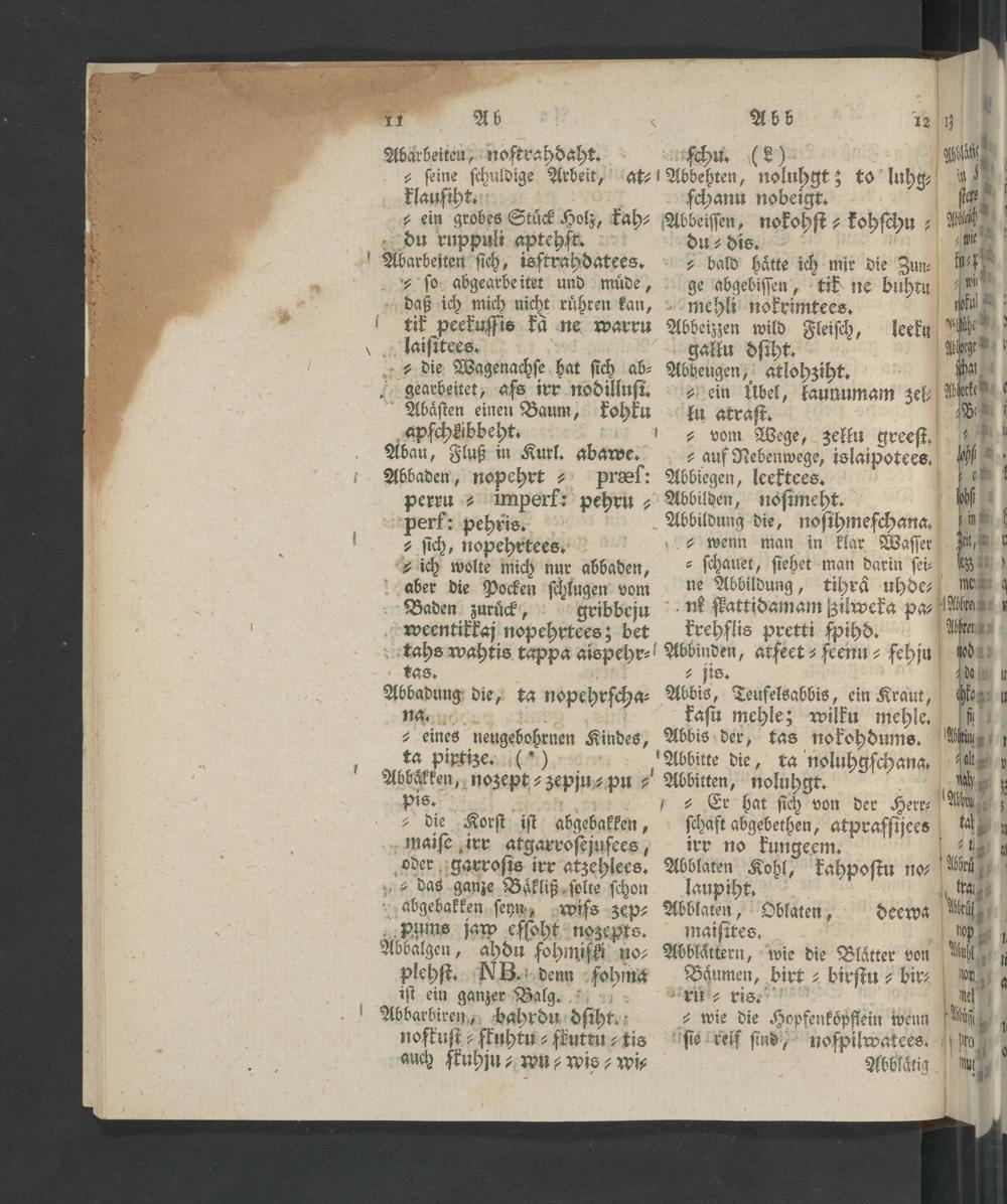 maiſe irr atgarroſejufees, irr no kungeem. oder garroſis irr atzehlees. Abblaten Kohl, kahpoſtu no⸗ das ganze Baͤkliß ſolte ſchon laupiht. abgebakken ſeyn, wiſs zep⸗ Abblaten, Oblaten, deewa pums jaw eſſoht nozepts. maiſites. b Abbalgen, ahdu fohmiſti no⸗ Abblaͤttern, wie die Blaͤtter von plehſt. NB. denn fohma Baͤumen, birt⸗ birſtu⸗ bir⸗ iſt ein ganzer Balg. ru⸗ ris. Abbarbiren, bahrdu dſiht. ²2 wie die Heopfenkoͤpflein wenn
