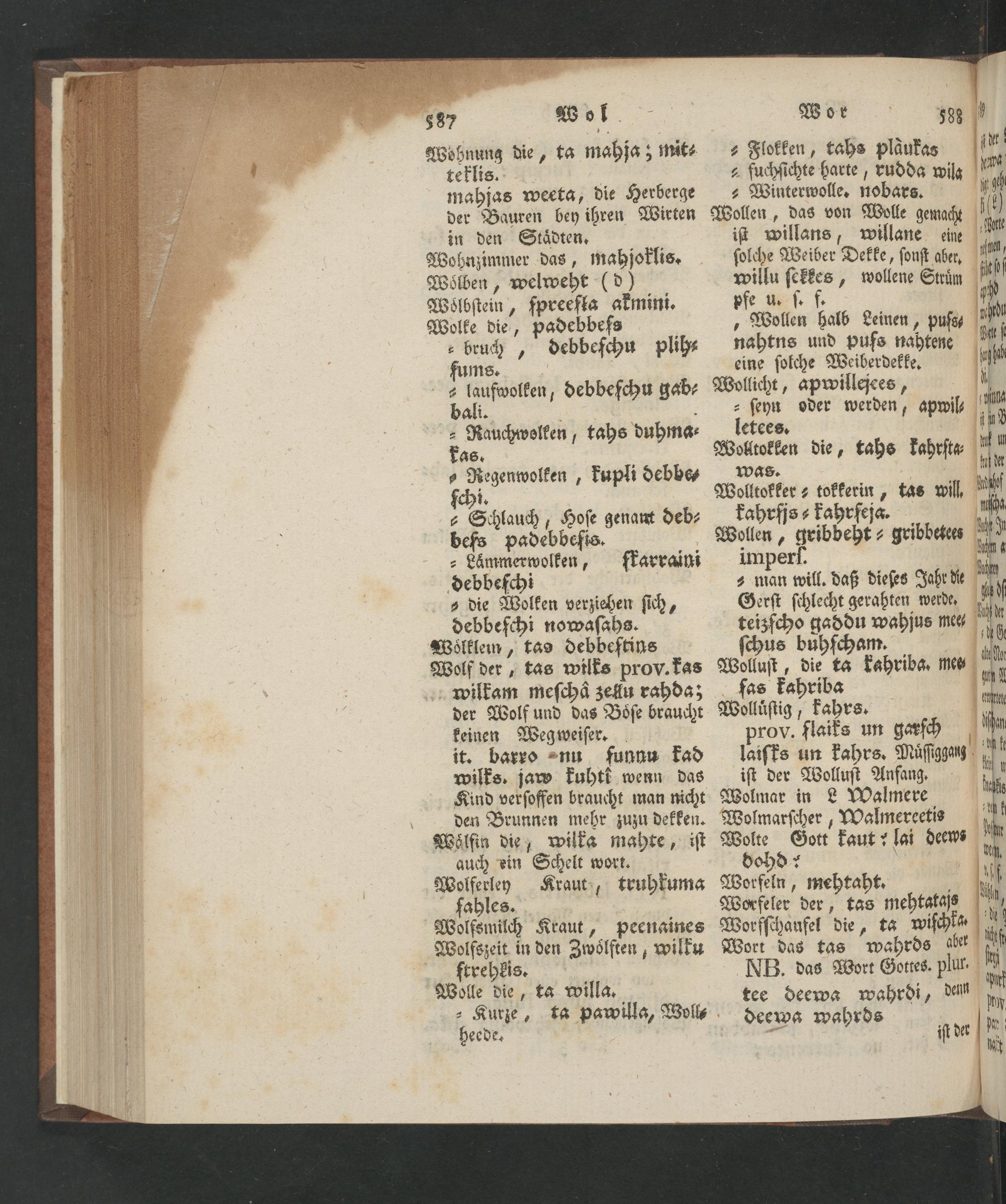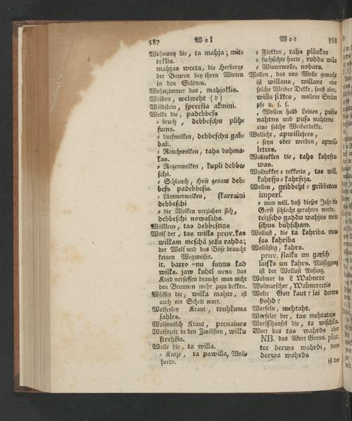 Wohnung die, ta mahja; mit⸗ ⸗ Flokken, tahs plaͤukas teklis. b ²z ſuchſichte harte, rudda wiſg mahjas weeta, die Herberge 2 Winterwolle. nobars. der Bauren bey ihren Wirten Wollen, das von Wolle gemacht in den Staͤdten. iſt willans, willane eine