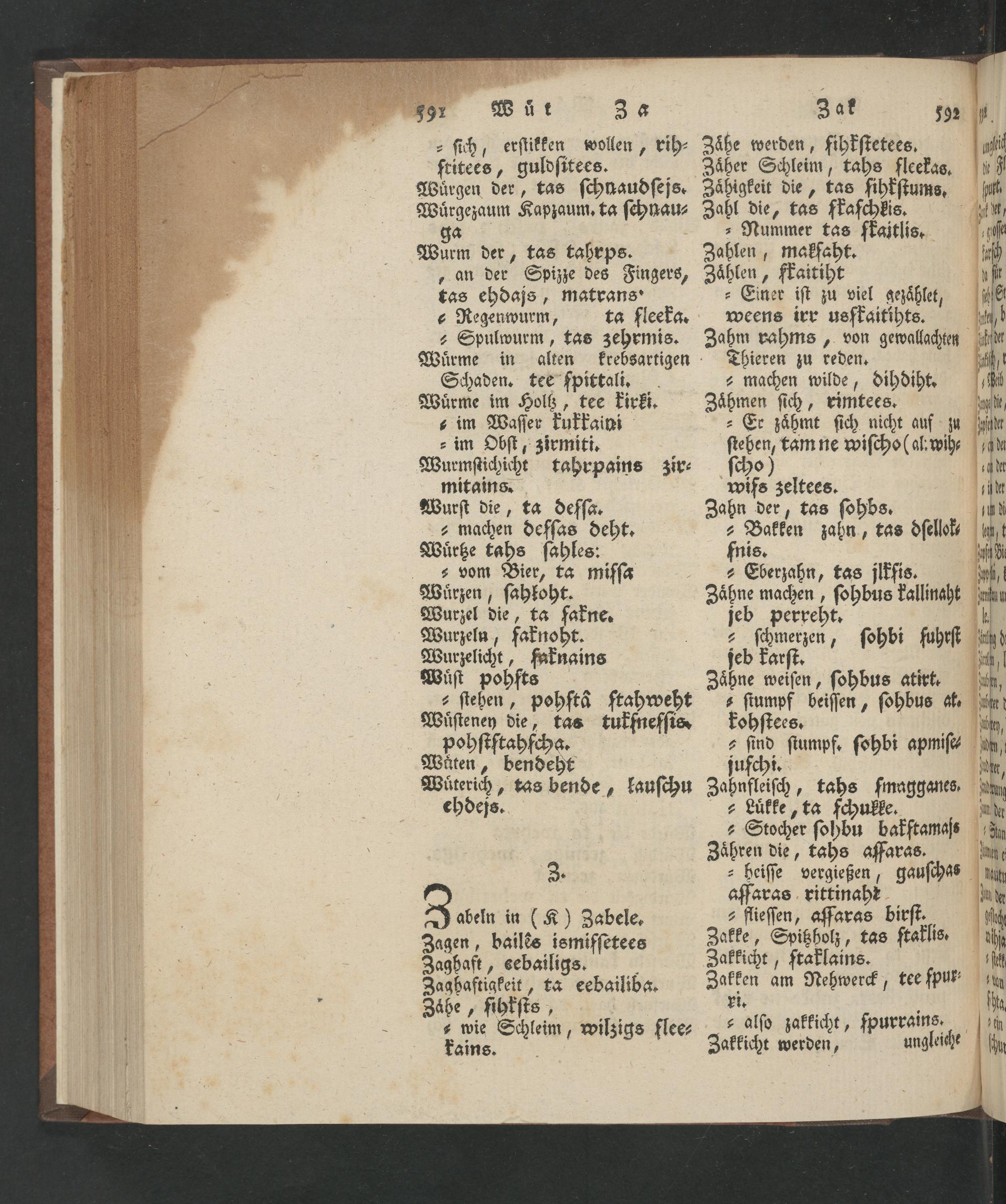 - Er zaͤhmt ſich nicht auf zu ſteben, tam ne wiſcho(al wih⸗ ſcho) wiſs zeltees. Zahn der, tas ſohbs. ⸗² Bakken zahn, tas dſellok⸗ fnis. b ² Eberzahn, tas jlkfis. Zaͤhne machen, ſohbus kallinaht jeb perreht. - ſchmerzen, ſohbi fuhrſt jeb karſt. Zaͤhne weiſen, ſohbus atirt. z ſtumpf beiſſen, ſohbus at⸗ kohſtees. z ſind ſtumpf. ſohbi apmiſe⸗ jufchi. Zahnfleiſch, tahs ſmagganes. Luͤkke, ta ſchukle. ² Stocher ſohbu bakſtamaſs Zaͤhren die, tahs aſfaras. „heiſſe vergießen, gauſchas affaras rittinaht b ² flieſſen, aſſaras birſt. Zakke, Spitzholz, tas ſtaklis. Zakkicht, ftaklains. Zakken am Nehwerck, tee ſpur⸗ ri. ² alſo zakkicht, ſpurrains. Zakkicht werden, ungleiche